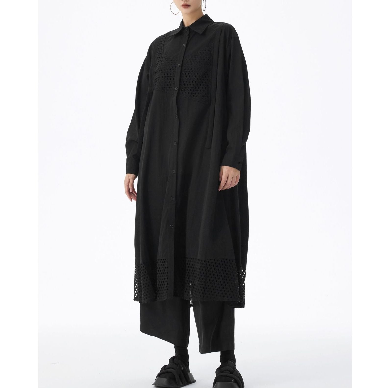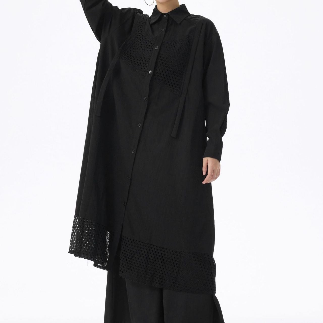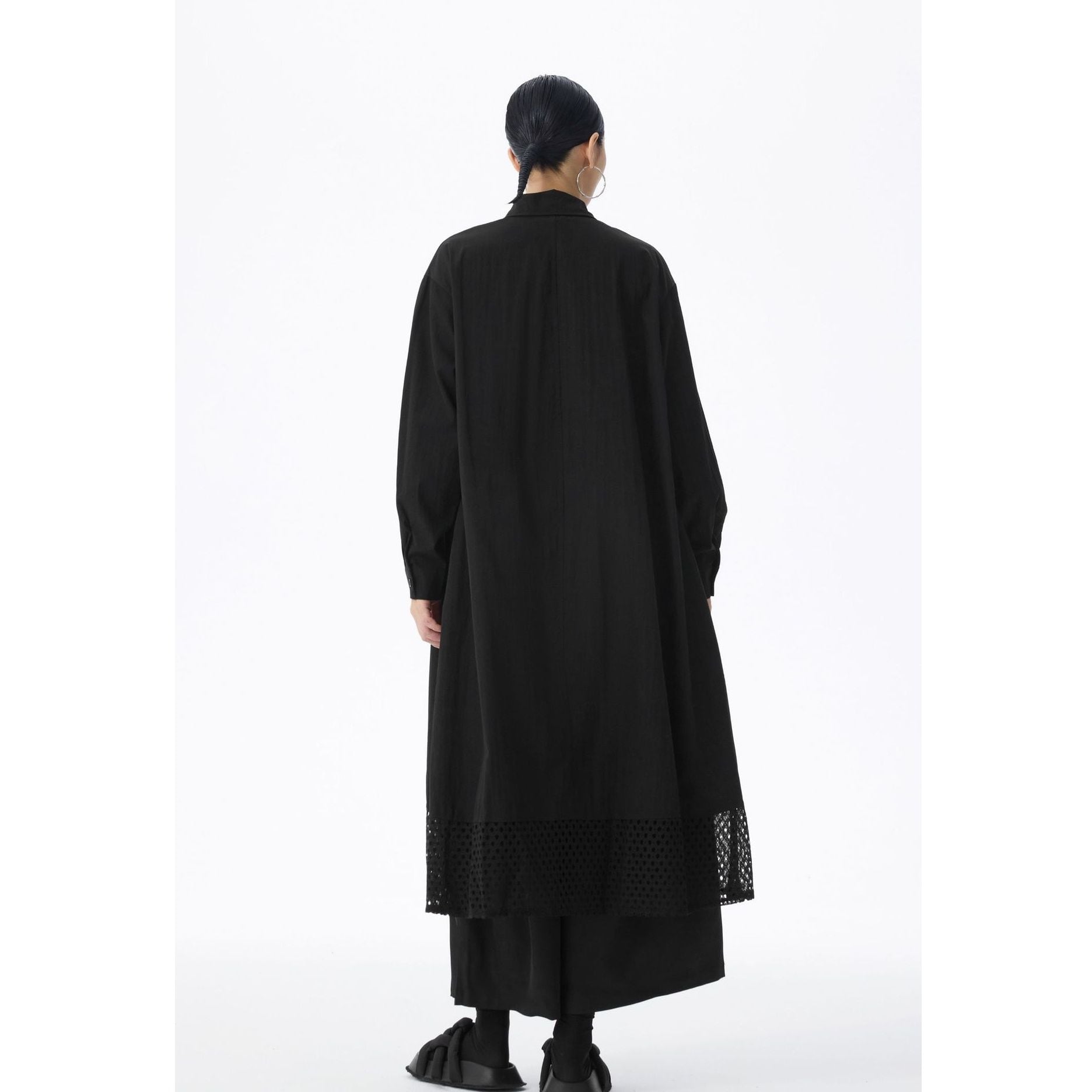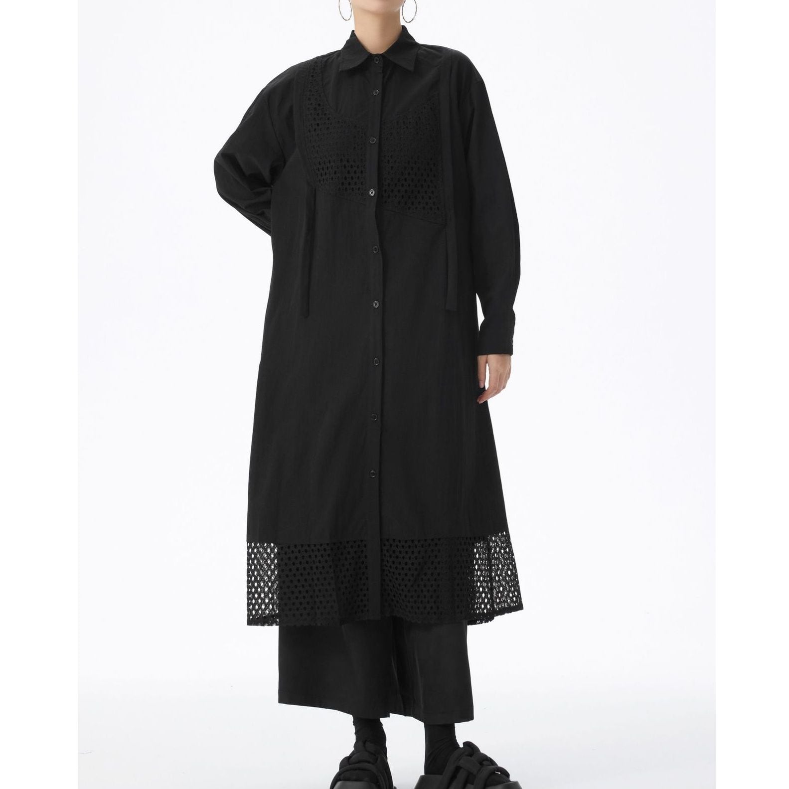 メッシュ素材のスティッチがアクセントになった、ポロ襟・長袖・ミドル丈のシャツワンピースです。ブラックの単色で羽織りものとしても使える、ゆったりとしたシルエットのアイテムです。