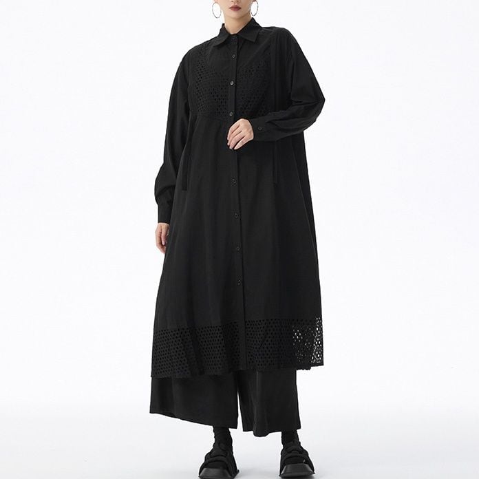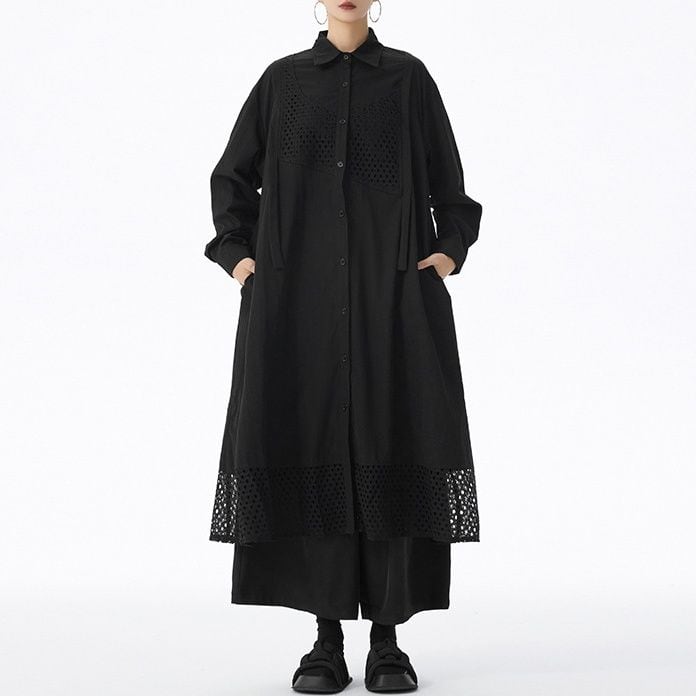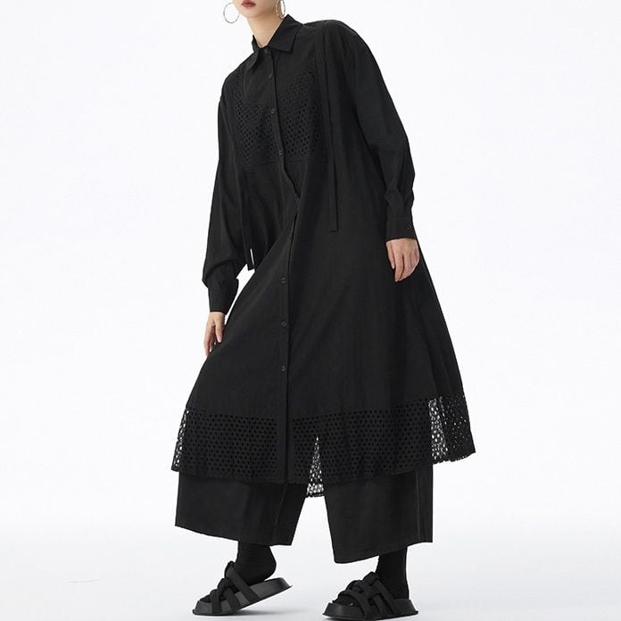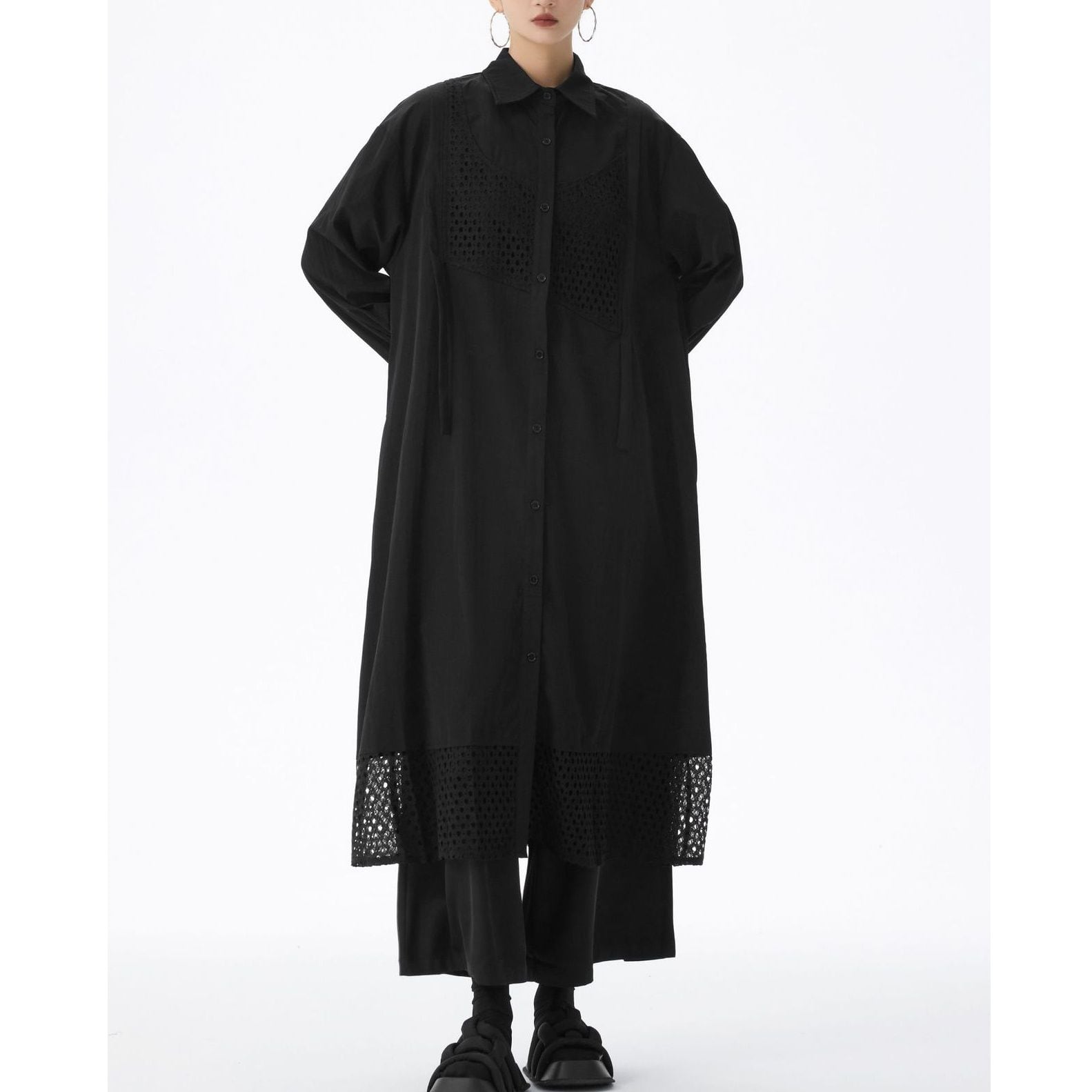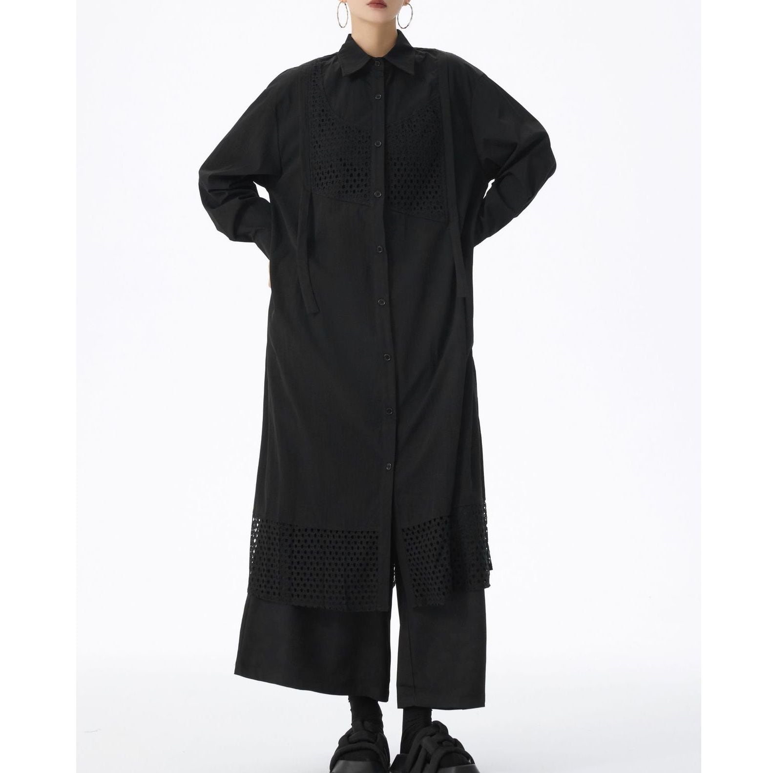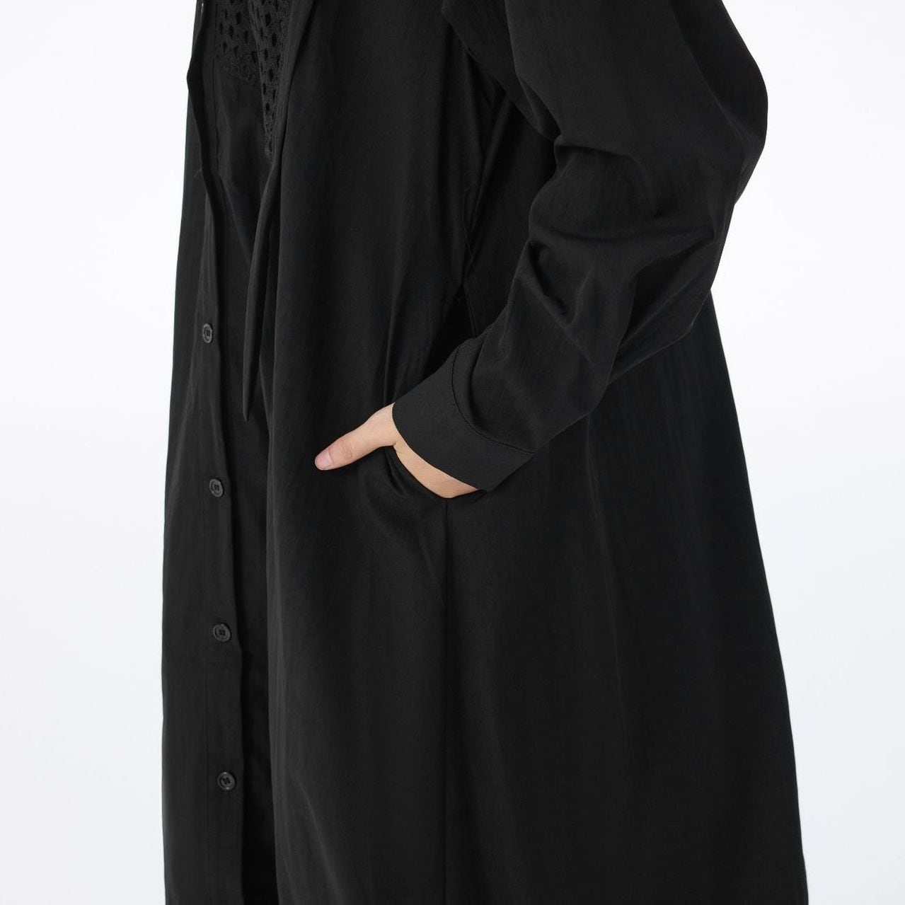 メッシュ素材のスティッチがアクセントになった、ポロ襟・長袖・ミドル丈のシャツワンピースです。ブラックの単色で羽織りものとしても使える、ゆったりとしたシルエットのアイテムです。