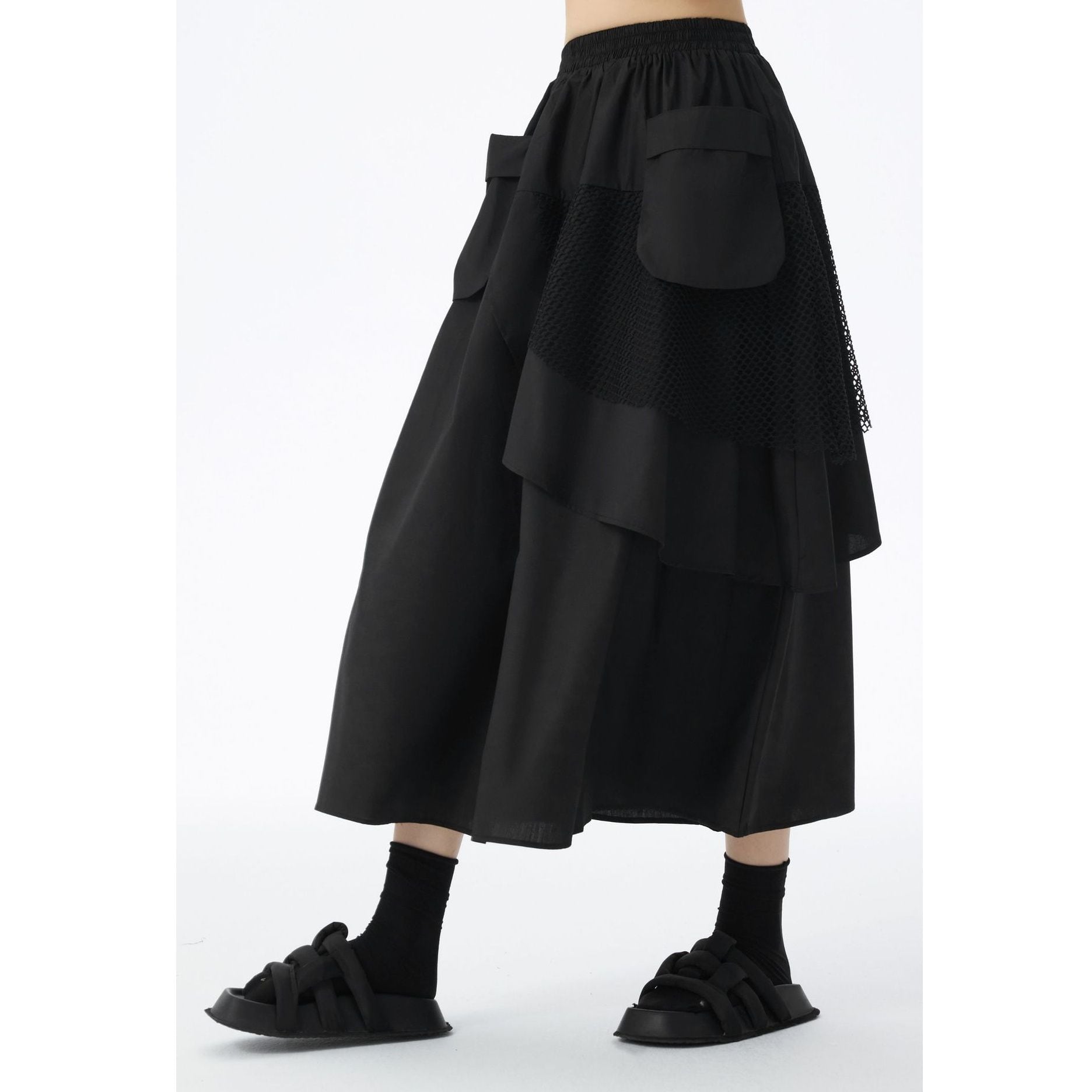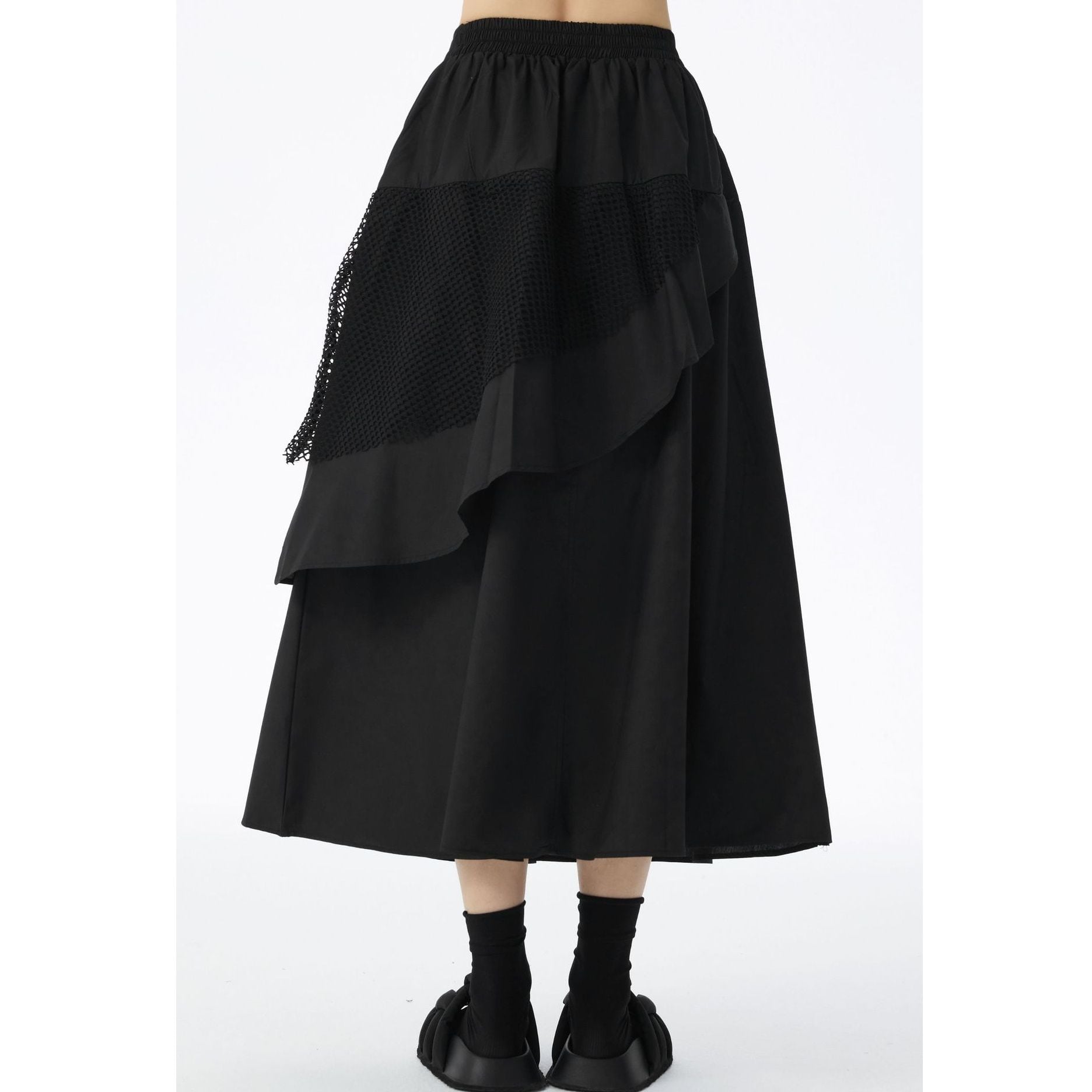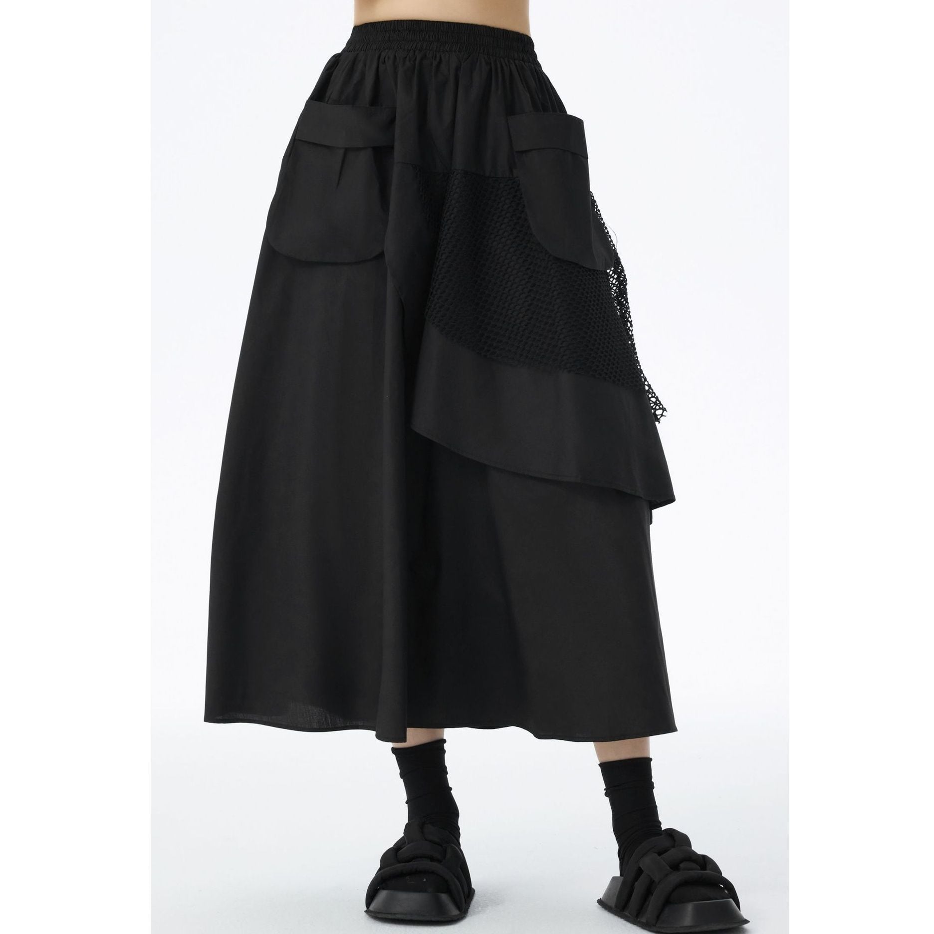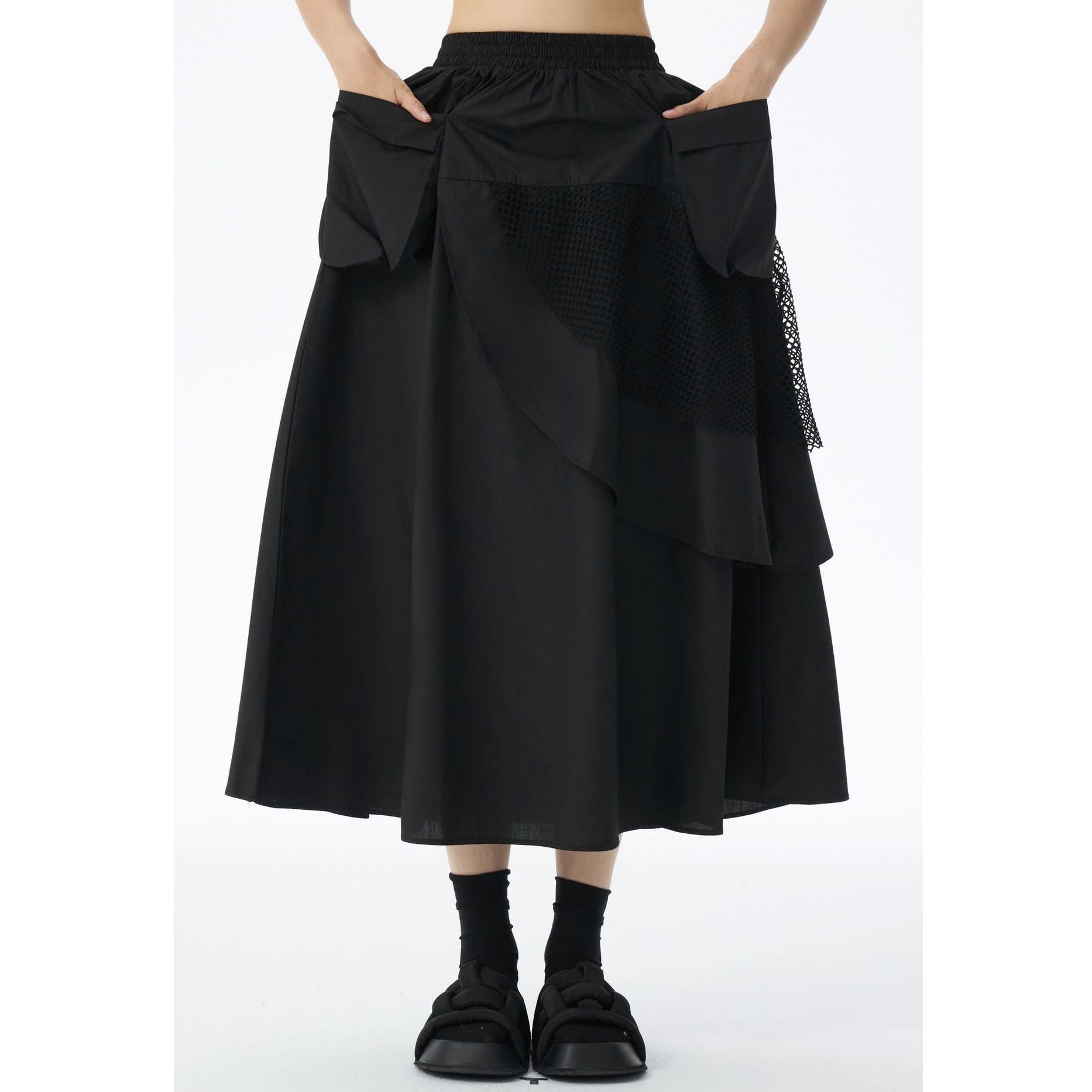 MESH STITCHED FLAP A-LINE MIDI DESIGN SKIRT 2colors M-15141