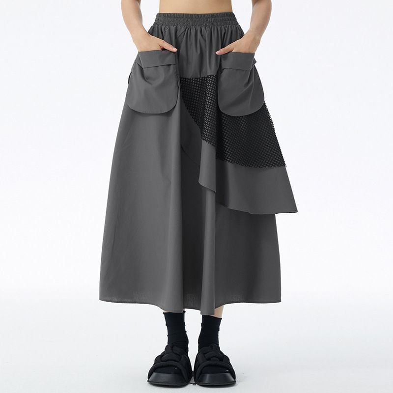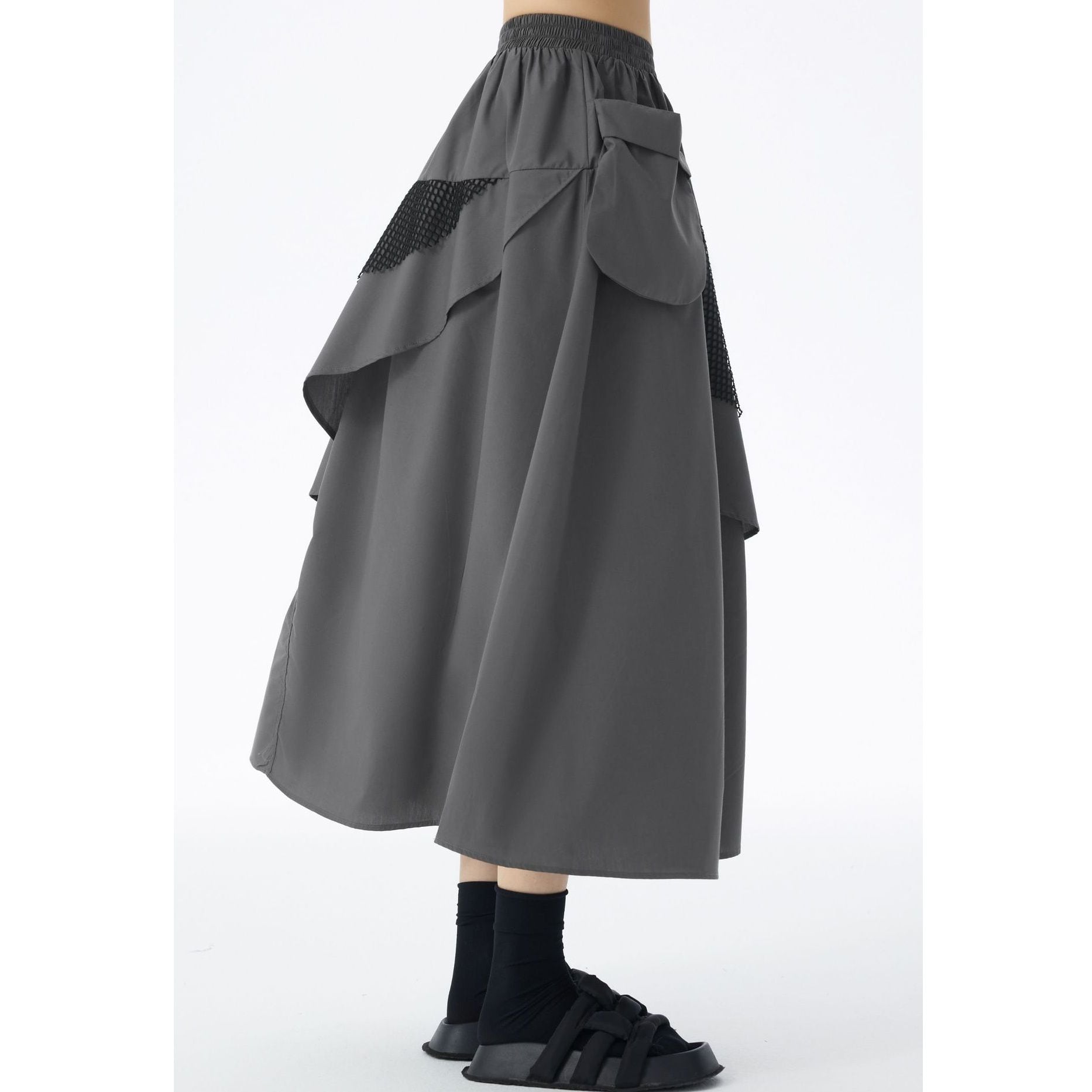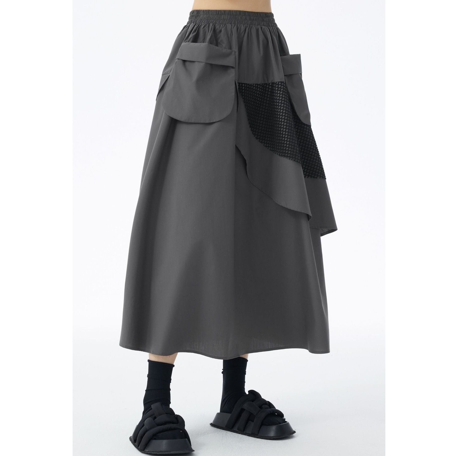 メッシュのスティッチが付いた斜めのフラップやデザインポケットがお洒落な、Aライン・ミドル丈のスカートです。ウエストはゴムなので、着脱が簡単で履き心地が良いです。落ち着いた色味で合わせやすい、コーディネートのアクセントになるカジュアルアイテムです。ブラックとグレーの2色から選べます。