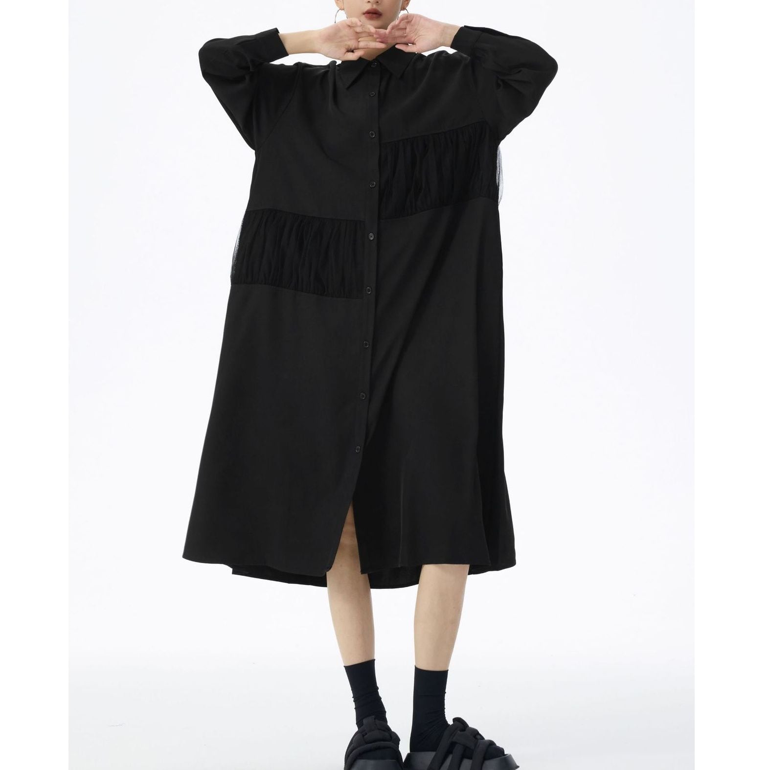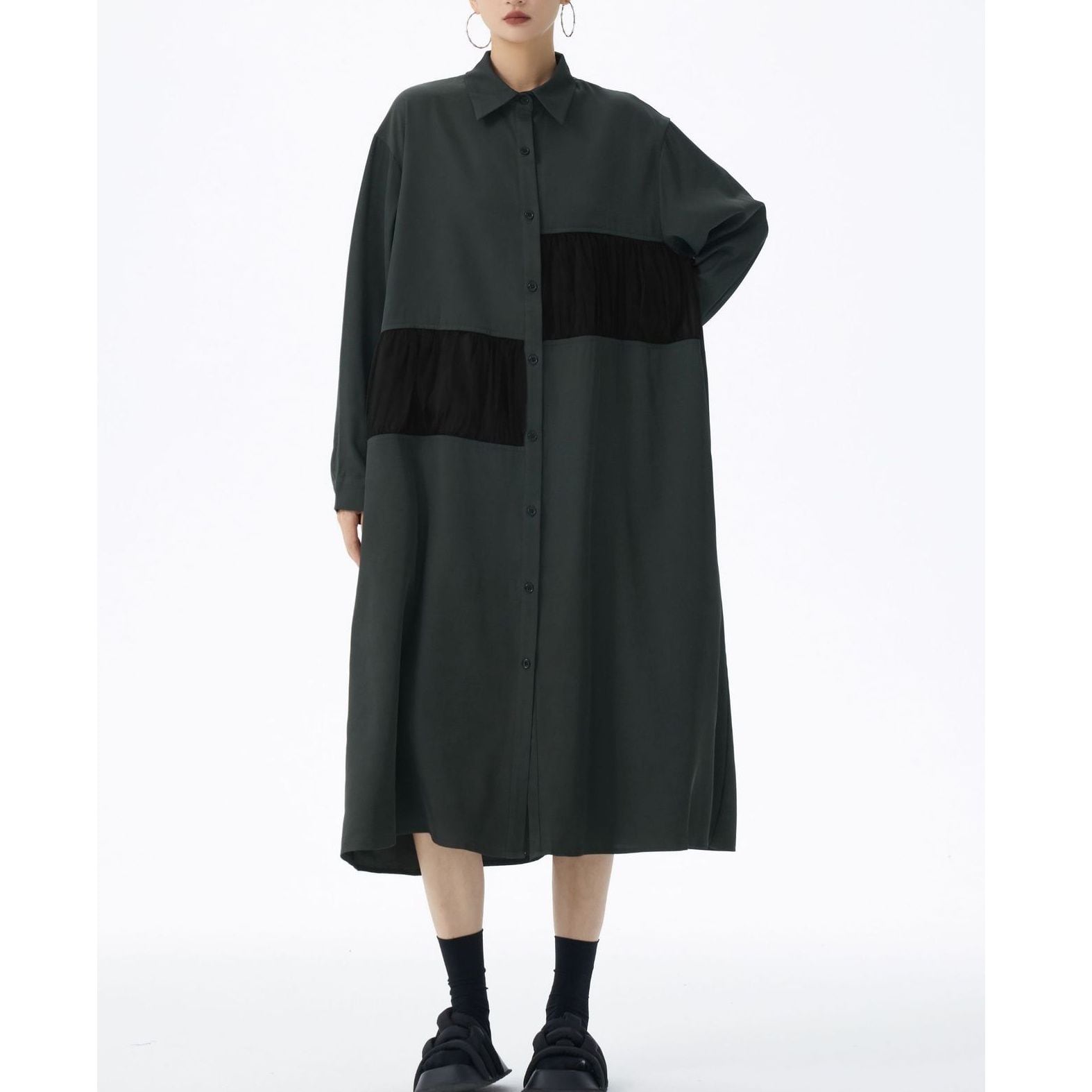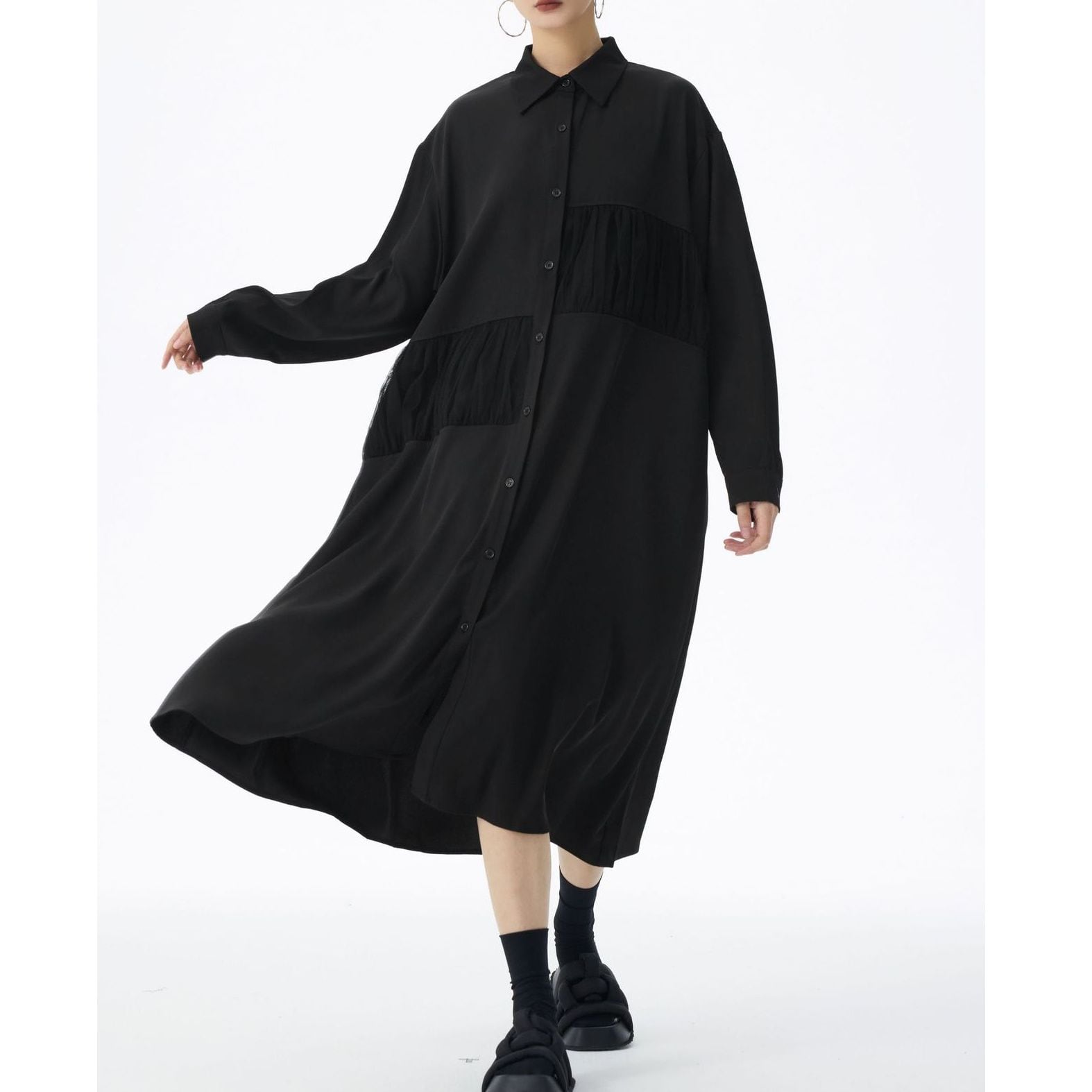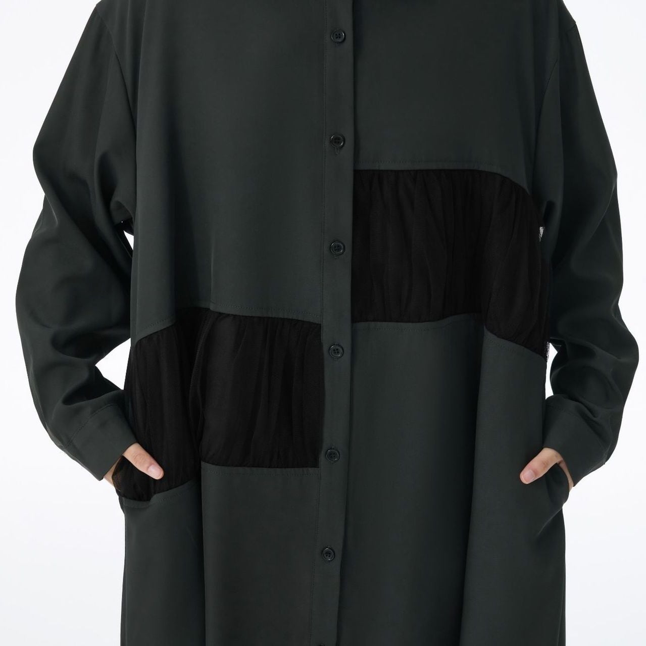 アシンメトリックにあしらわれた細かなメッシュ素材のスティッチがアクセントになった、ポロ襟・長袖・ミドル丈のシャツワンピースです。落ち着いた色味とゆったりとしたシルエットで、羽織りものとしても使えるカジュアルアイテムです。色は2色から選べます。