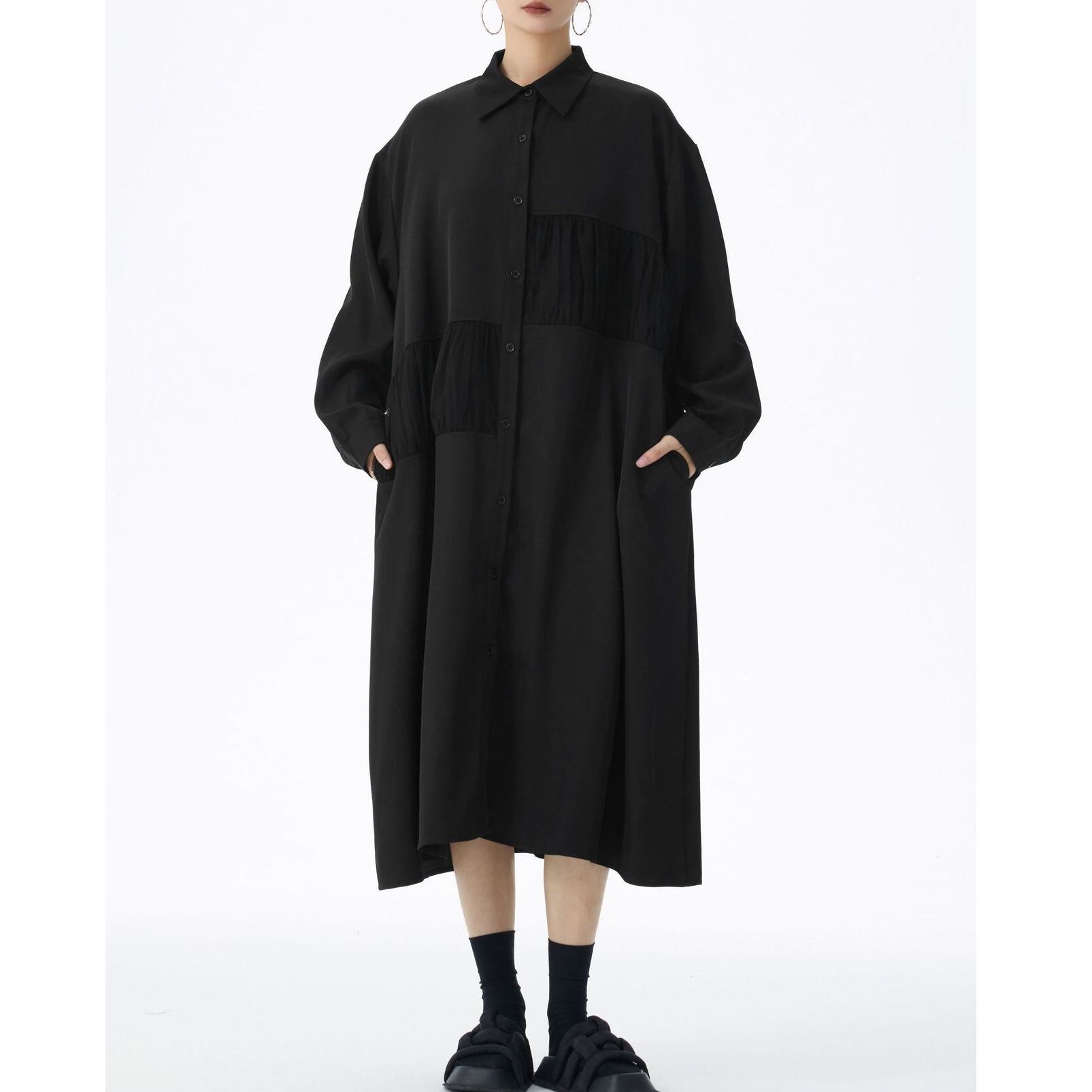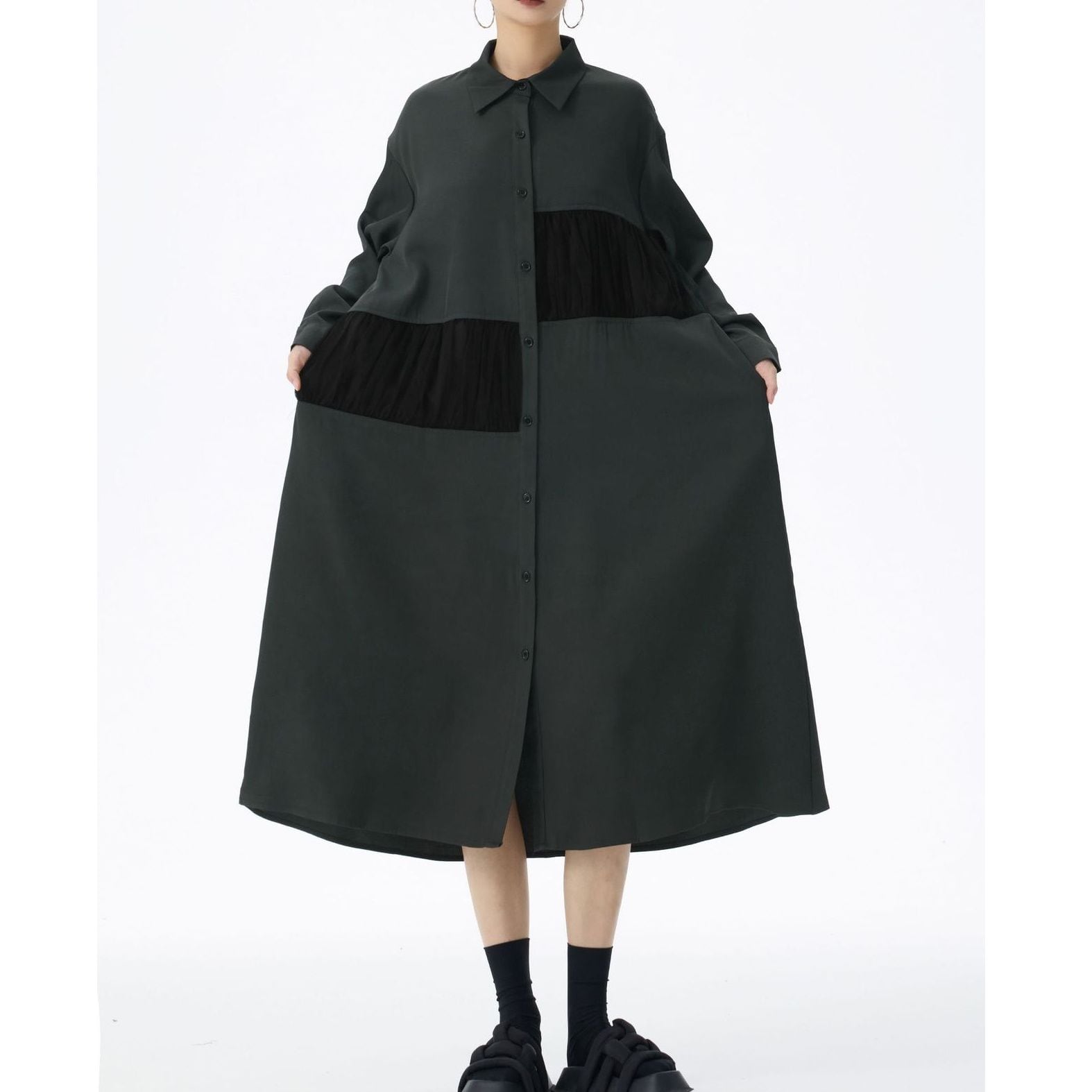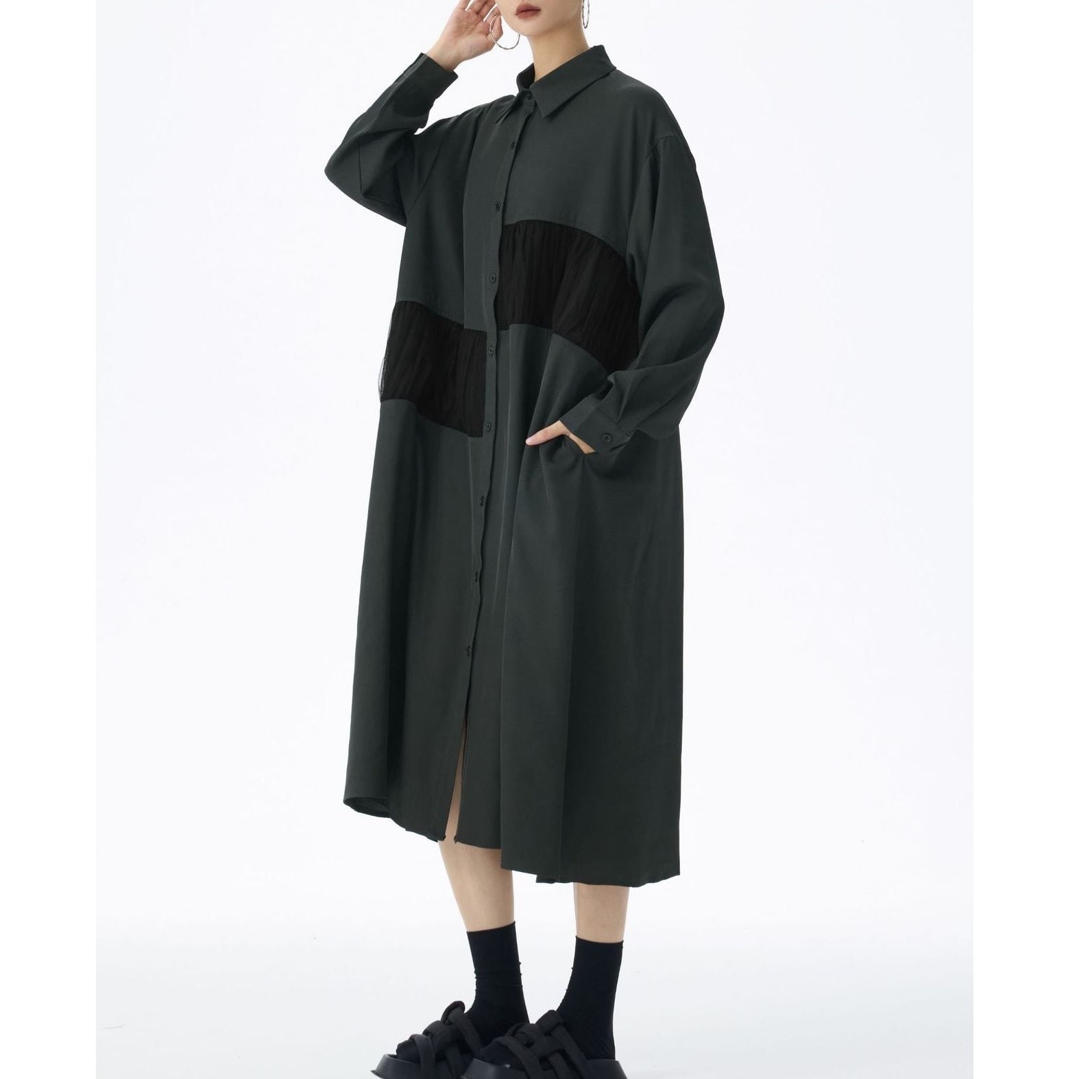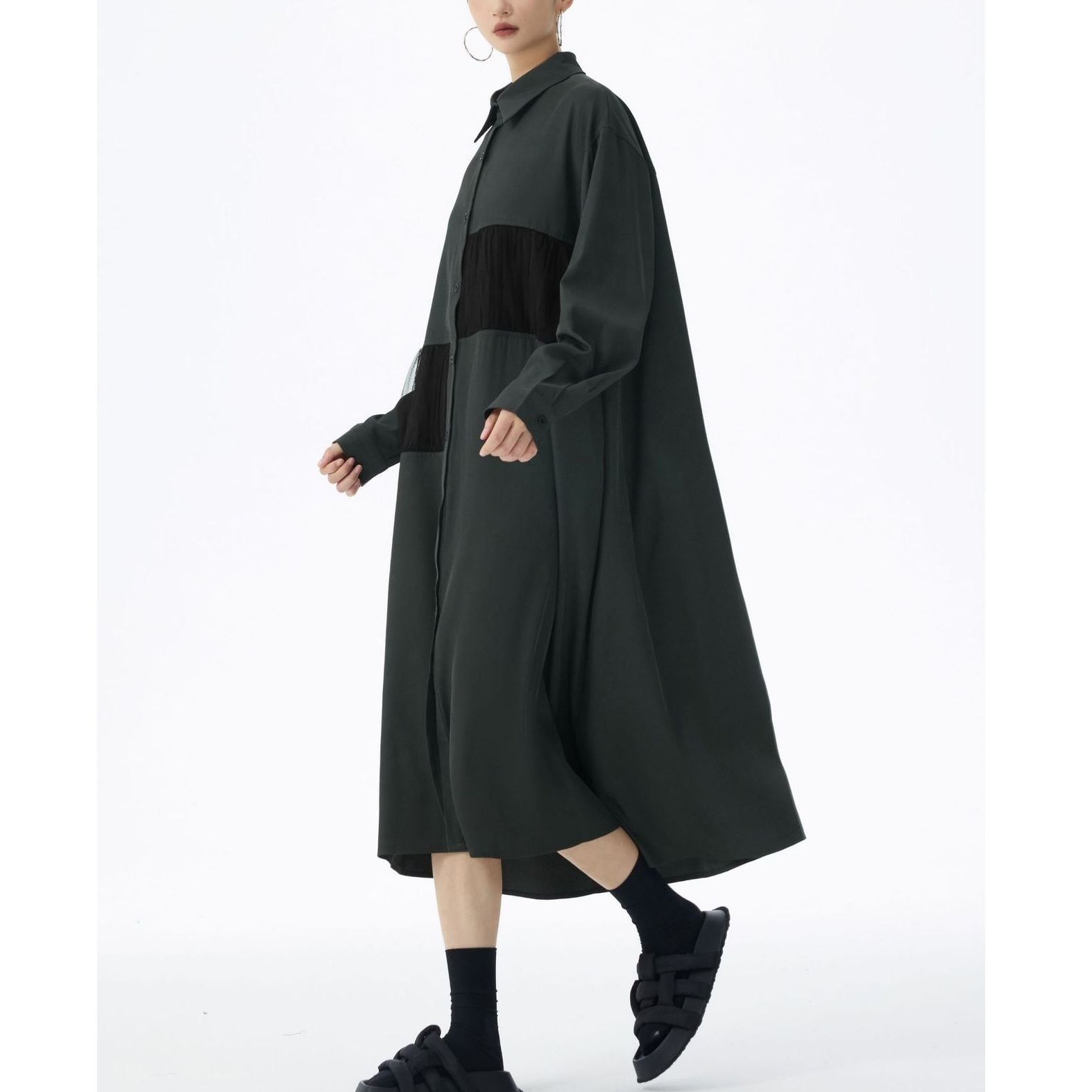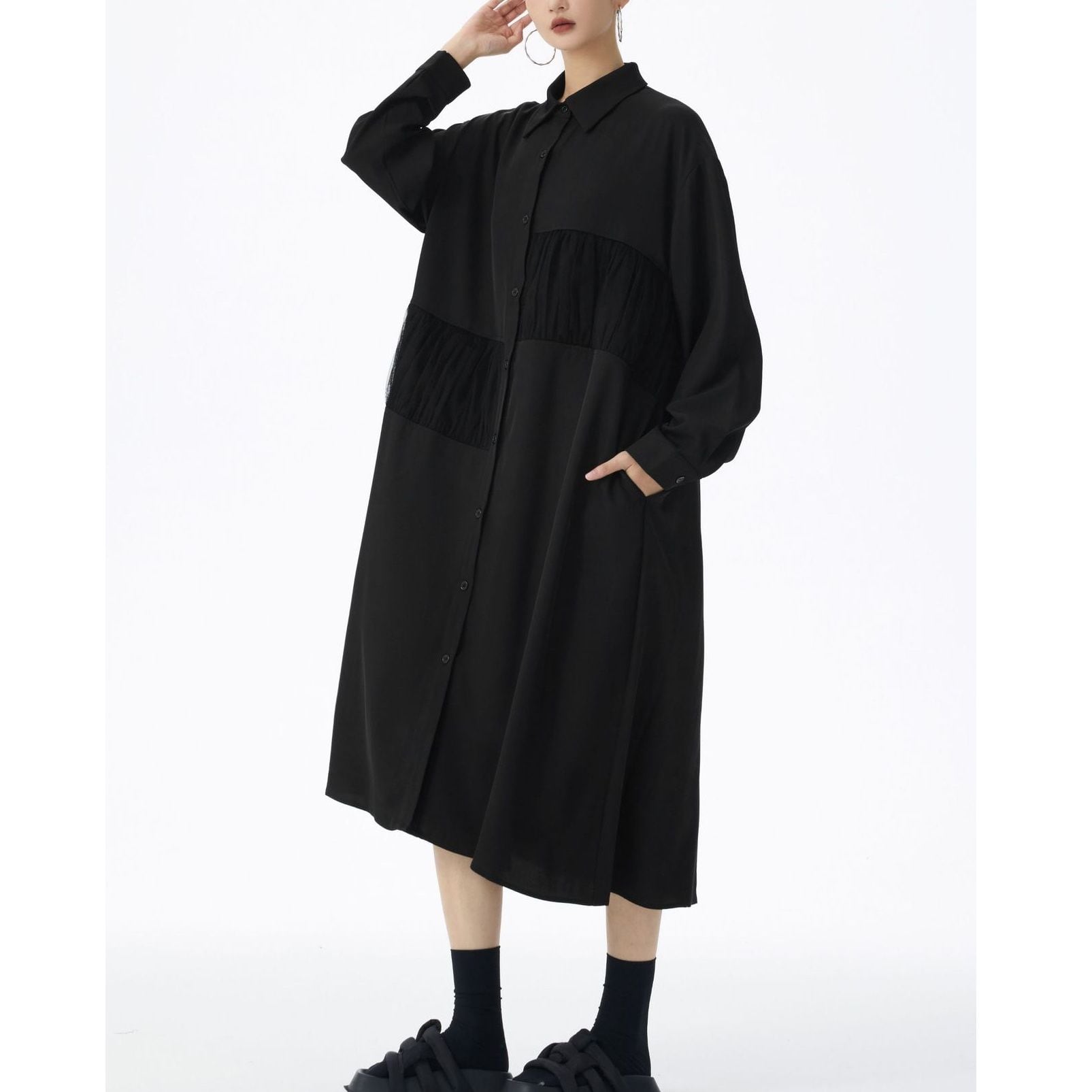 アシンメトリックにあしらわれた細かなメッシュ素材のスティッチがアクセントになった、ポロ襟・長袖・ミドル丈のシャツワンピースです。落ち着いた色味とゆったりとしたシルエットで、羽織りものとしても使えるカジュアルアイテムです。色は2色から選べます。