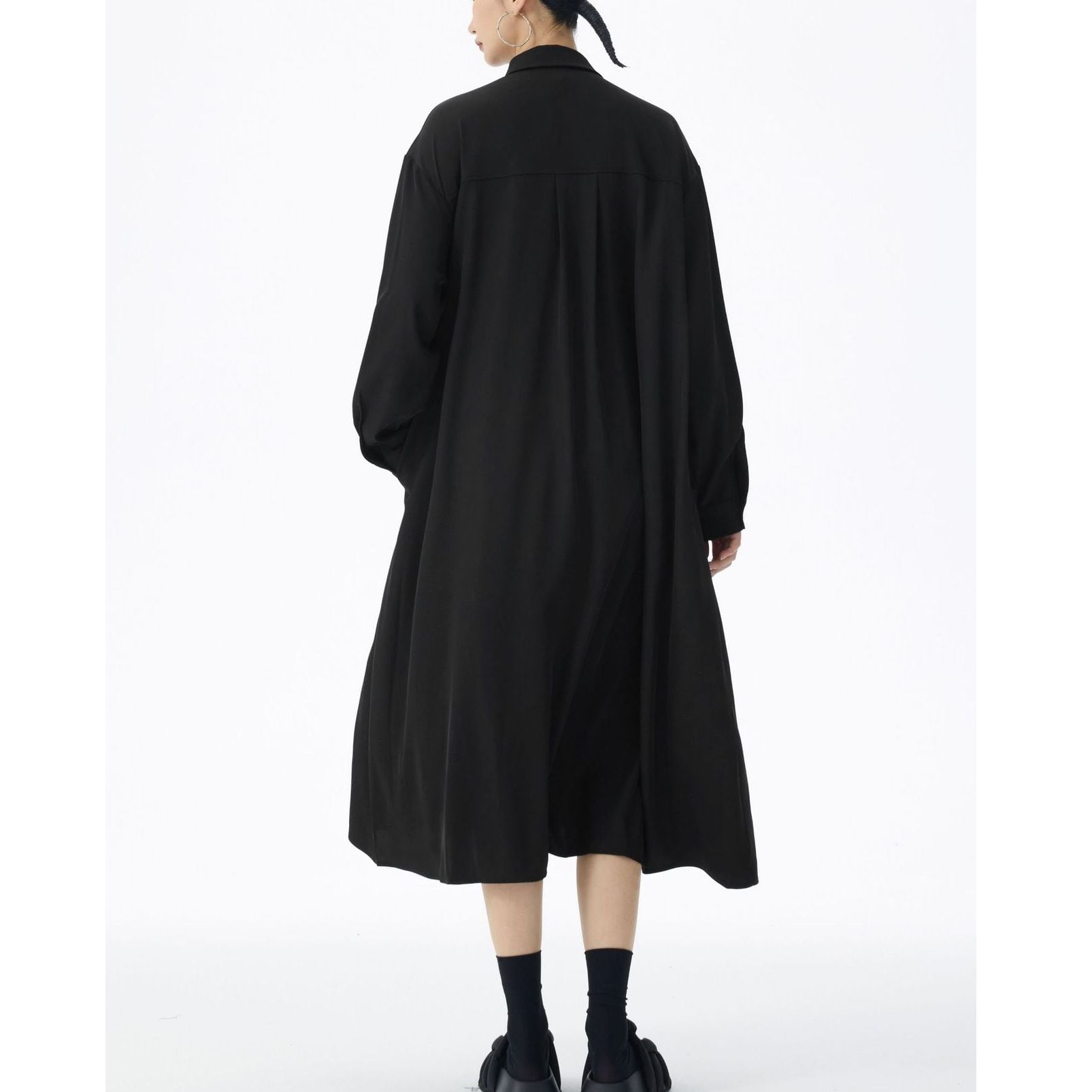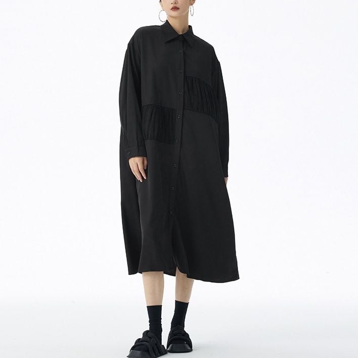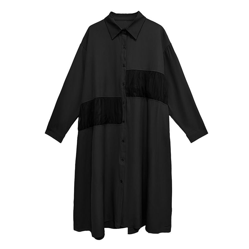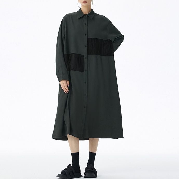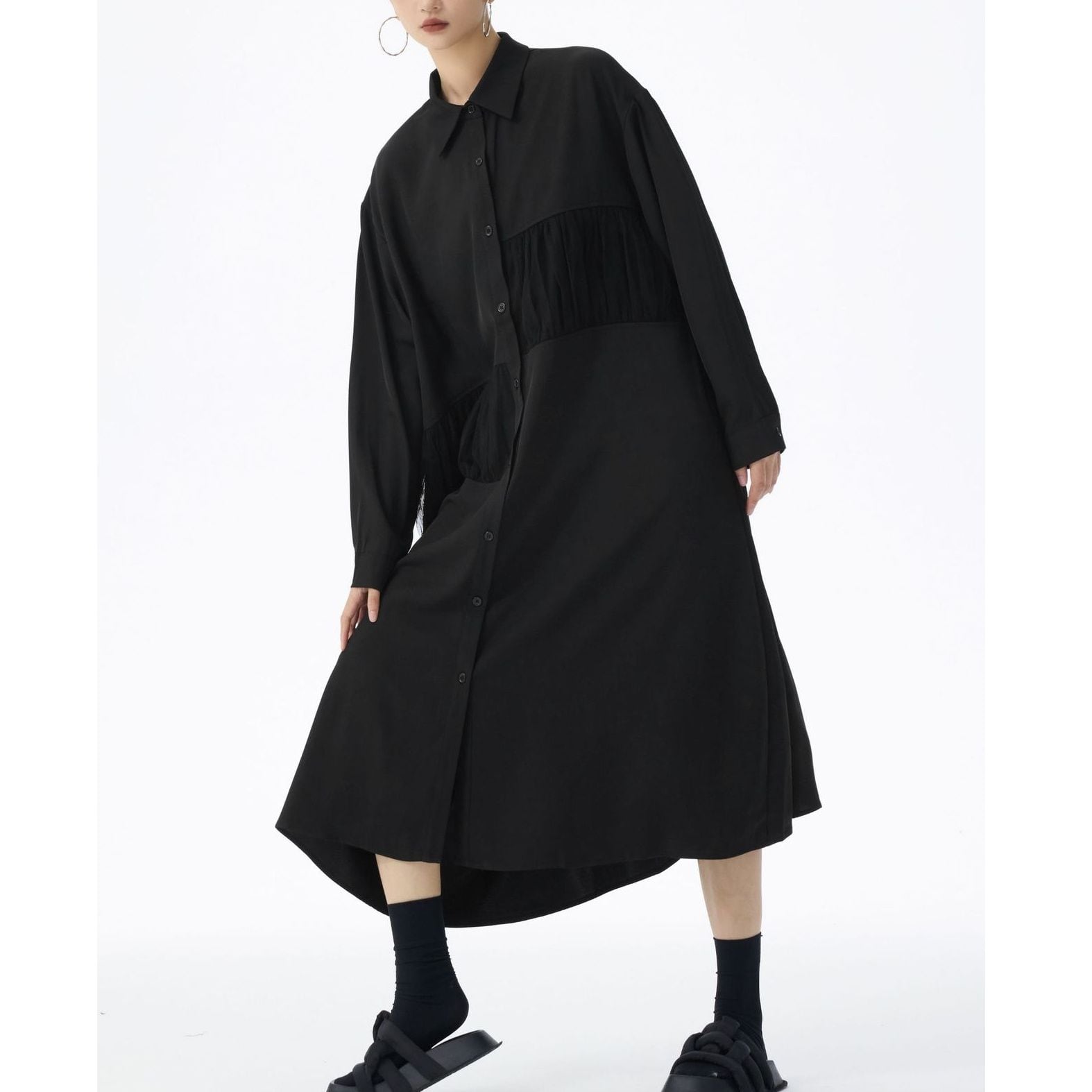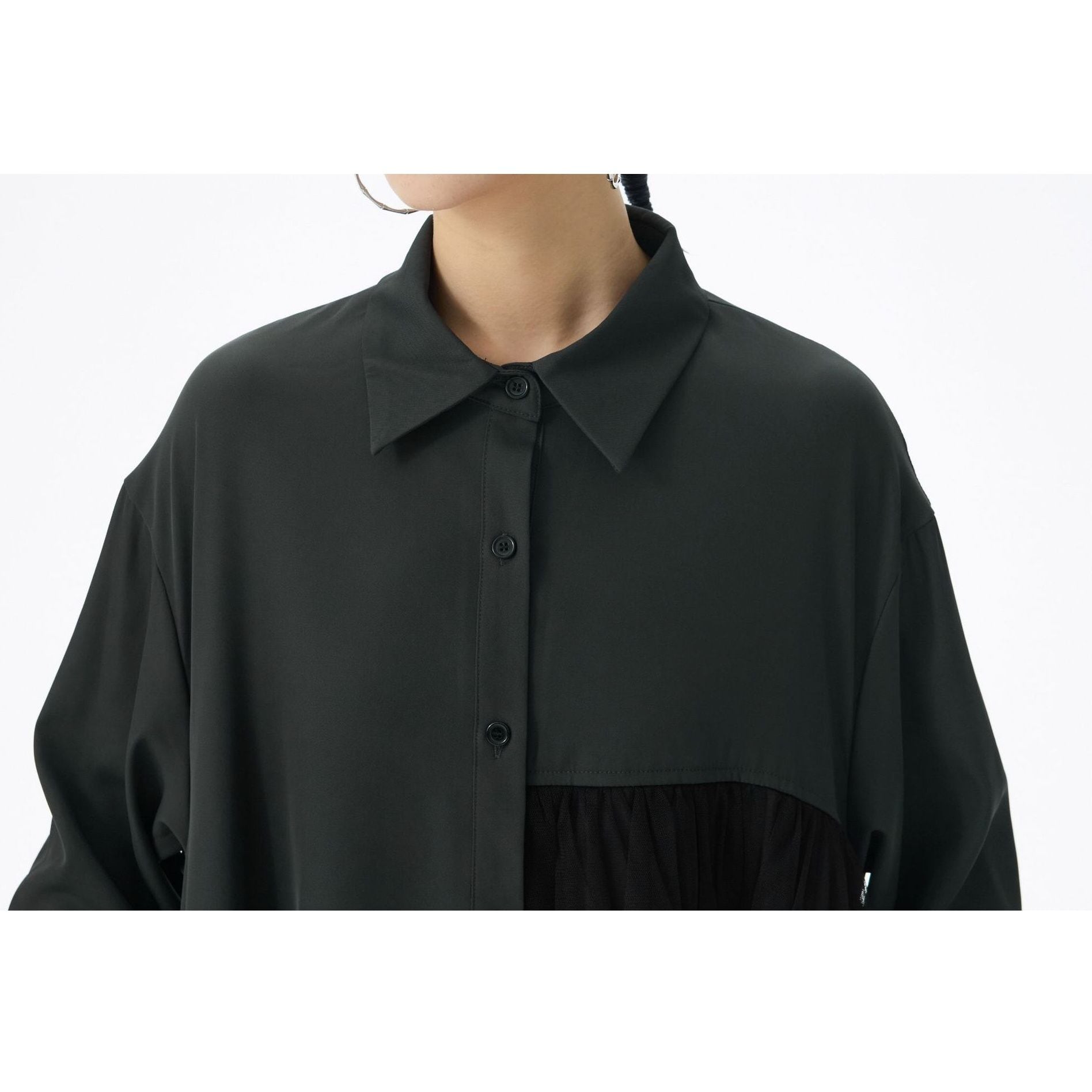 アシンメトリックにあしらわれた細かなメッシュ素材のスティッチがアクセントになった、ポロ襟・長袖・ミドル丈のシャツワンピースです。落ち着いた色味とゆったりとしたシルエットで、羽織りものとしても使えるカジュアルアイテムです。色は2色から選べます。
