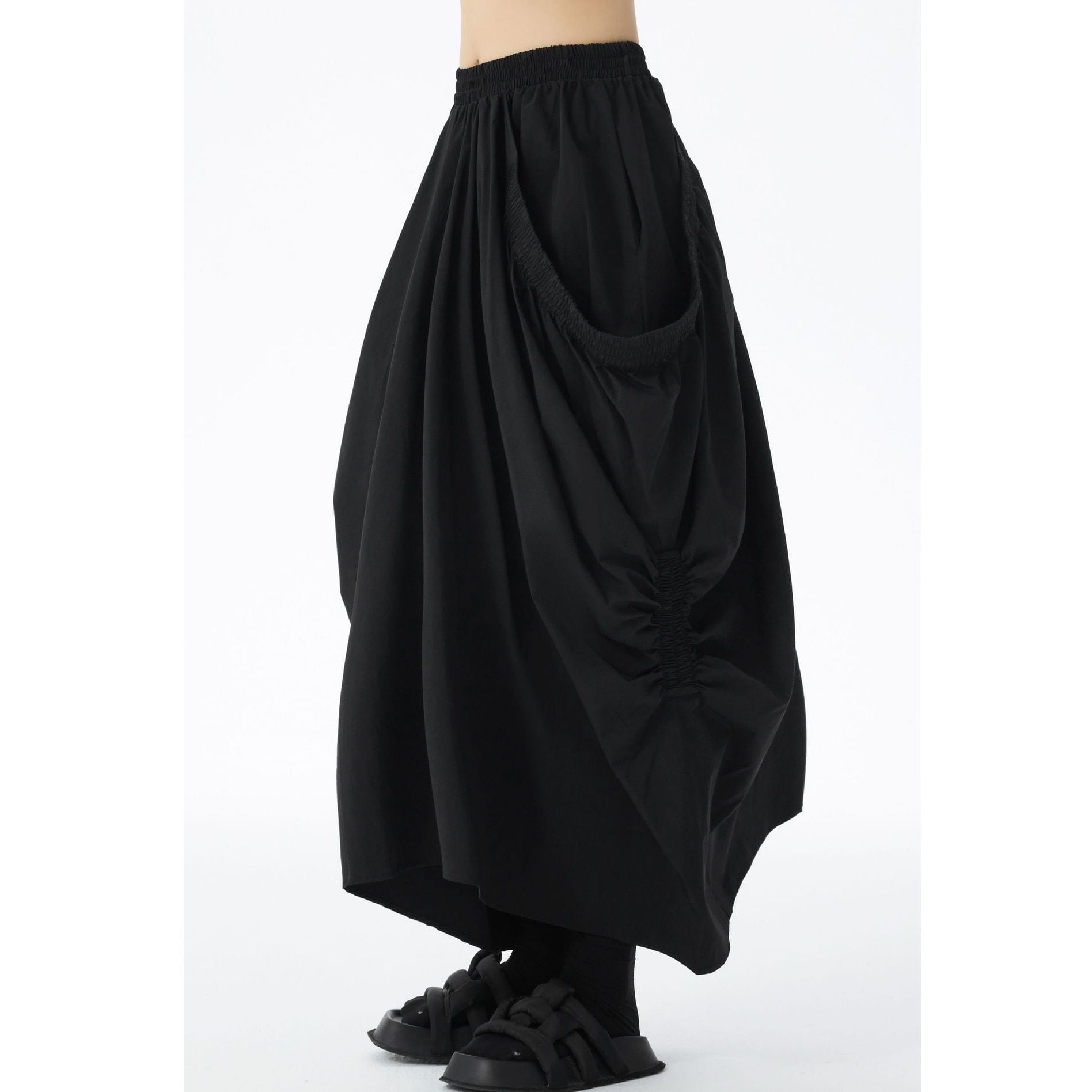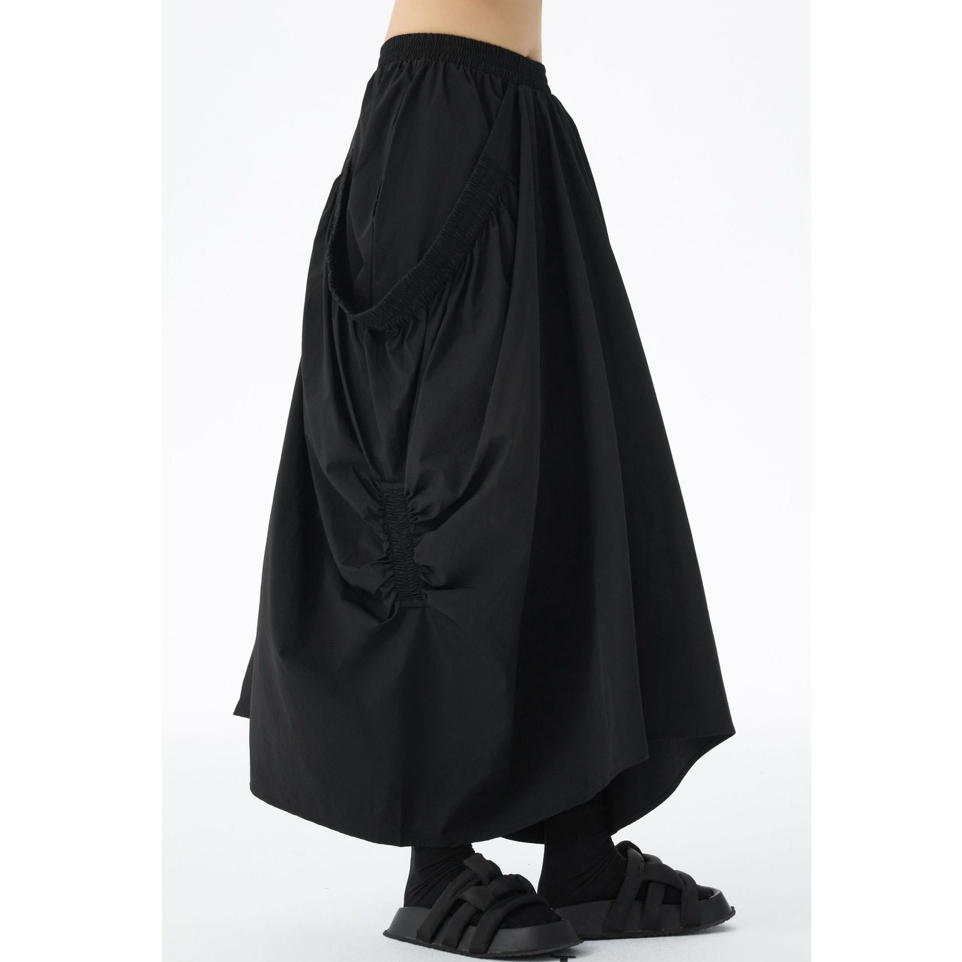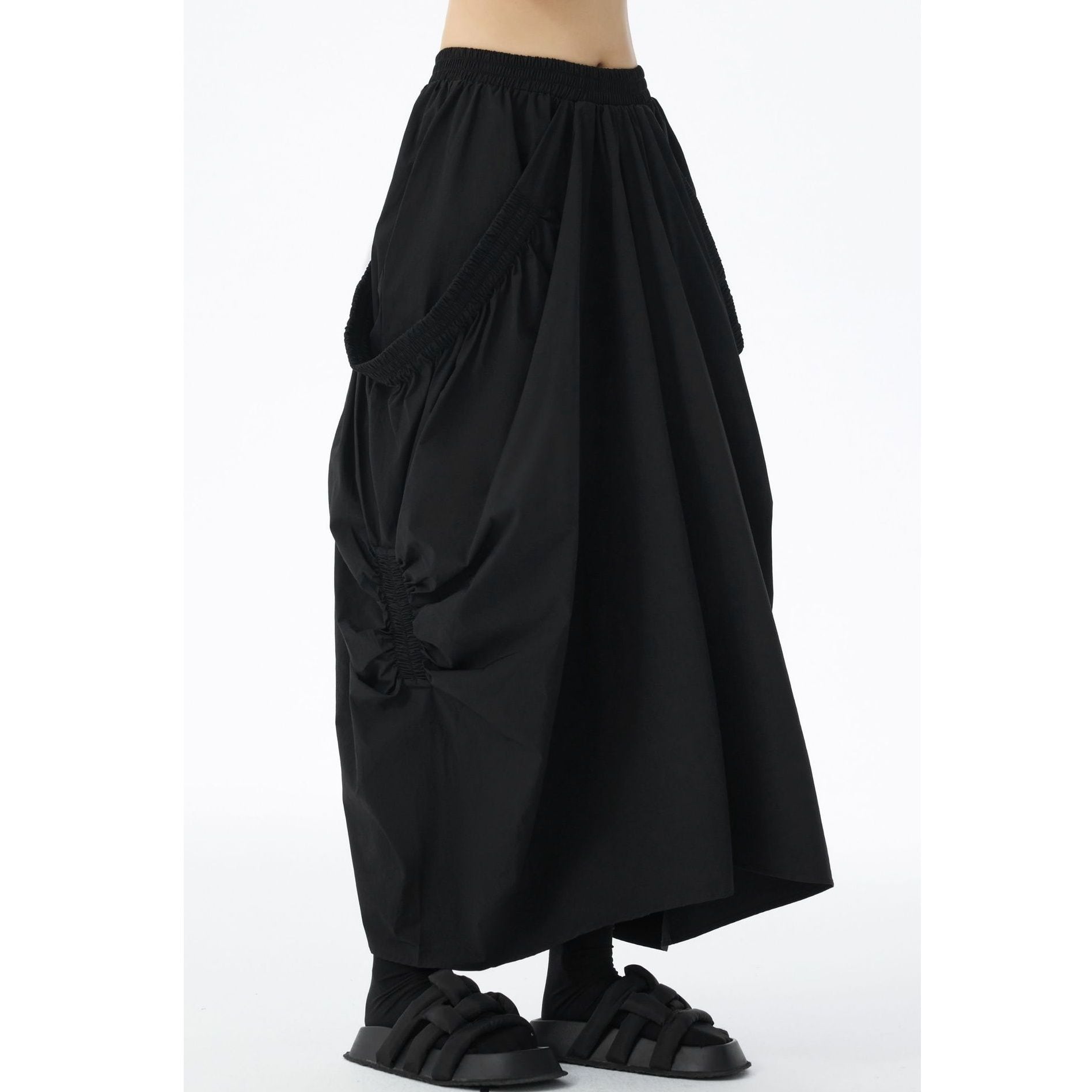 ゴム加工されたレイヤードが作るシルエットが特徴的な、ロング丈のデザインスカートです。ウエストはゴムなので、着脱が簡単で履き心地が良いです。ドレープが美しく単色で合わせやすい、コーディネートの主役になるアイテムです。