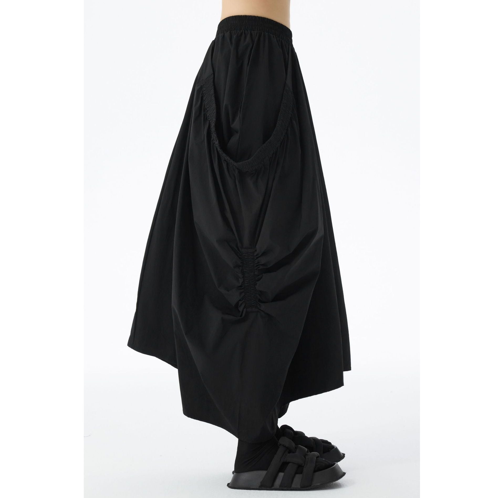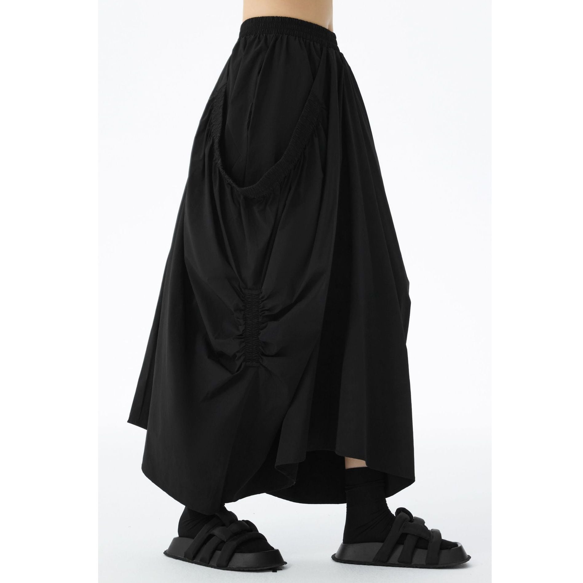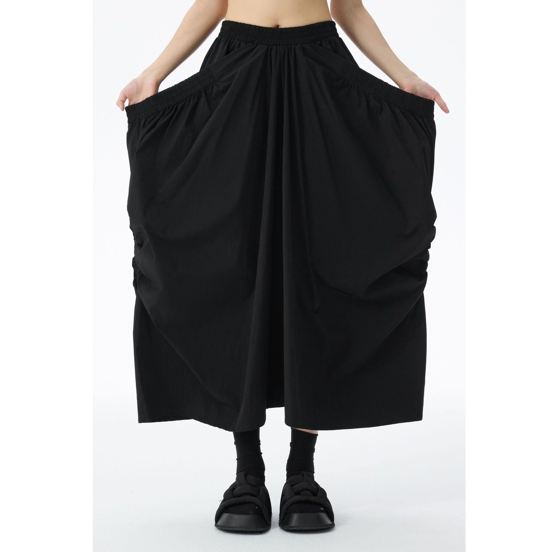 ゴム加工されたレイヤードが作るシルエットが特徴的な、ロング丈のデザインスカートです。ウエストはゴムなので、着脱が簡単で履き心地が良いです。ドレープが美しく単色で合わせやすい、コーディネートの主役になるアイテムです。