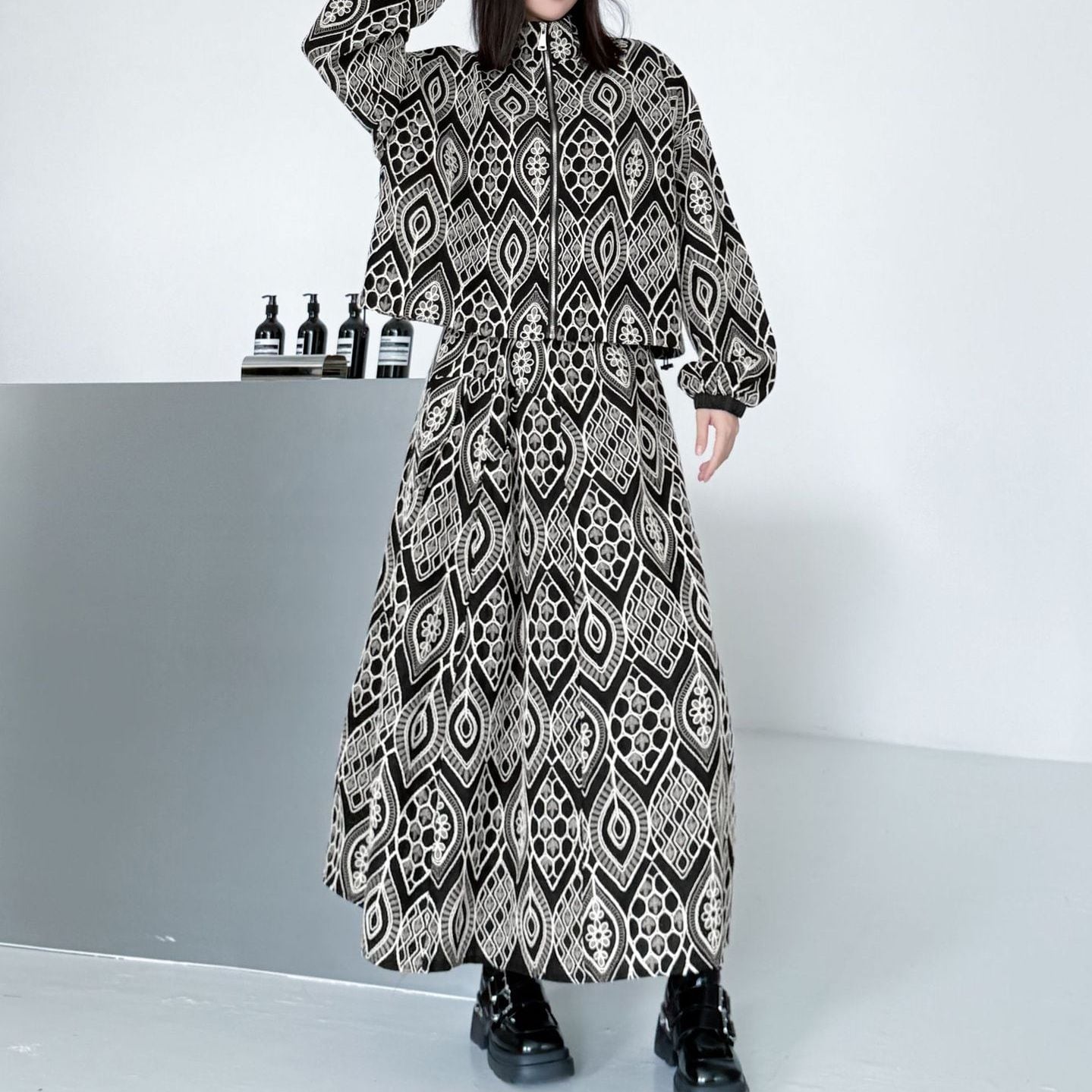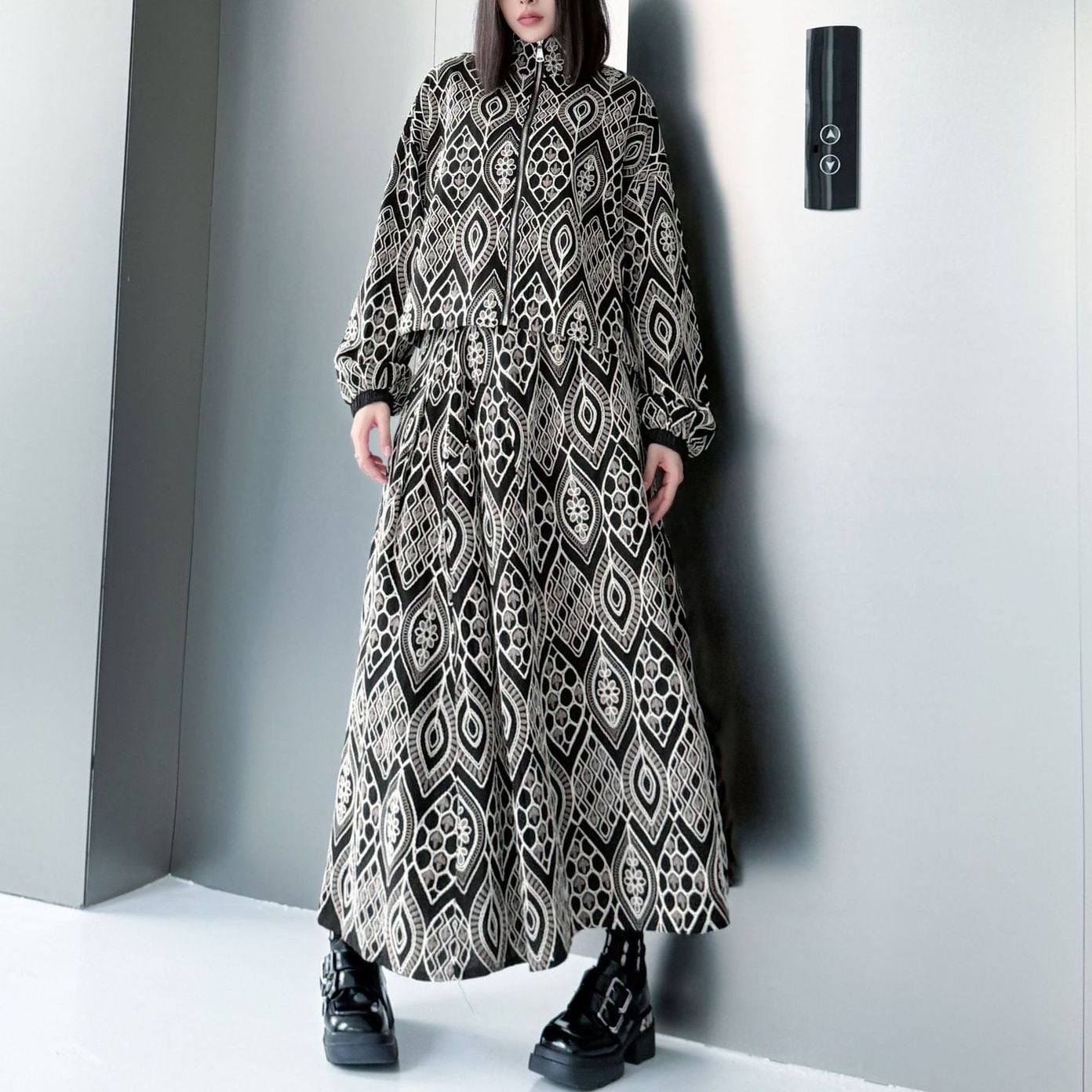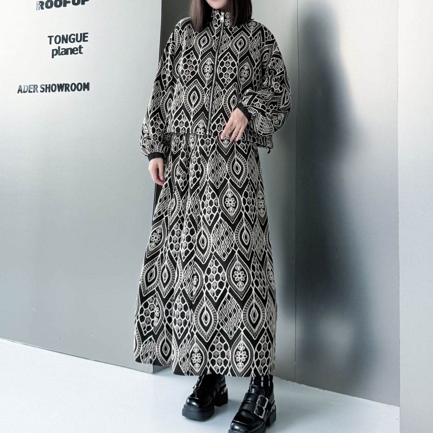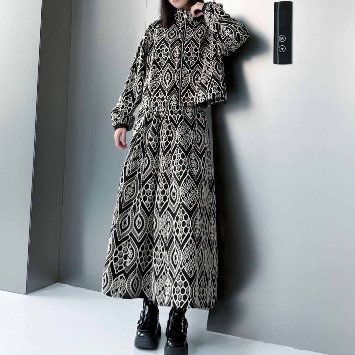 ブラック地にホワイトの柄刺繍が美しい、スタンドカラー・長袖・ショート丈のフルジップジャケットと、Aライン・ロング丈のスカートのセットアップです。上下別売りです。上下共に他アイテムと合わせてもコーディネートの主役になる、目を惹くアイテムです。