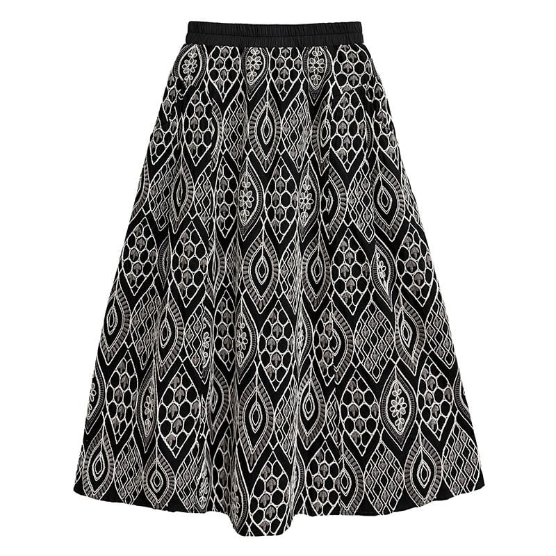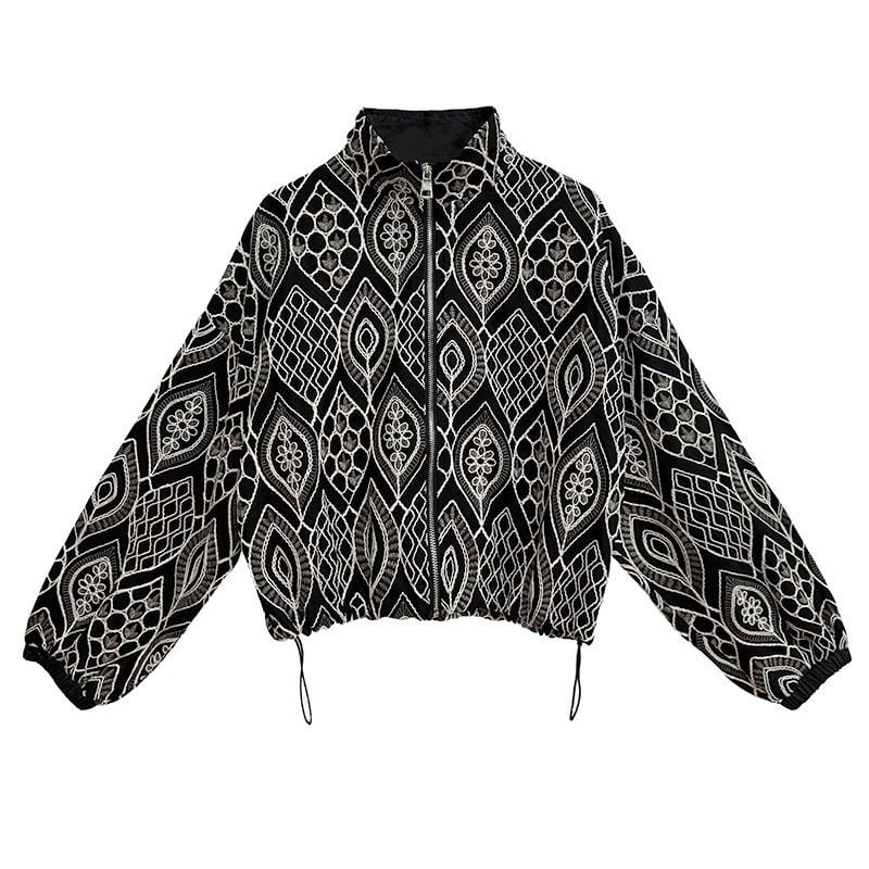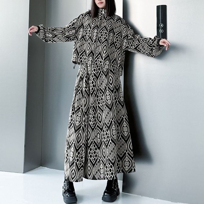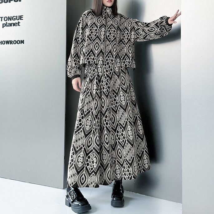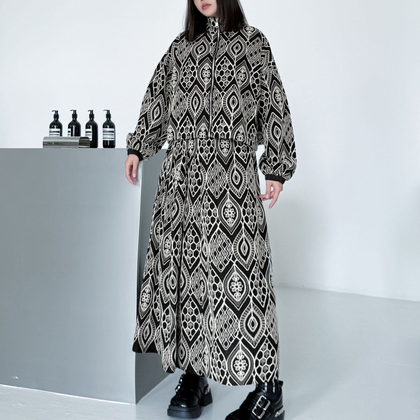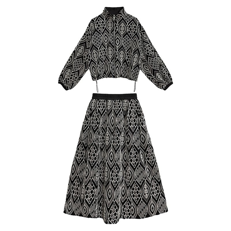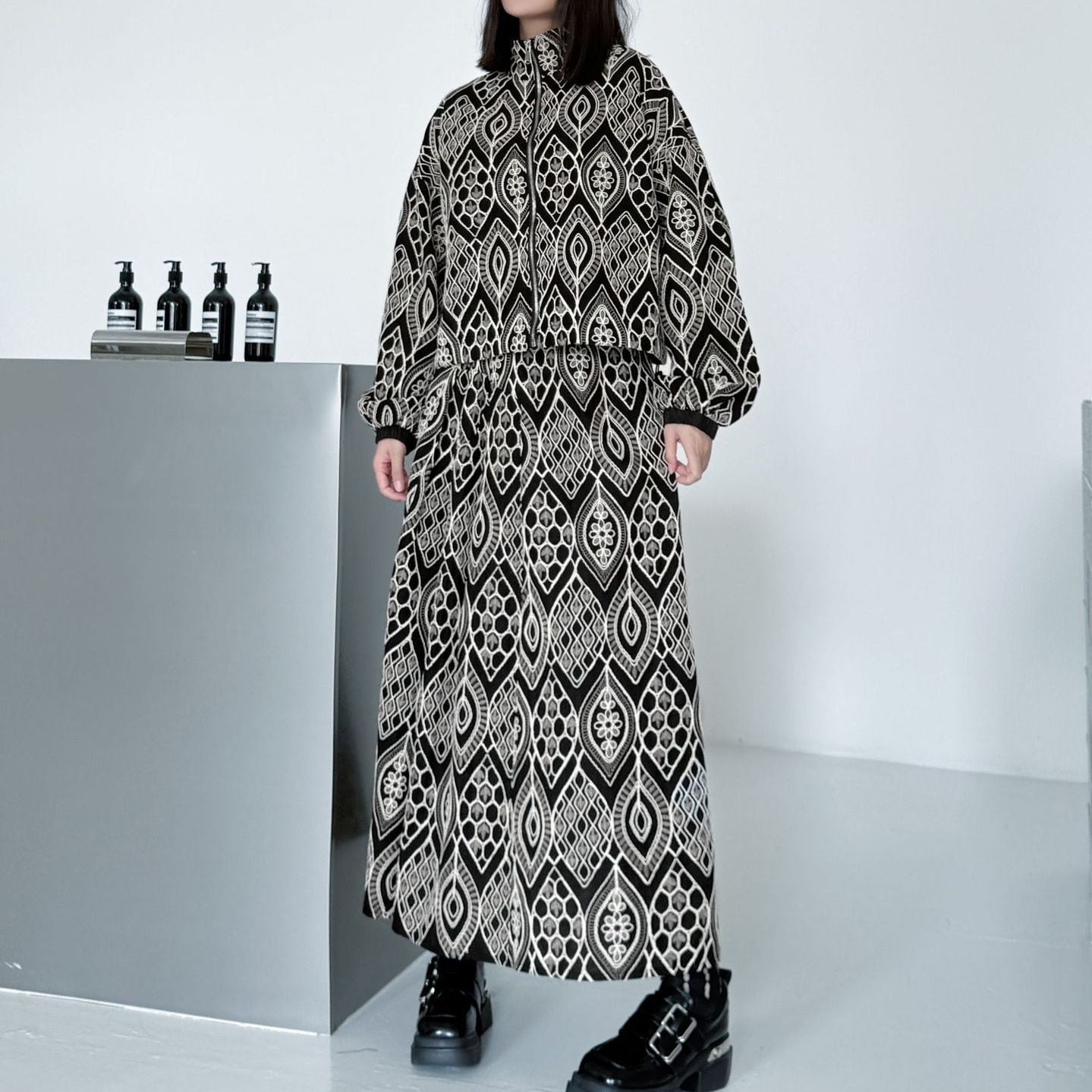 ブラック地にホワイトの柄刺繍が美しい、スタンドカラー・長袖・ショート丈のフルジップジャケットと、Aライン・ロング丈のスカートのセットアップです。上下別売りです。上下共に他アイテムと合わせてもコーディネートの主役になる、目を惹くアイテムです。