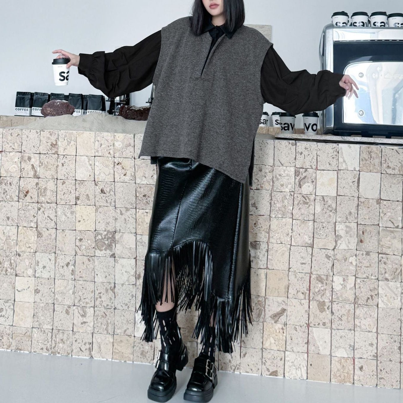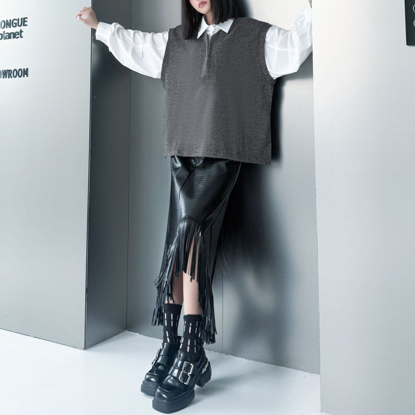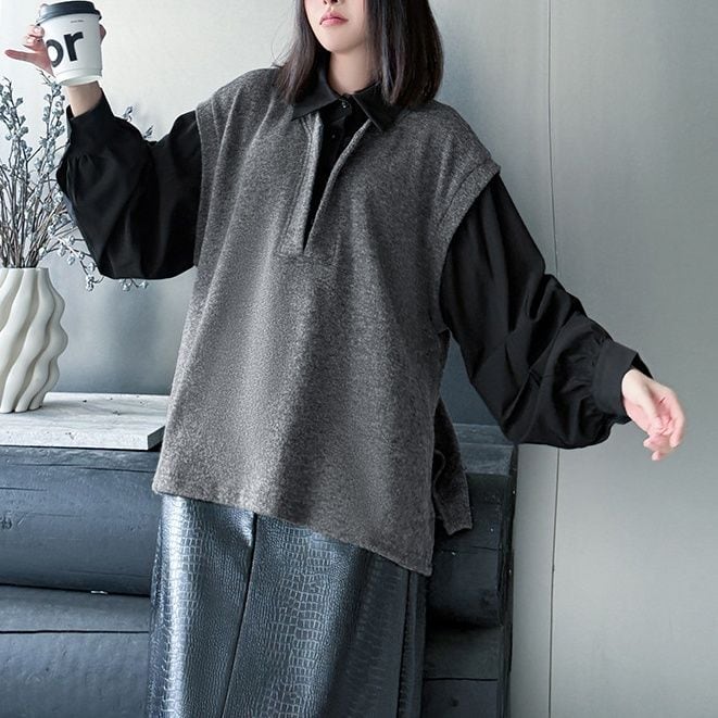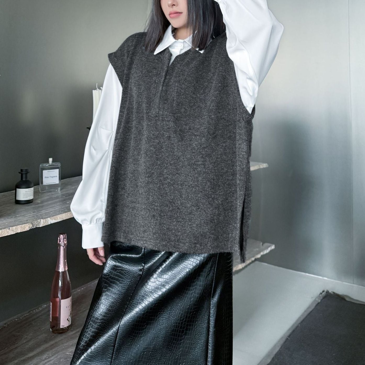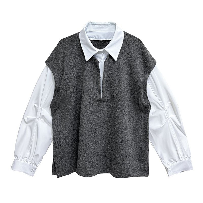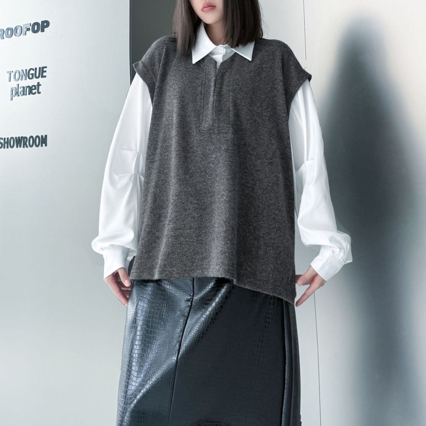 長袖の単色シャツの上にグレーのニットベストを重ねたフェイクツーピースデザインがお洒落な、ポロ襟・長袖・ストレートカットのトップスです。裾はサイドにスリットが入っています。ゆったりとしたシルエットと落ち着いた色味で合わせやすいアイテムです。色は2色から選べます。