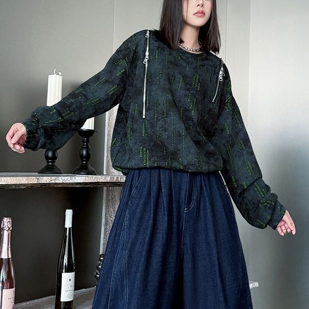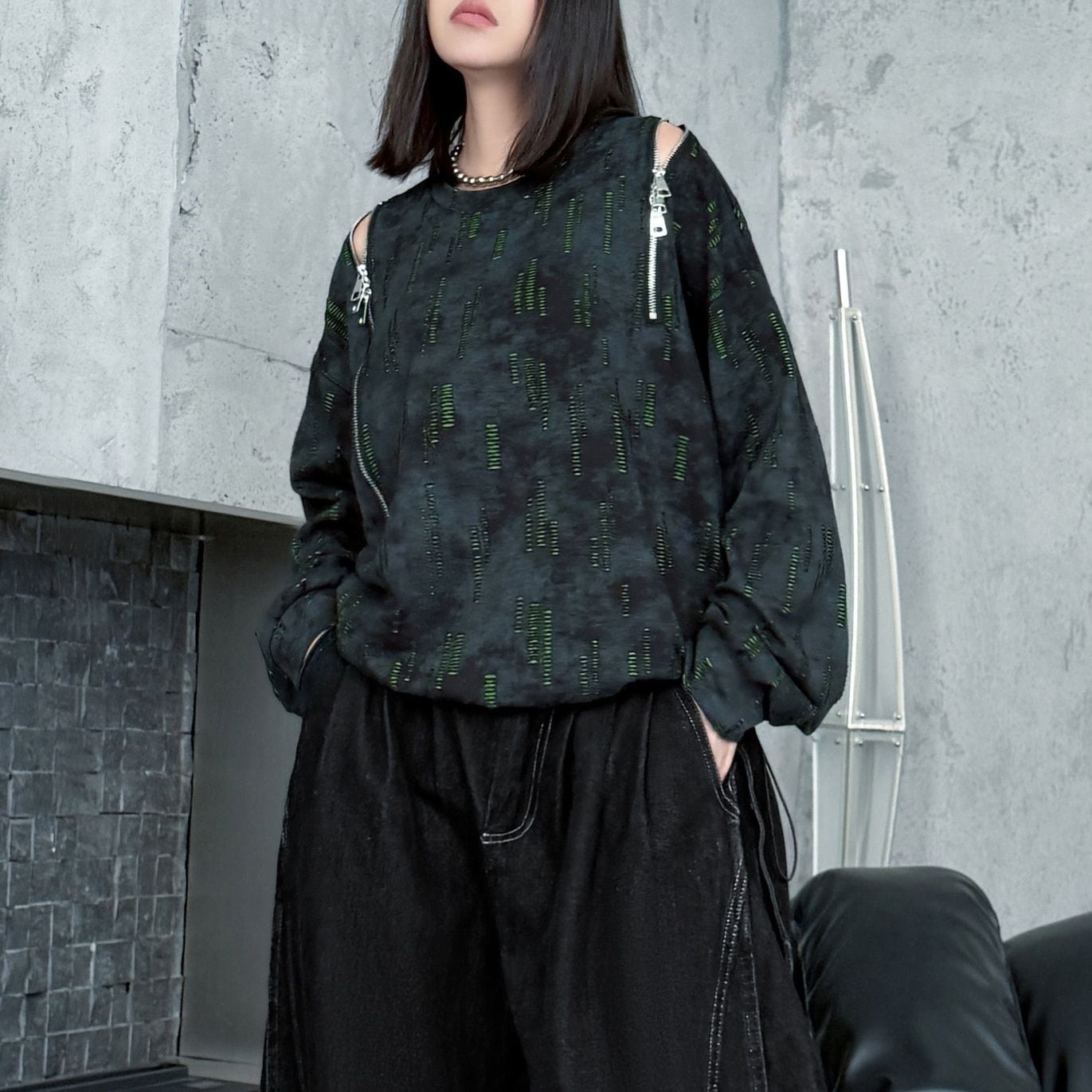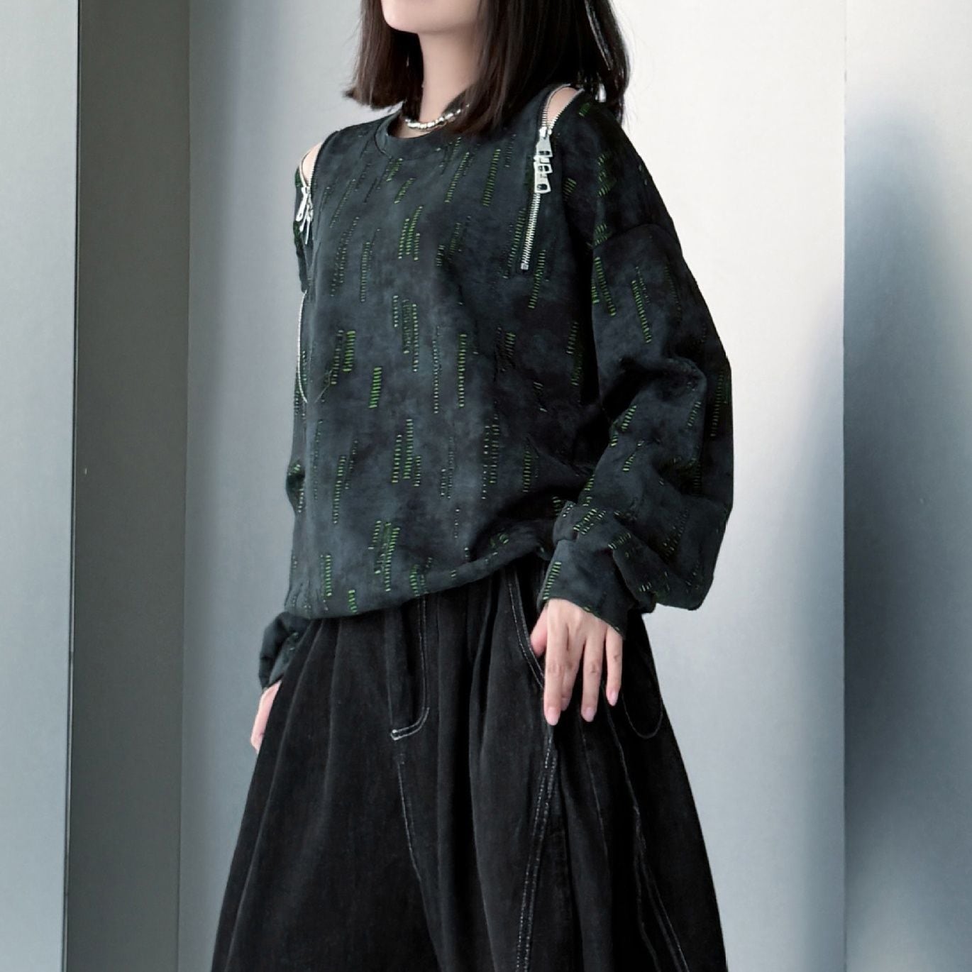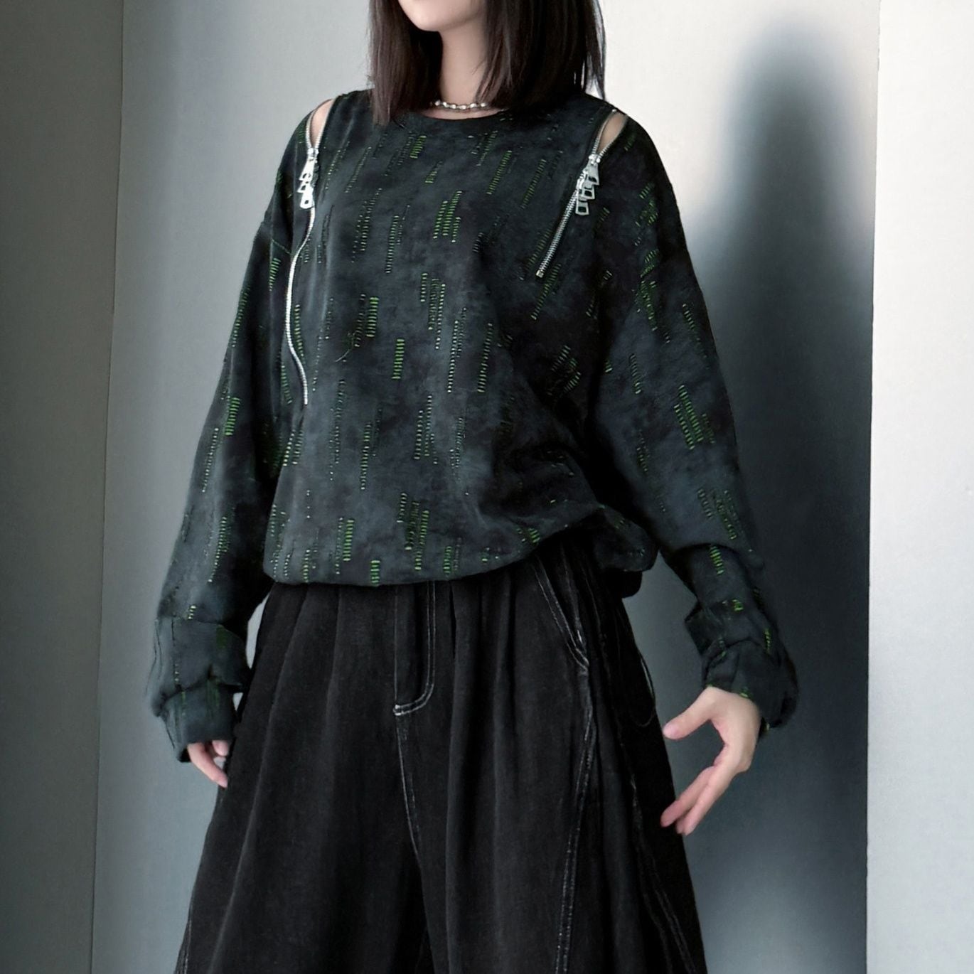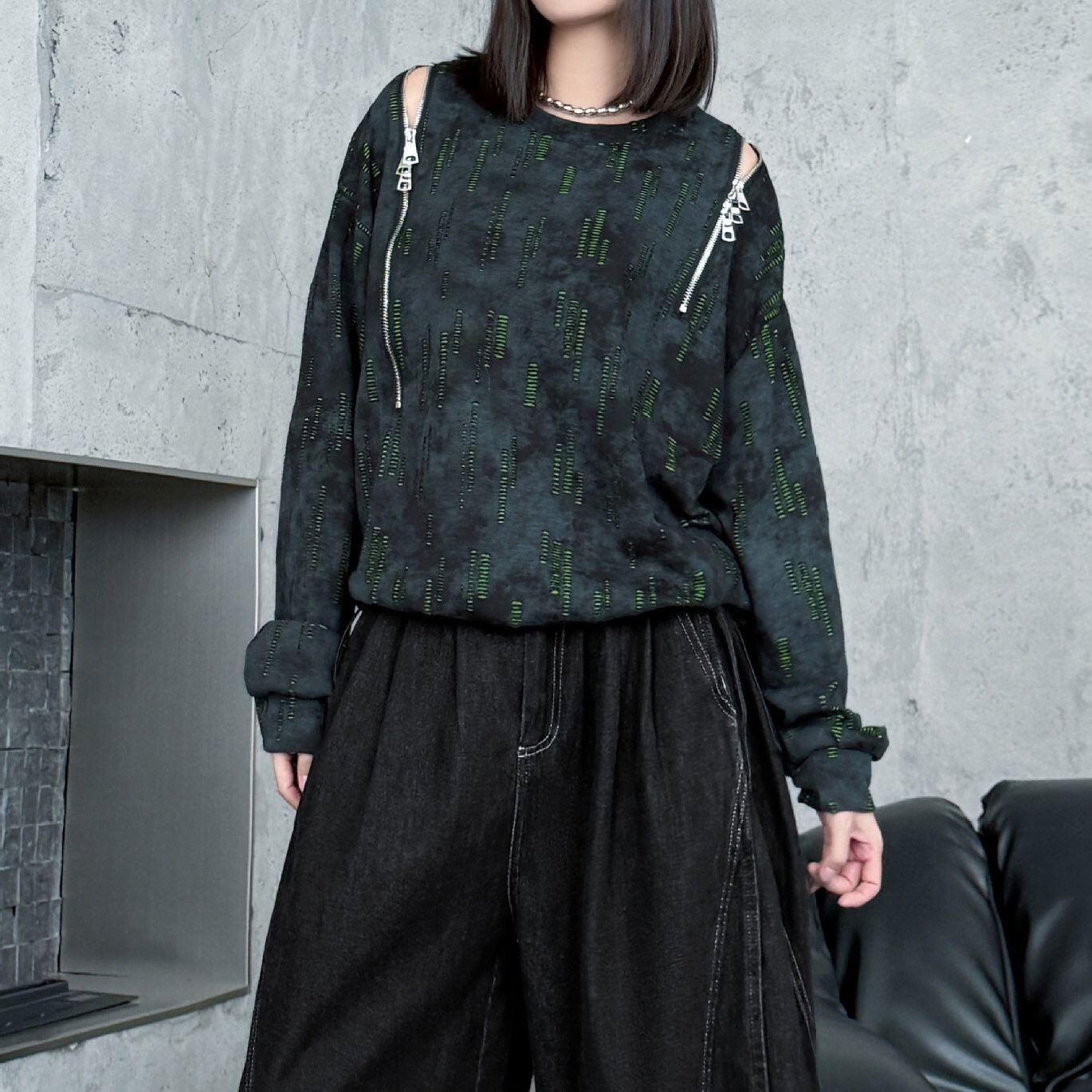 両肩の長さの異なるジップラインがアクセントになった、ラウンドネックのスウェットシャツです。ジップの開閉でデザインをアレンジできます。絞り染めのブラックにライムグリーンの加工がクールな、コーディネートのアクセントになるアイテムです。