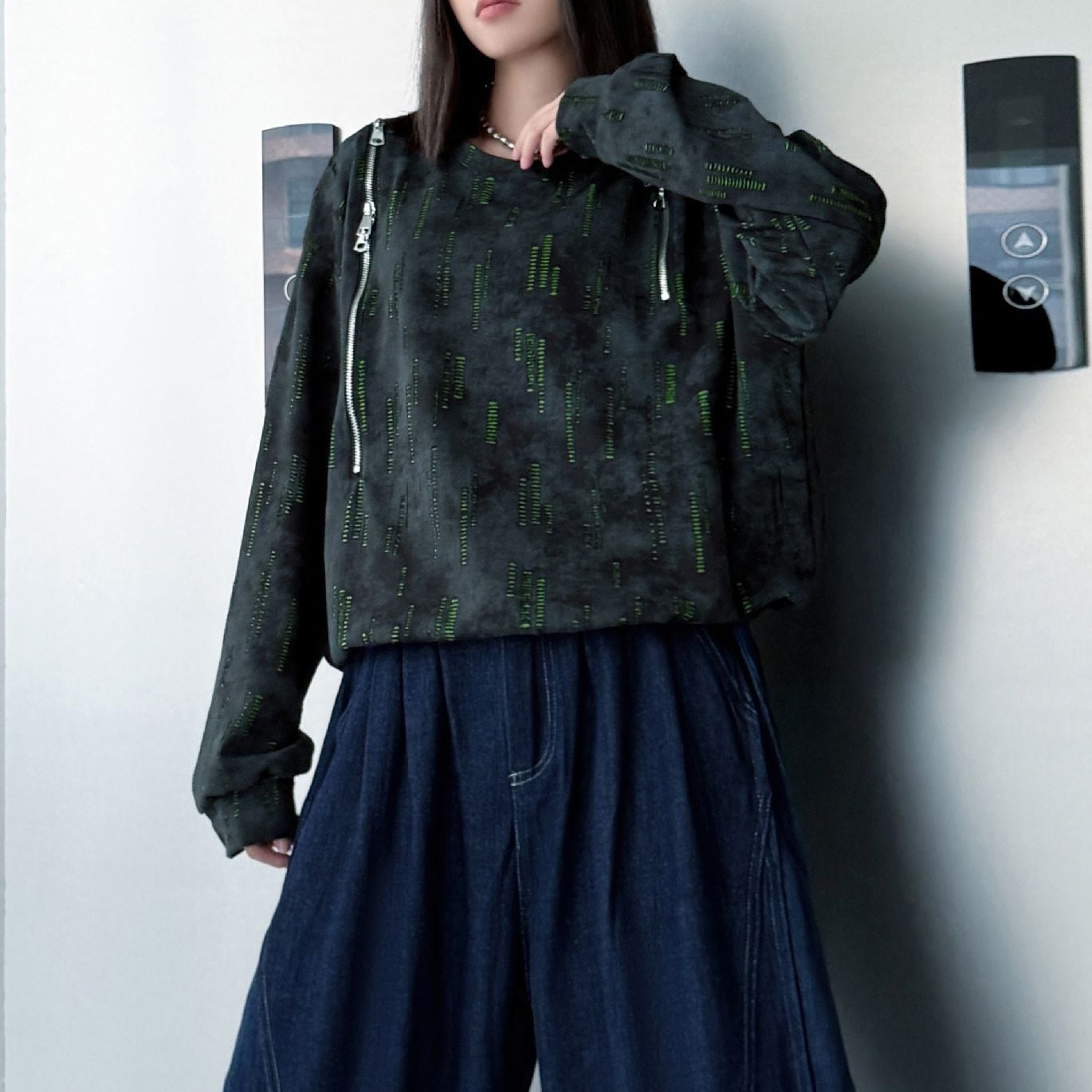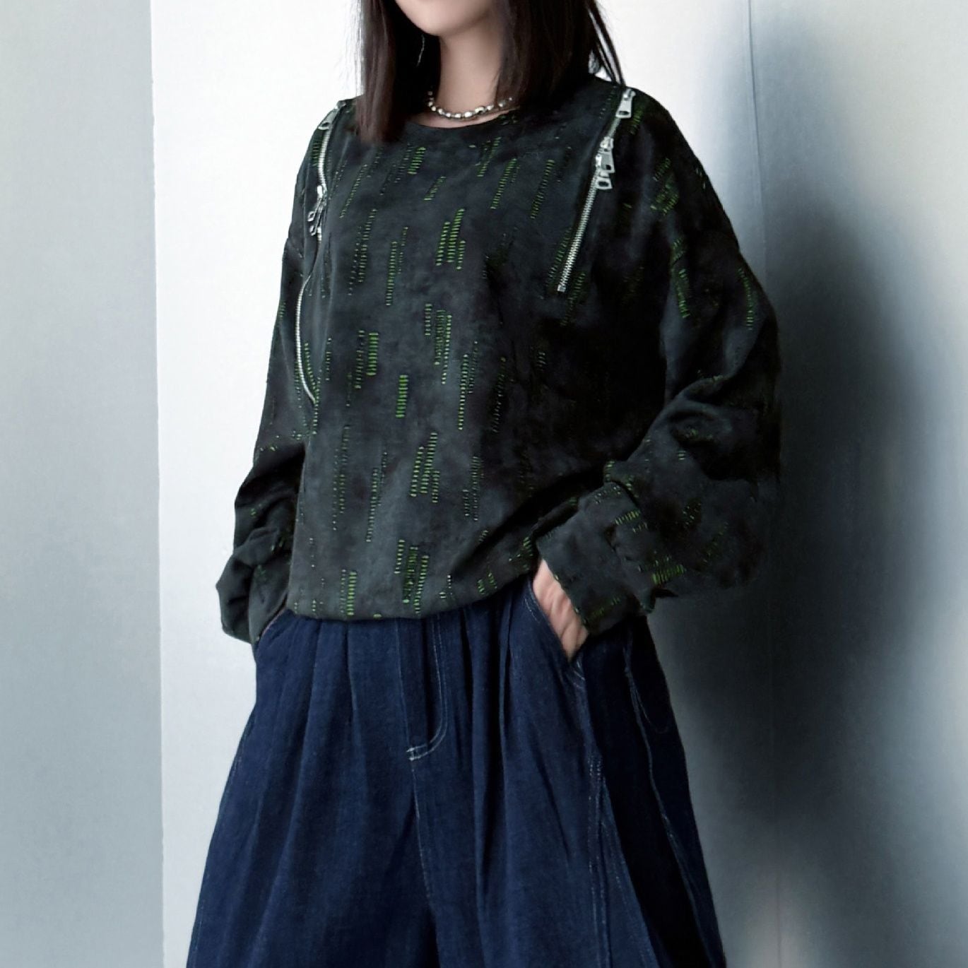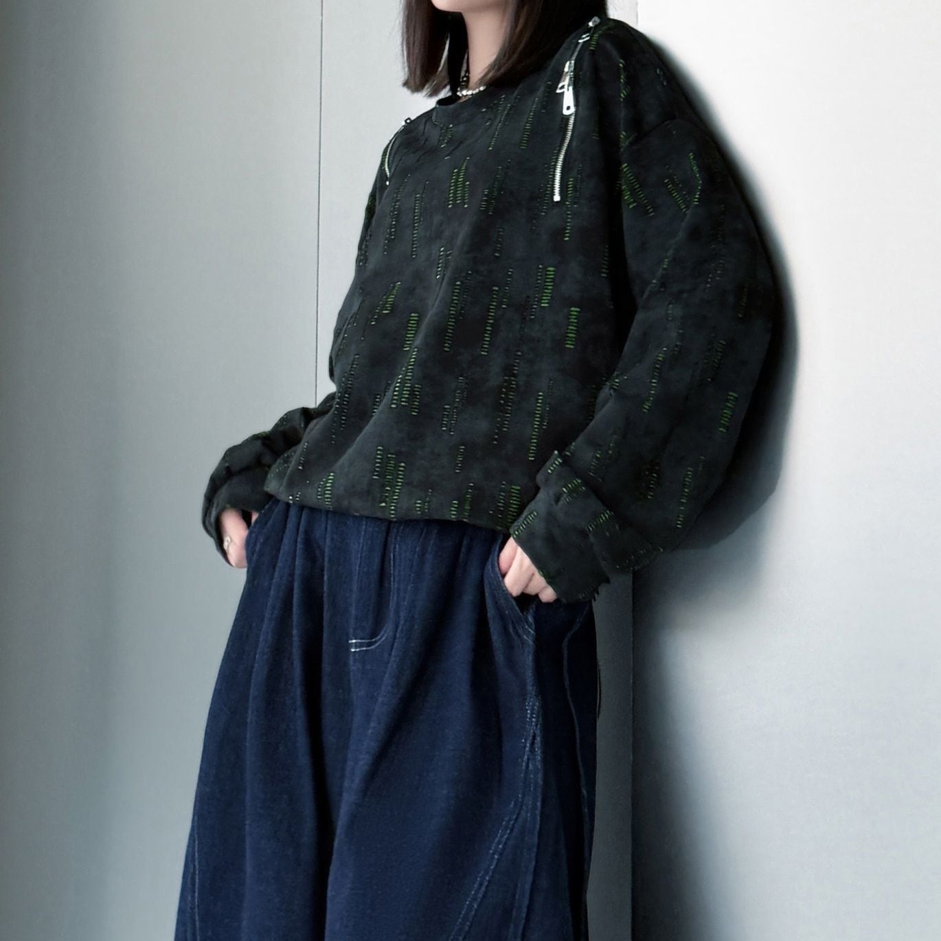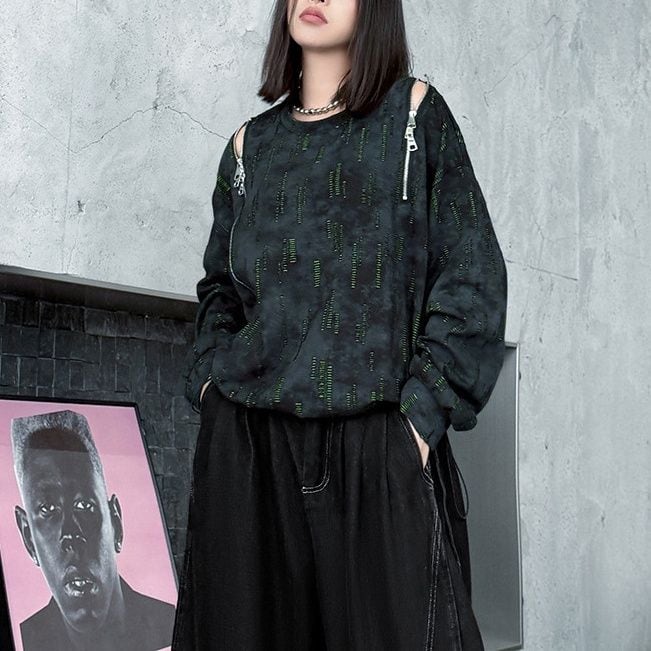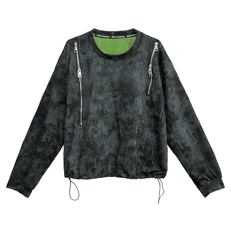 両肩の長さの異なるジップラインがアクセントになった、ラウンドネックのスウェットシャツです。ジップの開閉でデザインをアレンジできます。絞り染めのブラックにライムグリーンの加工がクールな、コーディネートのアクセントになるアイテムです。