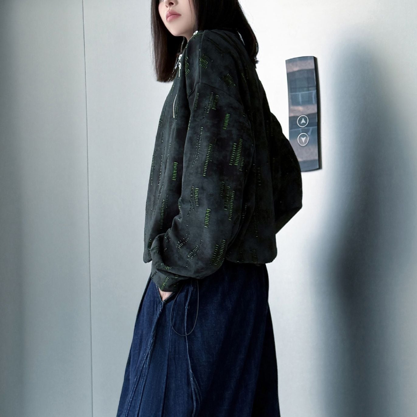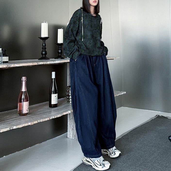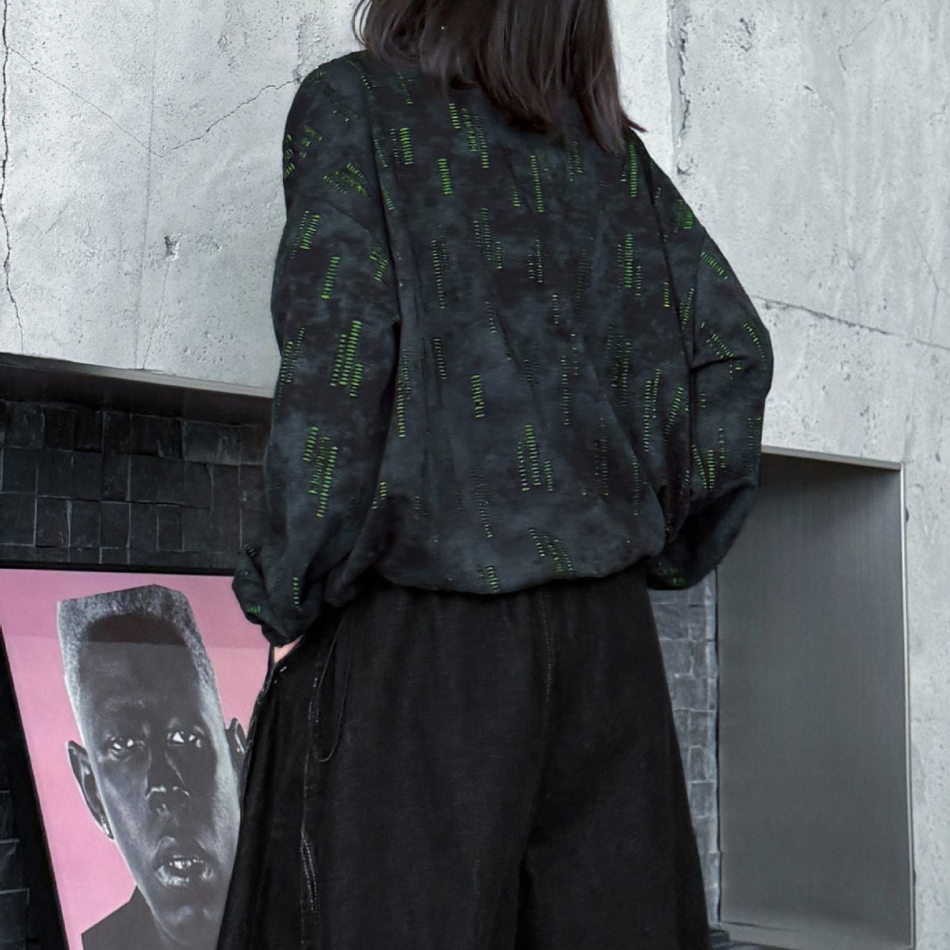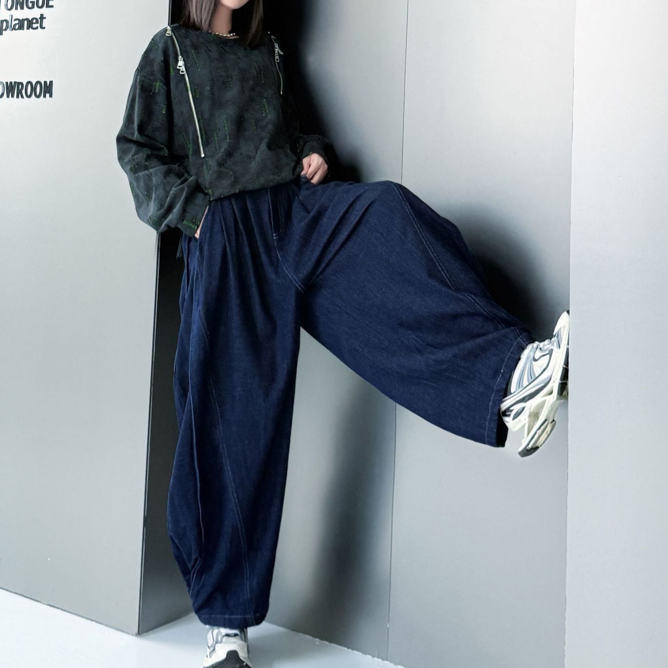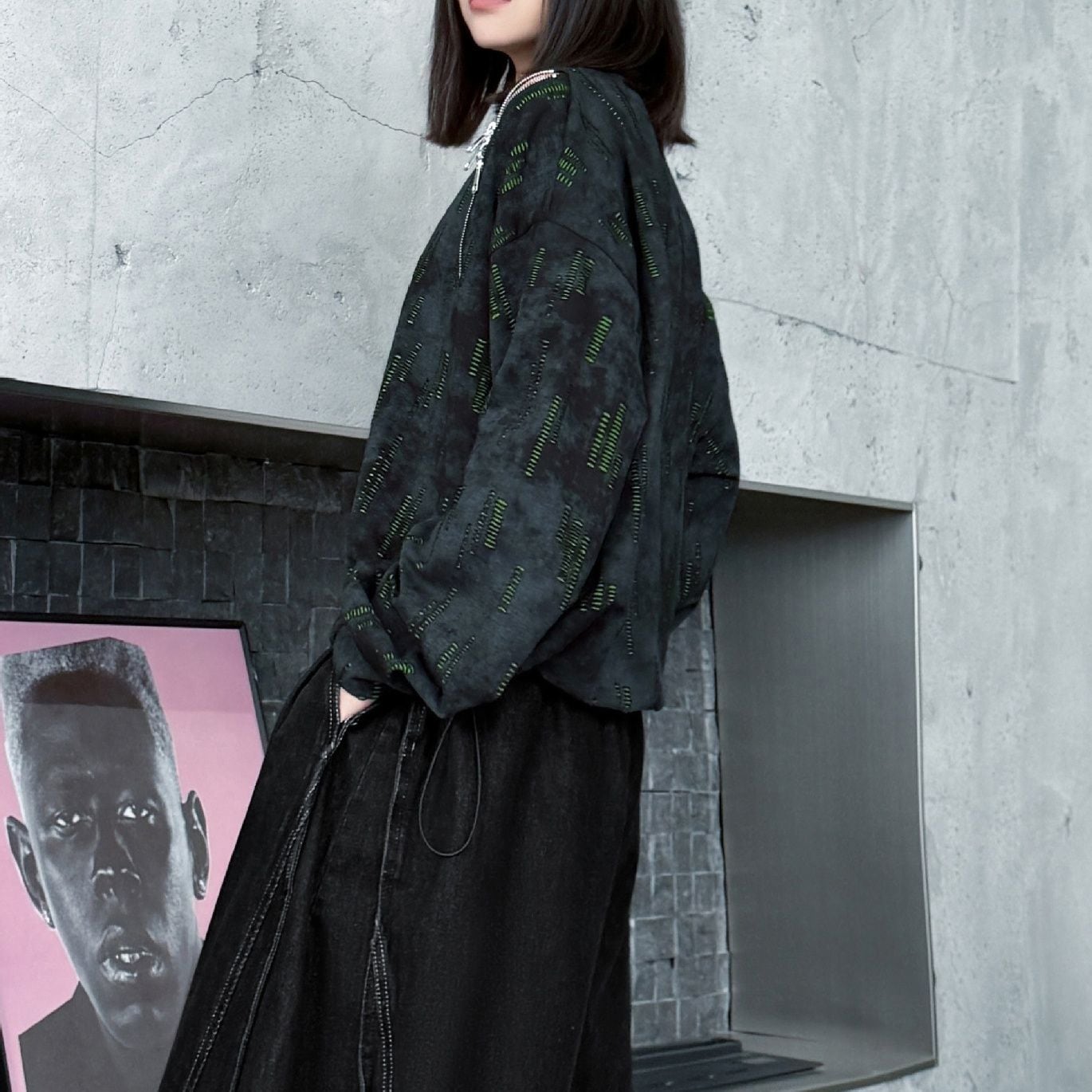 両肩の長さの異なるジップラインがアクセントになった、ラウンドネックのスウェットシャツです。ジップの開閉でデザインをアレンジできます。絞り染めのブラックにライムグリーンの加工がクールな、コーディネートのアクセントになるアイテムです。
