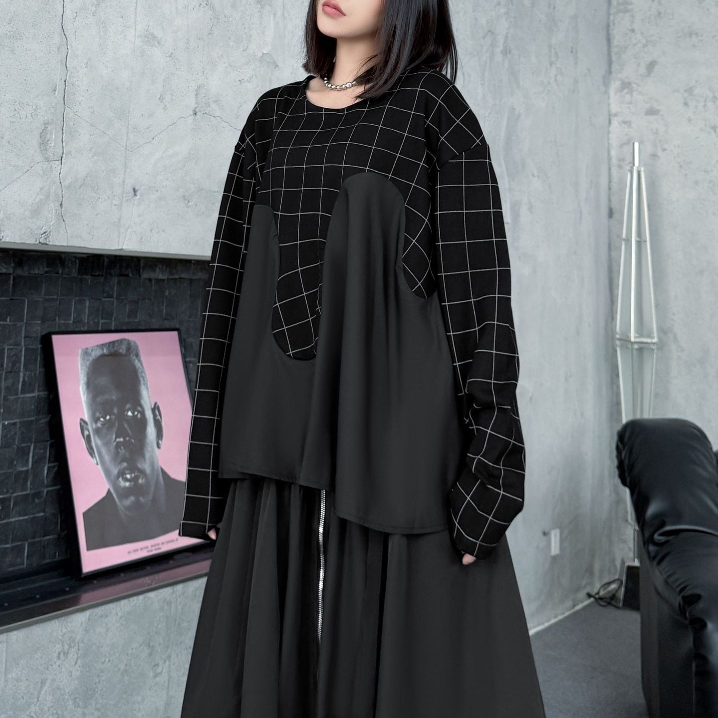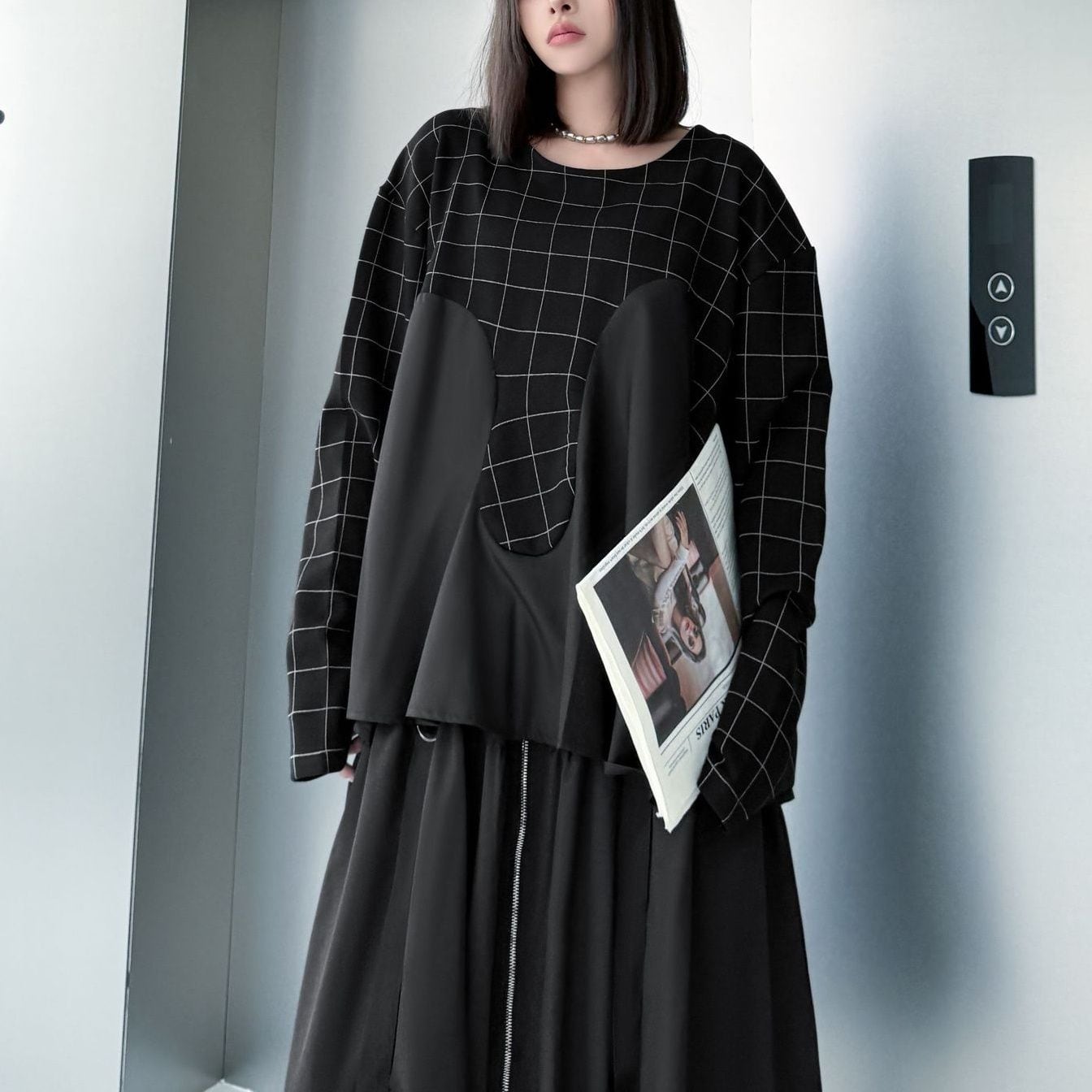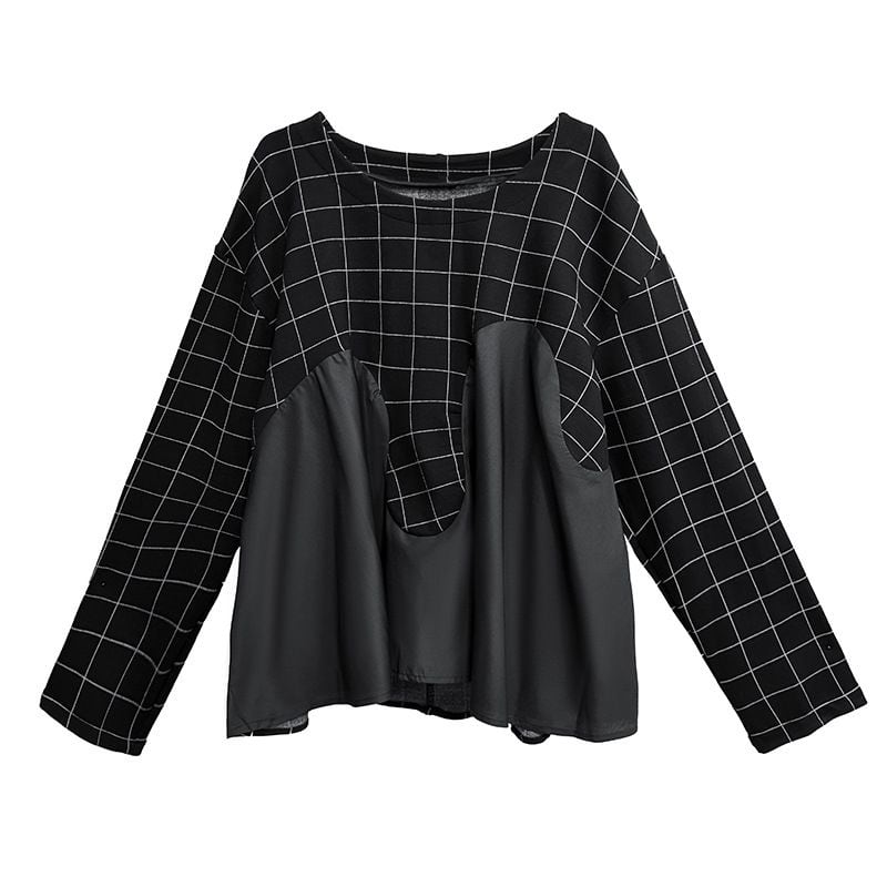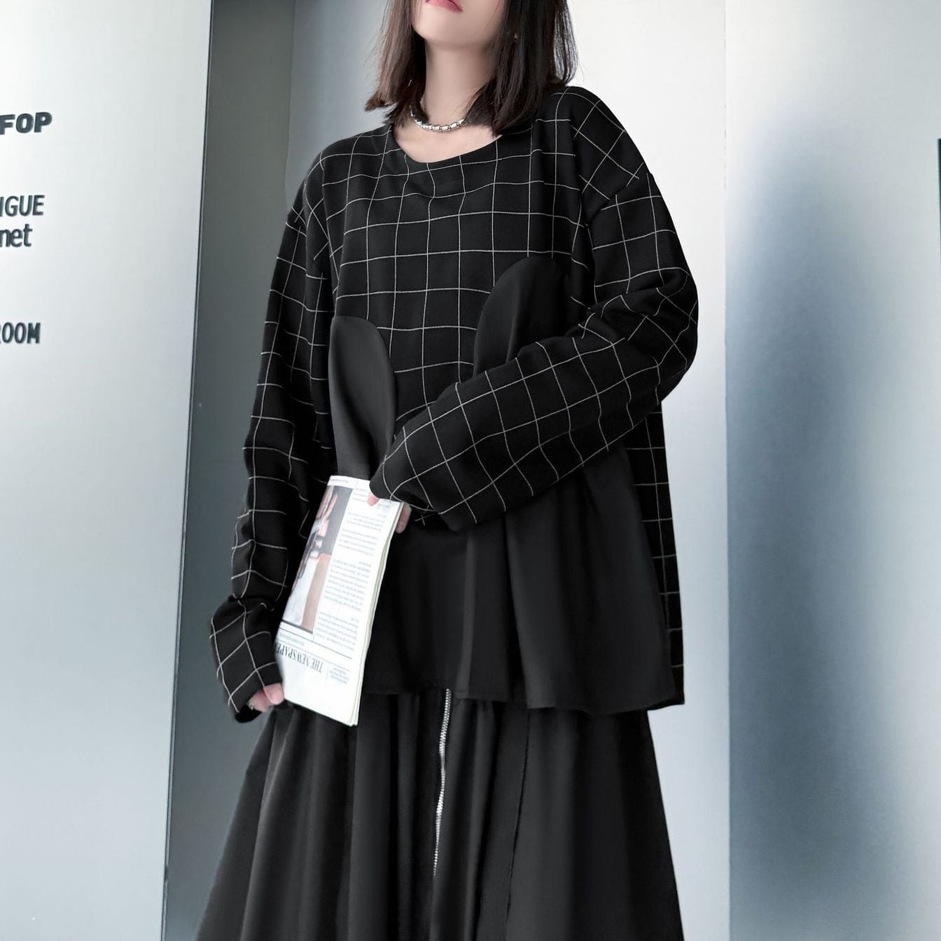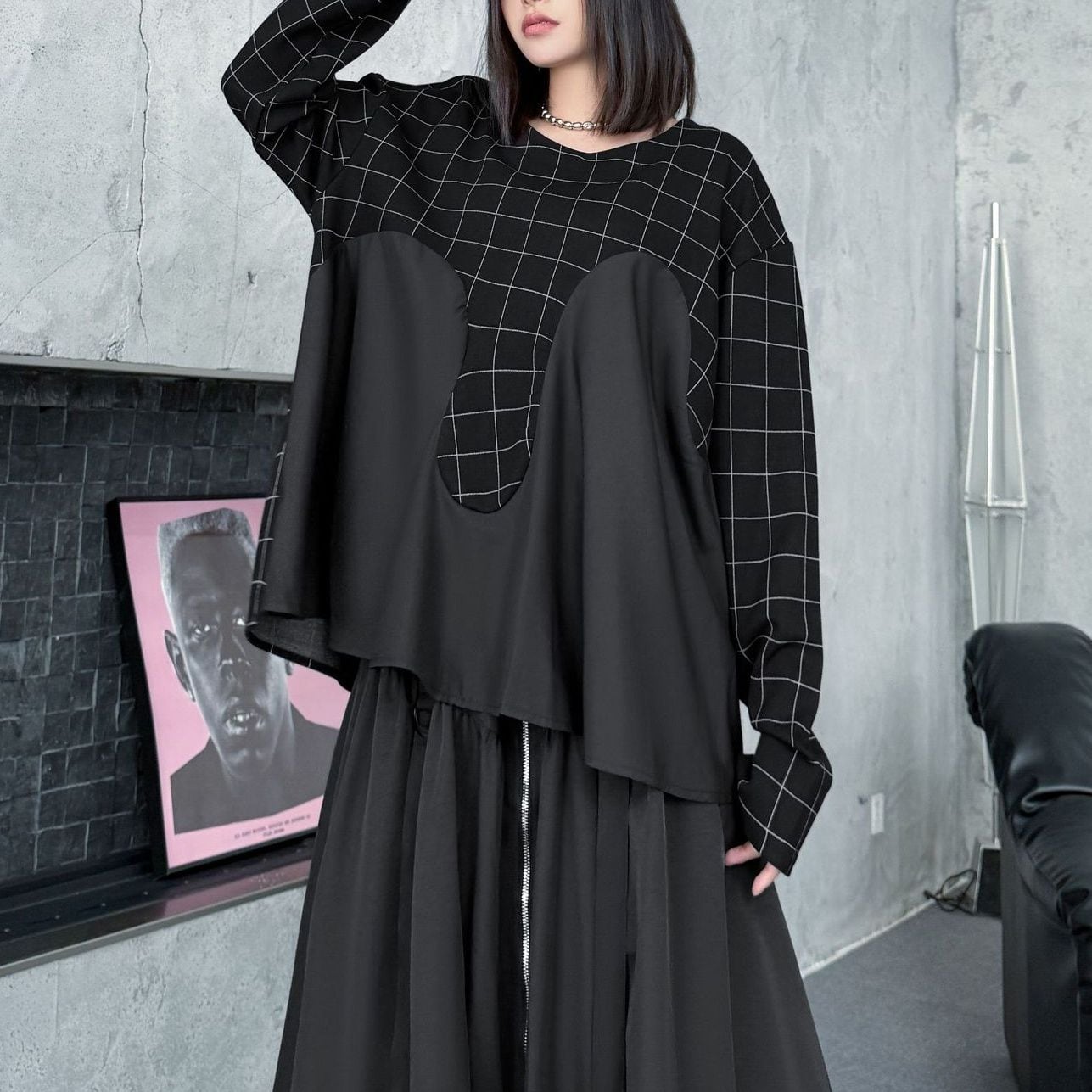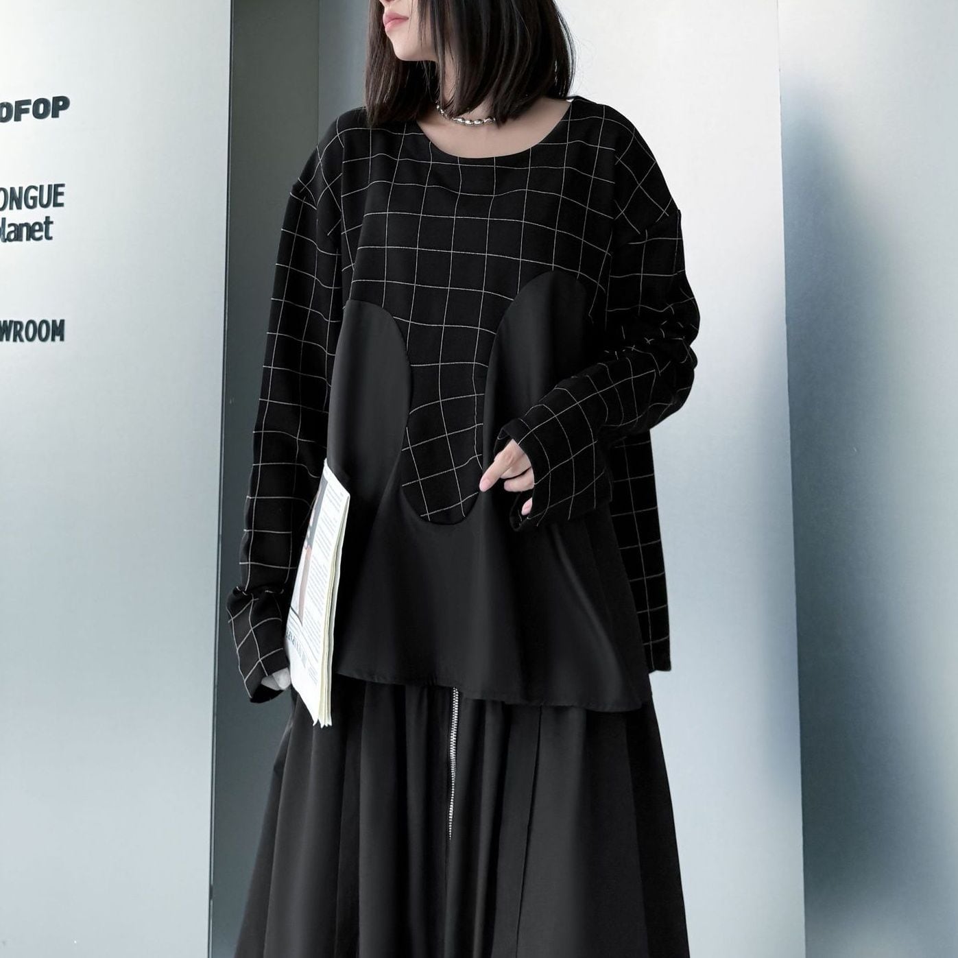 ブラックのチェック柄に無地のフリルのようなスティッチがキュートな、ボートネックの長袖Tシャツです。長めの袖にゆったりとしたAラインのシルエットが魅力的な、パンツにもスカートにも合わせやすいカジュアルアイテムです。
