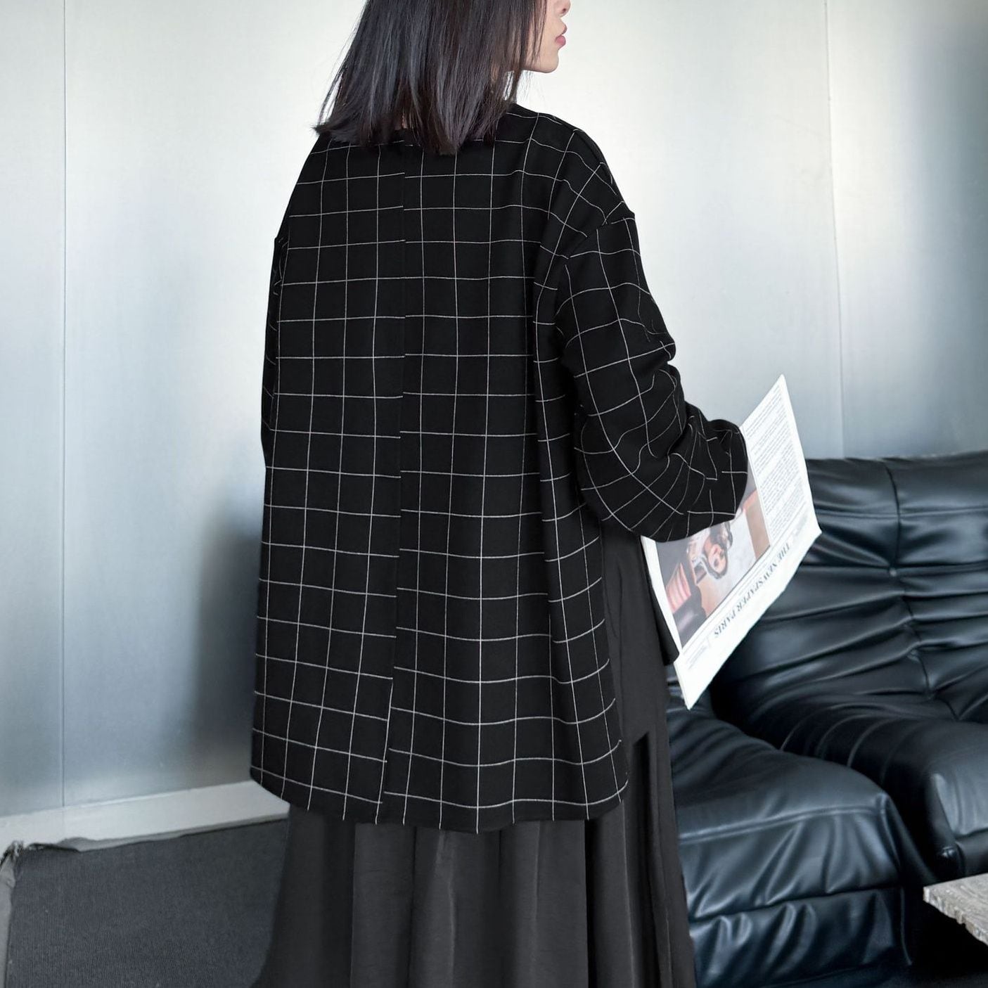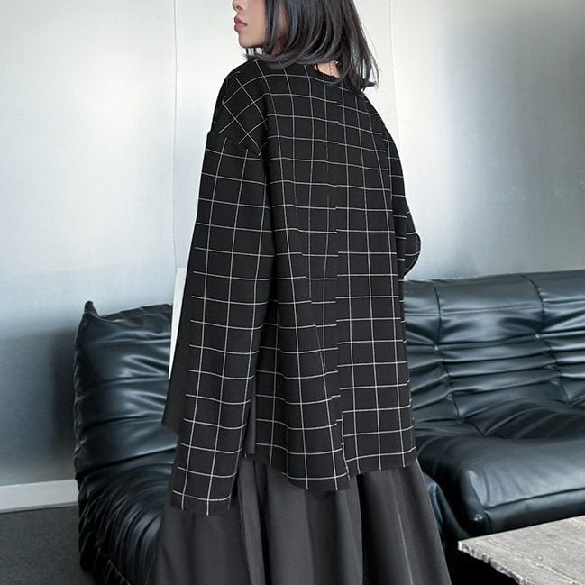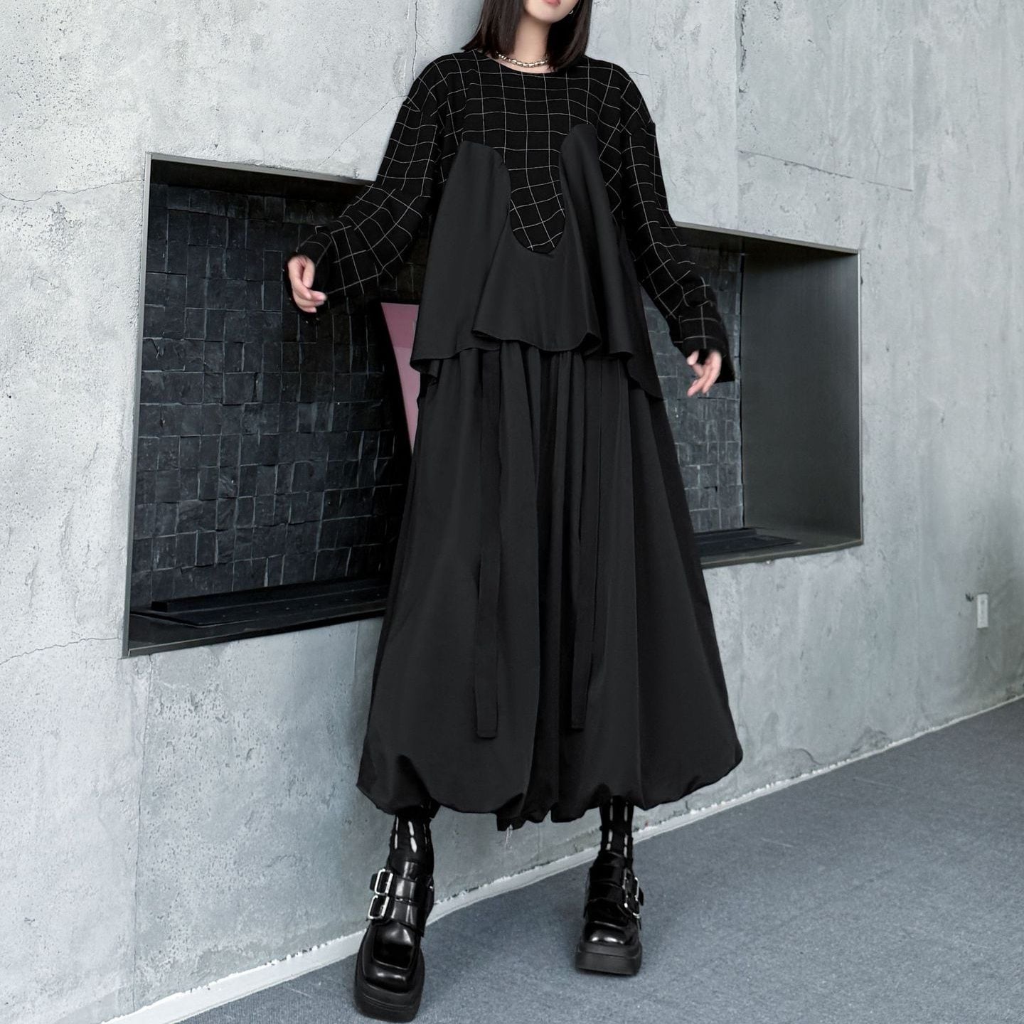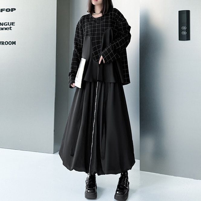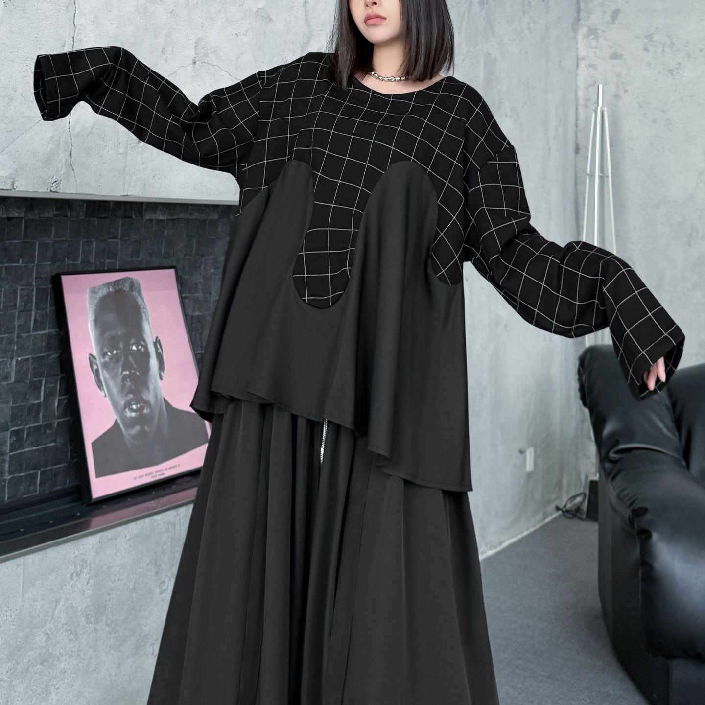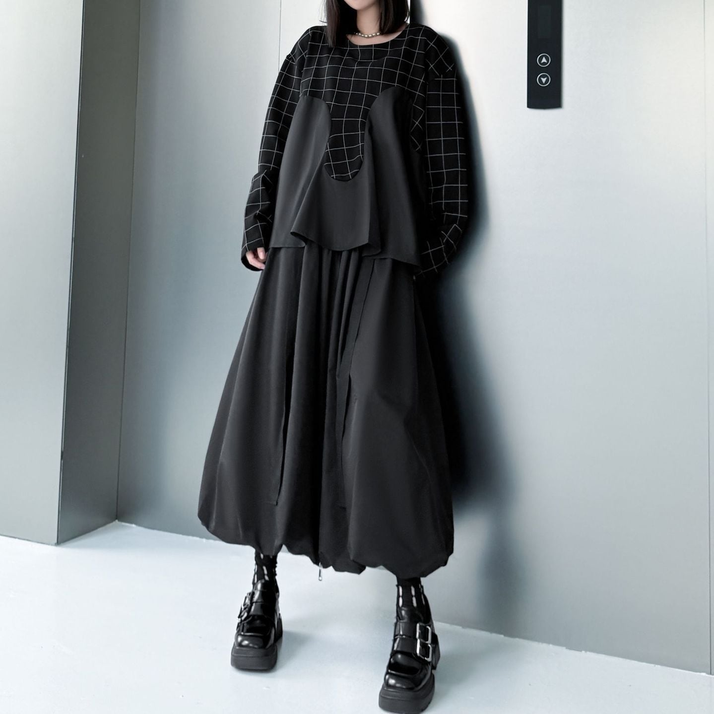 ブラックのチェック柄に無地のフリルのようなスティッチがキュートな、ボートネックの長袖Tシャツです。長めの袖にゆったりとしたAラインのシルエットが魅力的な、パンツにもスカートにも合わせやすいカジュアルアイテムです。
