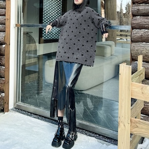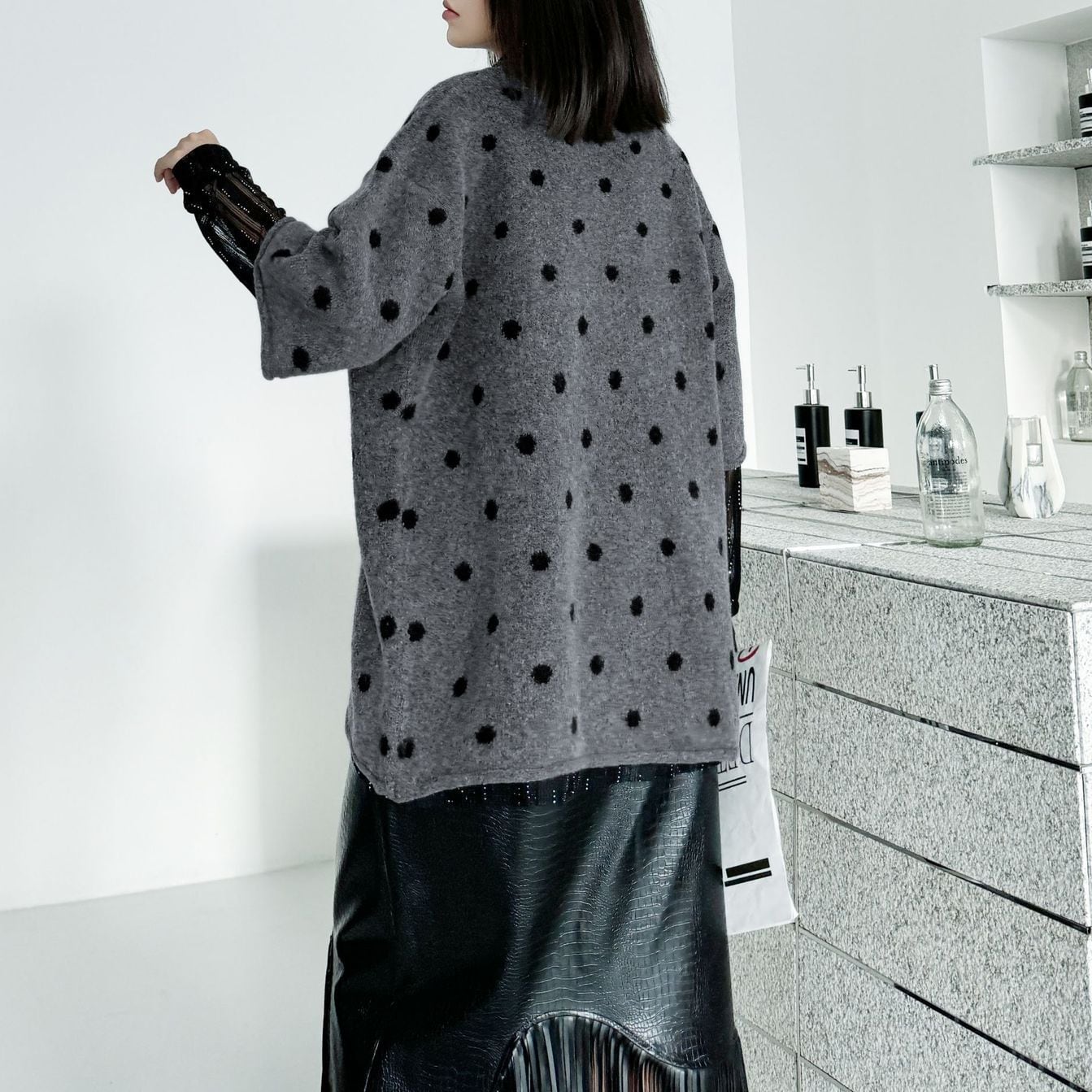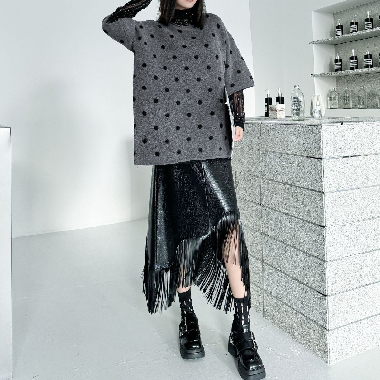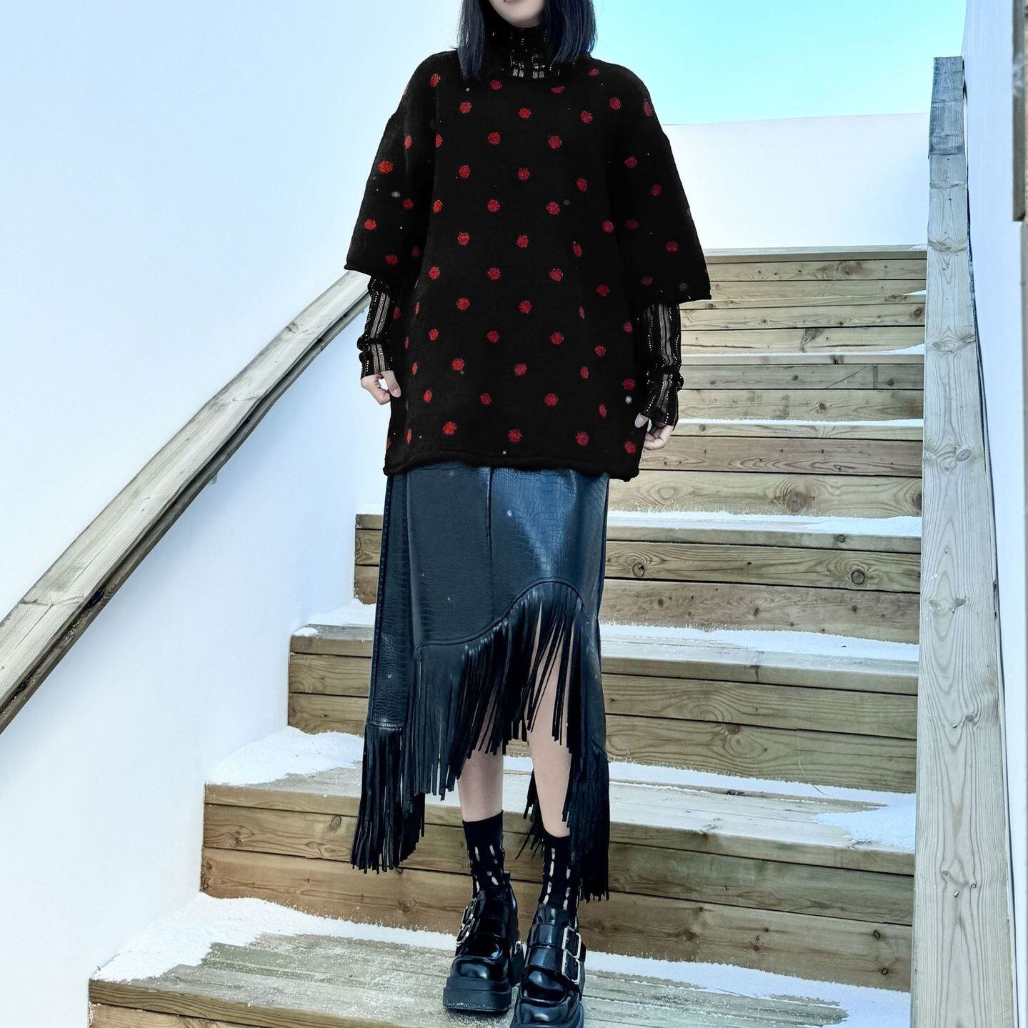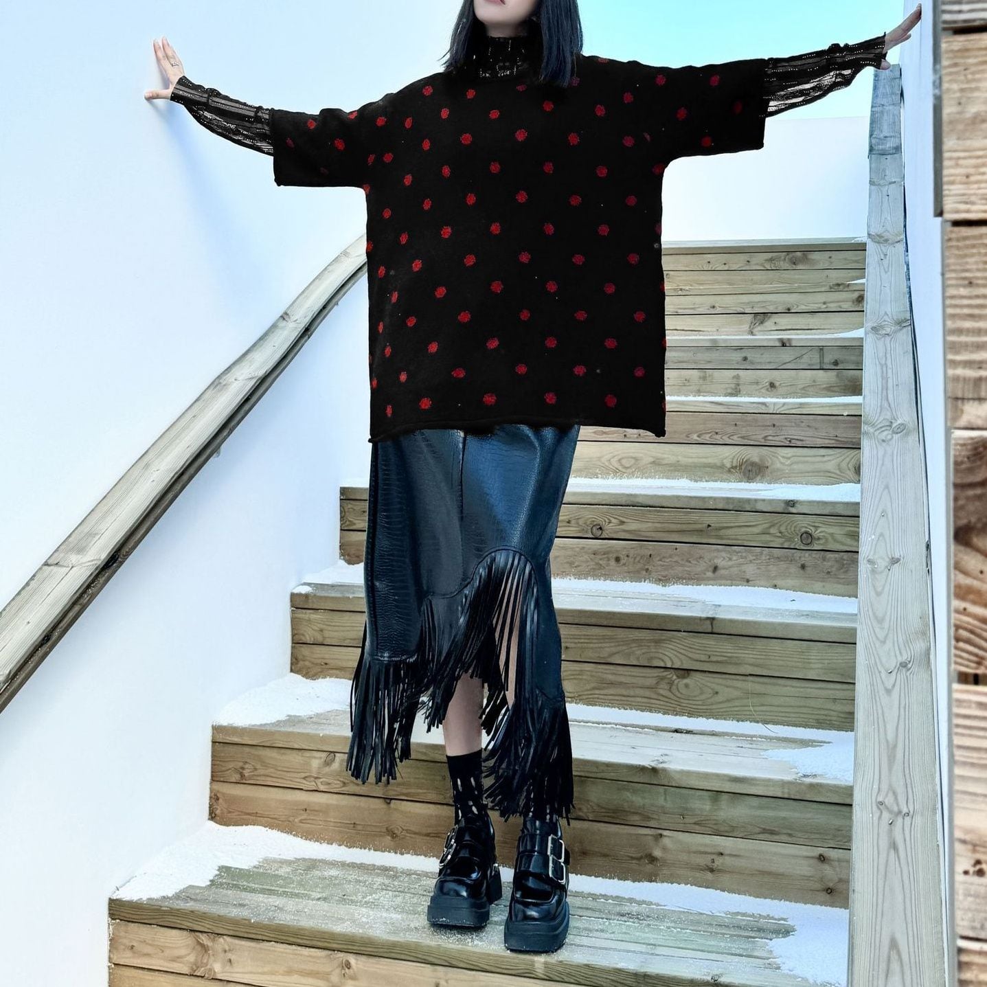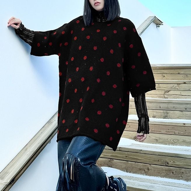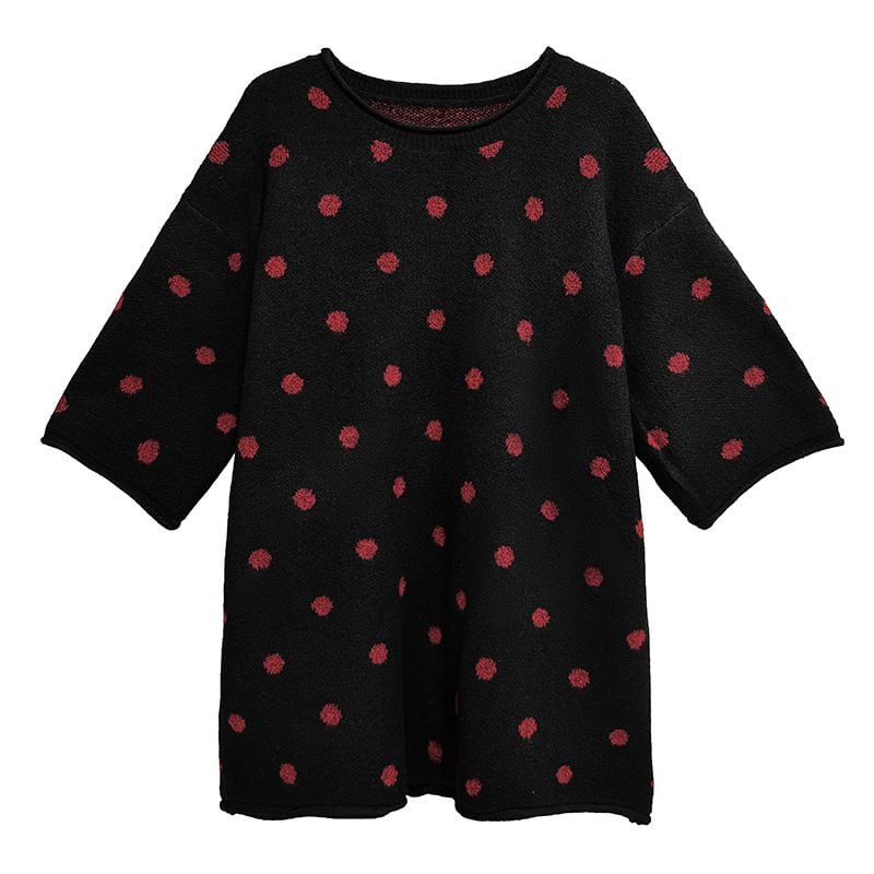 ドット柄がキュートな、ラウンドネック・半袖・チュニック丈のプルオーバーニットです。オーバーサイズのゆったりとしたシルエットで、重ね着しても着膨れしにくいです。ブラック×レッドとグレー×ブラックの2色から選べます。