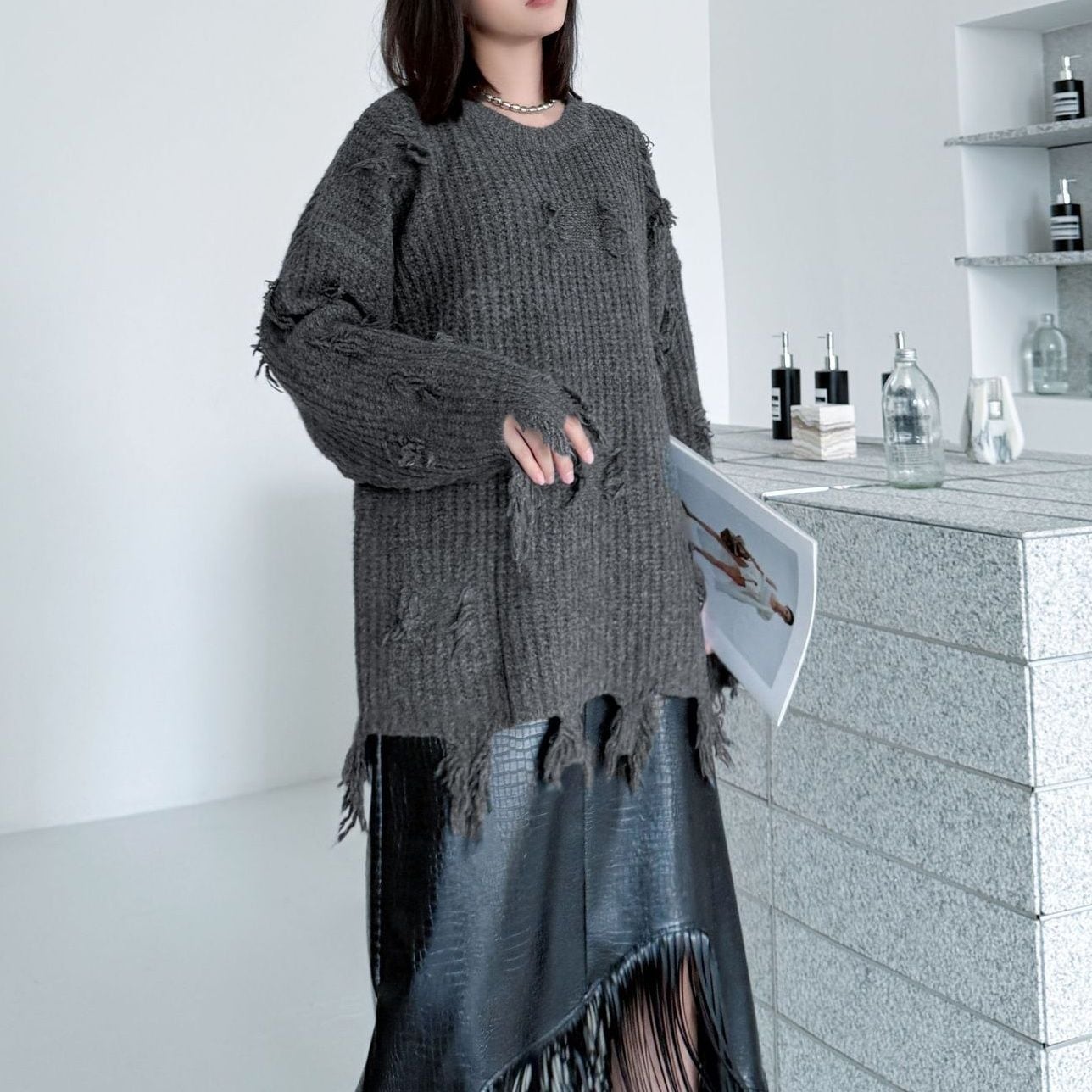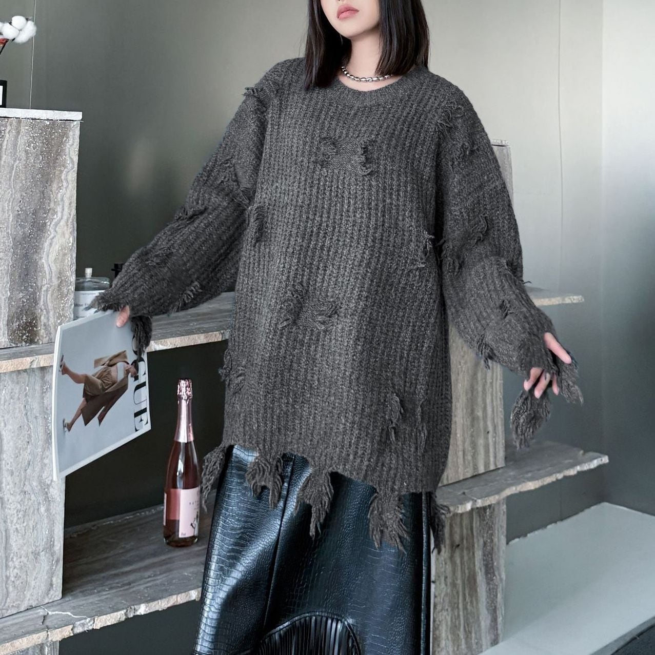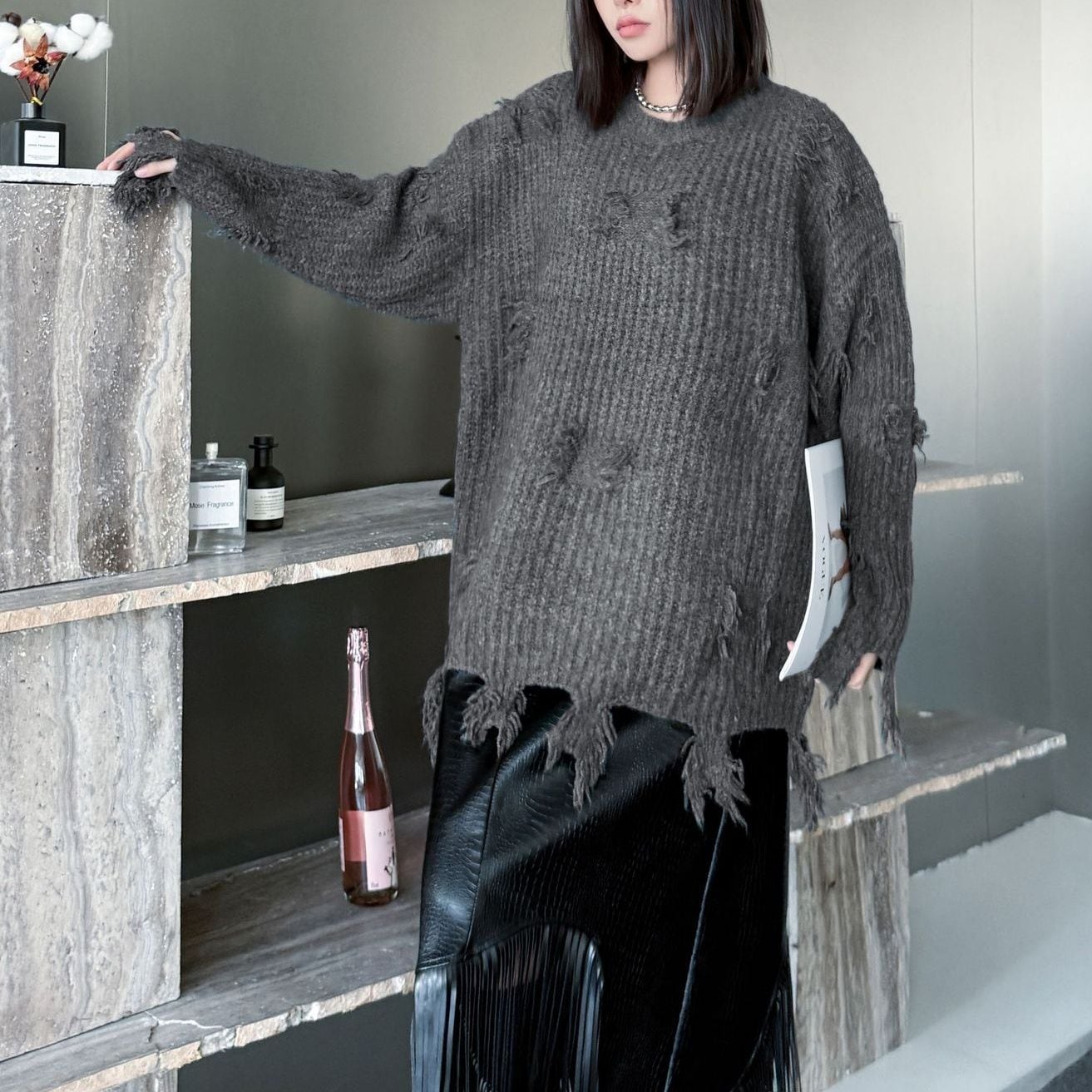 ダメージ加工やフリンジのような裾がお洒落な、ラウンドネック・長袖・チュニック丈のプルオーバーニットです。ゆったりとしたワイド幅のシルエットで、単色でコーディネートしやすいカジュアルアイテムです。ブラックとグレーの2色から選べます。