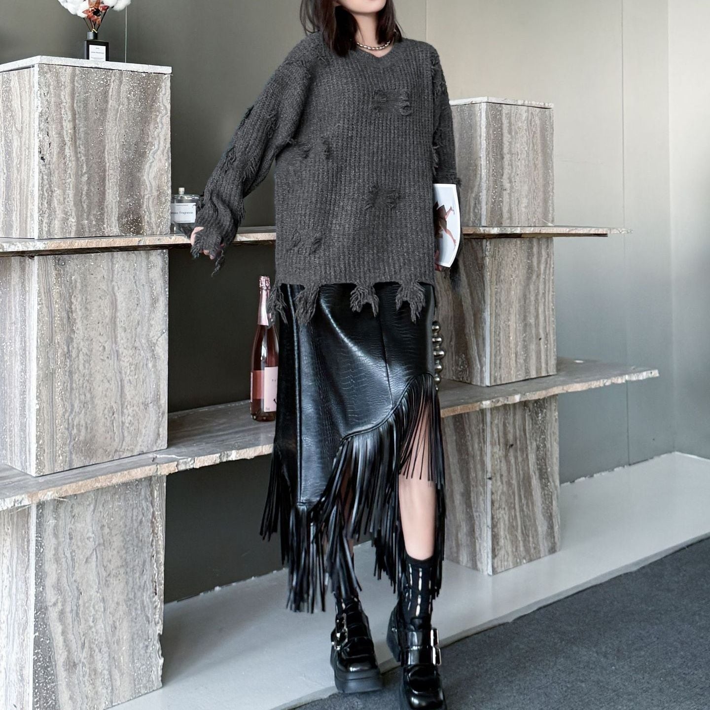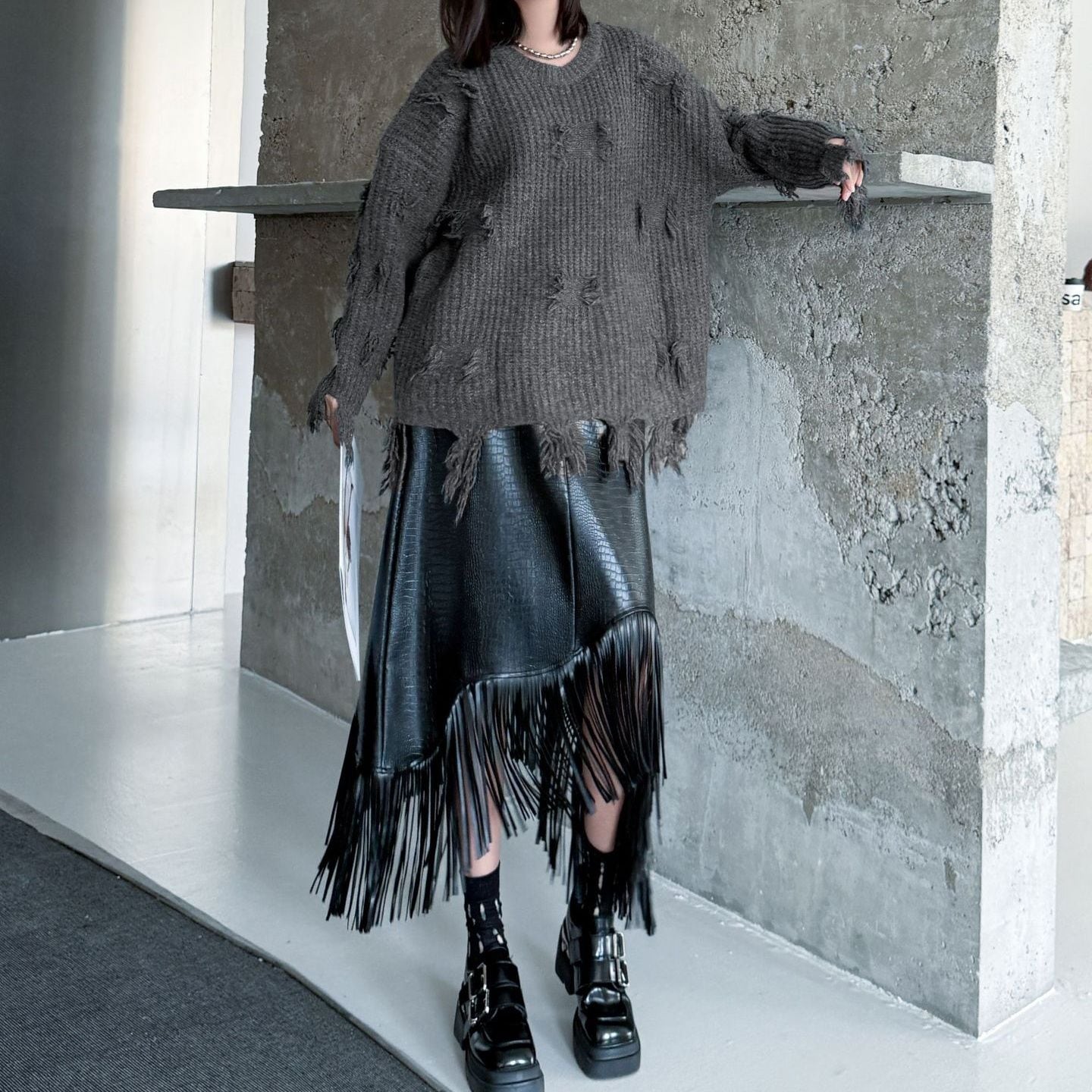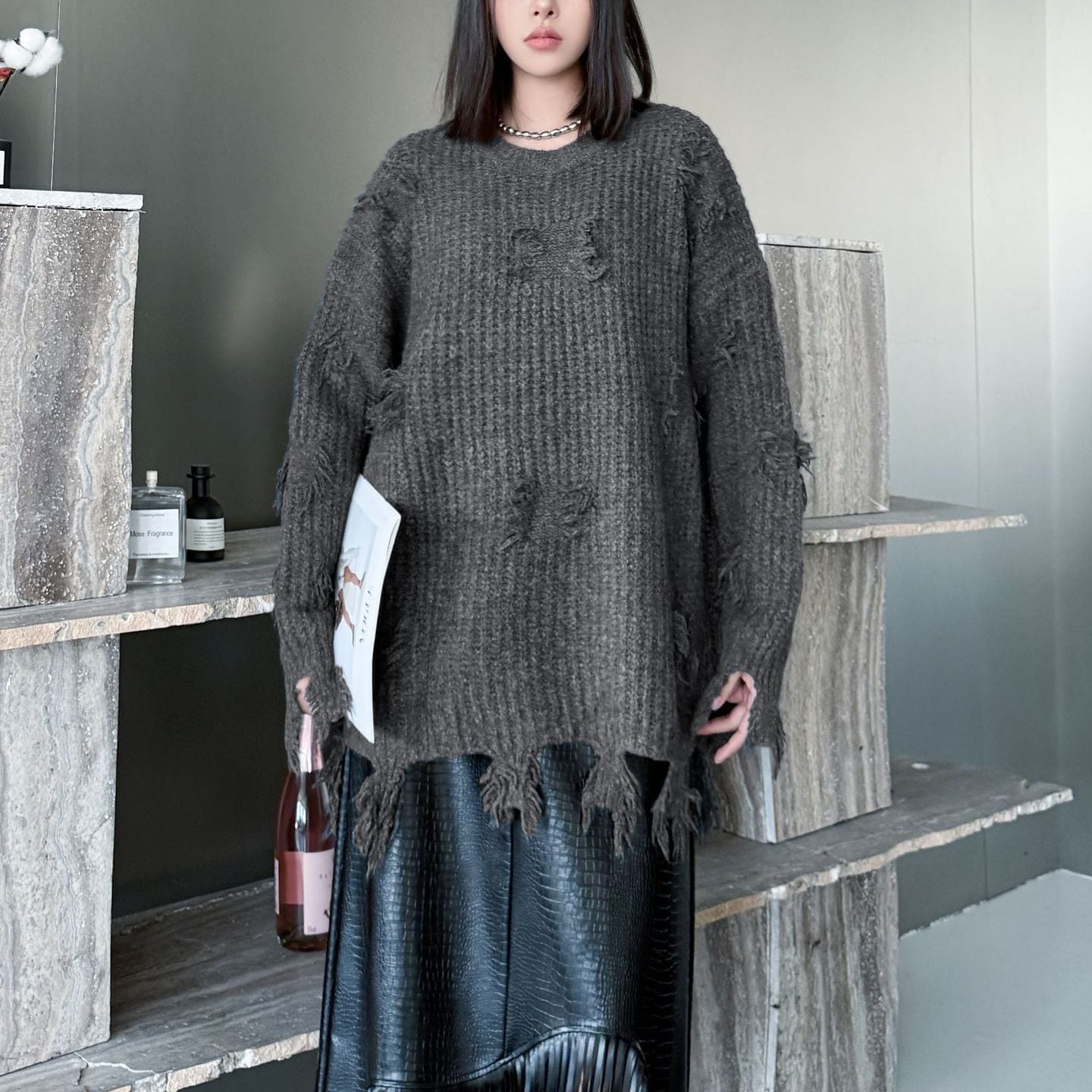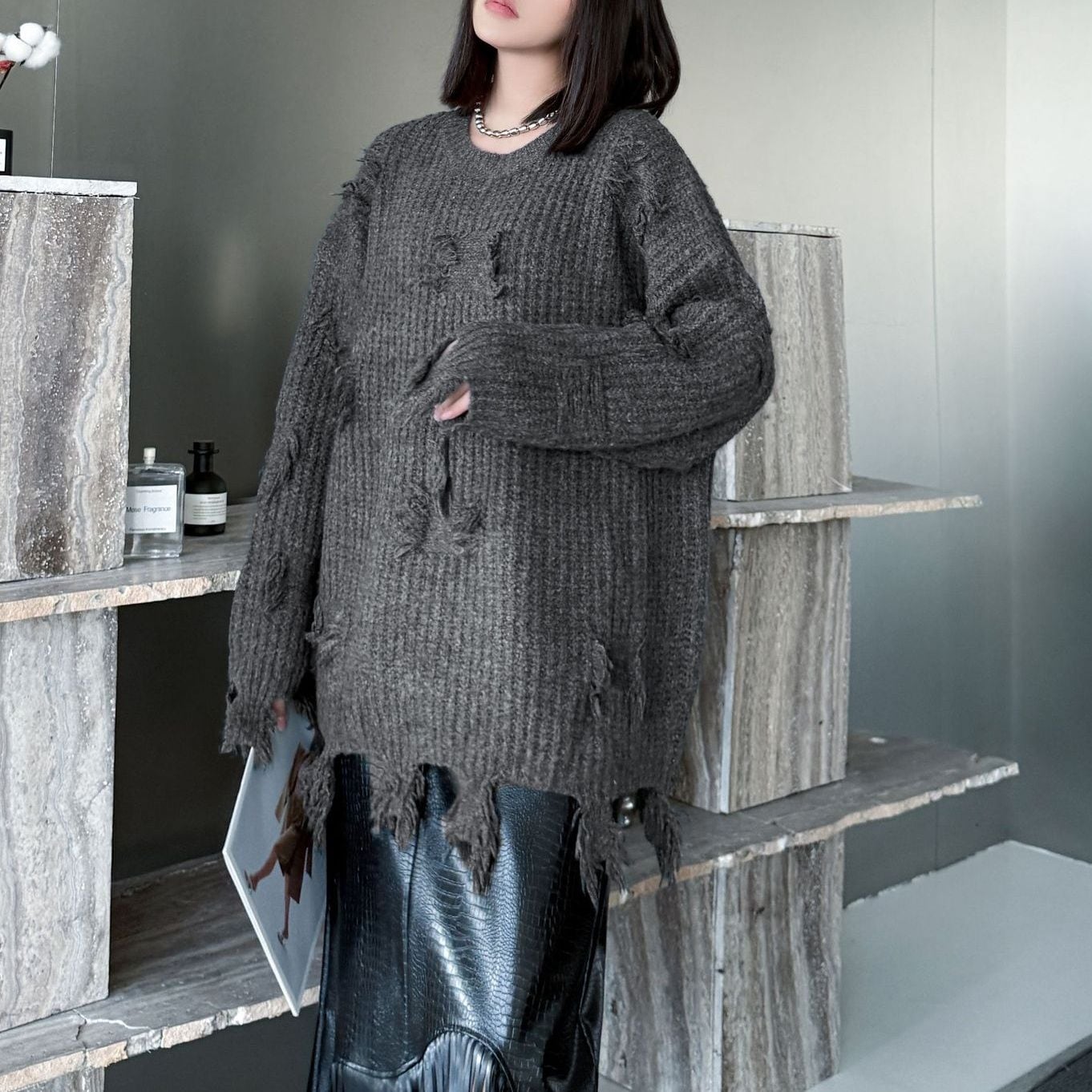 ダメージ加工やフリンジのような裾がお洒落な、ラウンドネック・長袖・チュニック丈のプルオーバーニットです。ゆったりとしたワイド幅のシルエットで、単色でコーディネートしやすいカジュアルアイテムです。ブラックとグレーの2色から選べます。