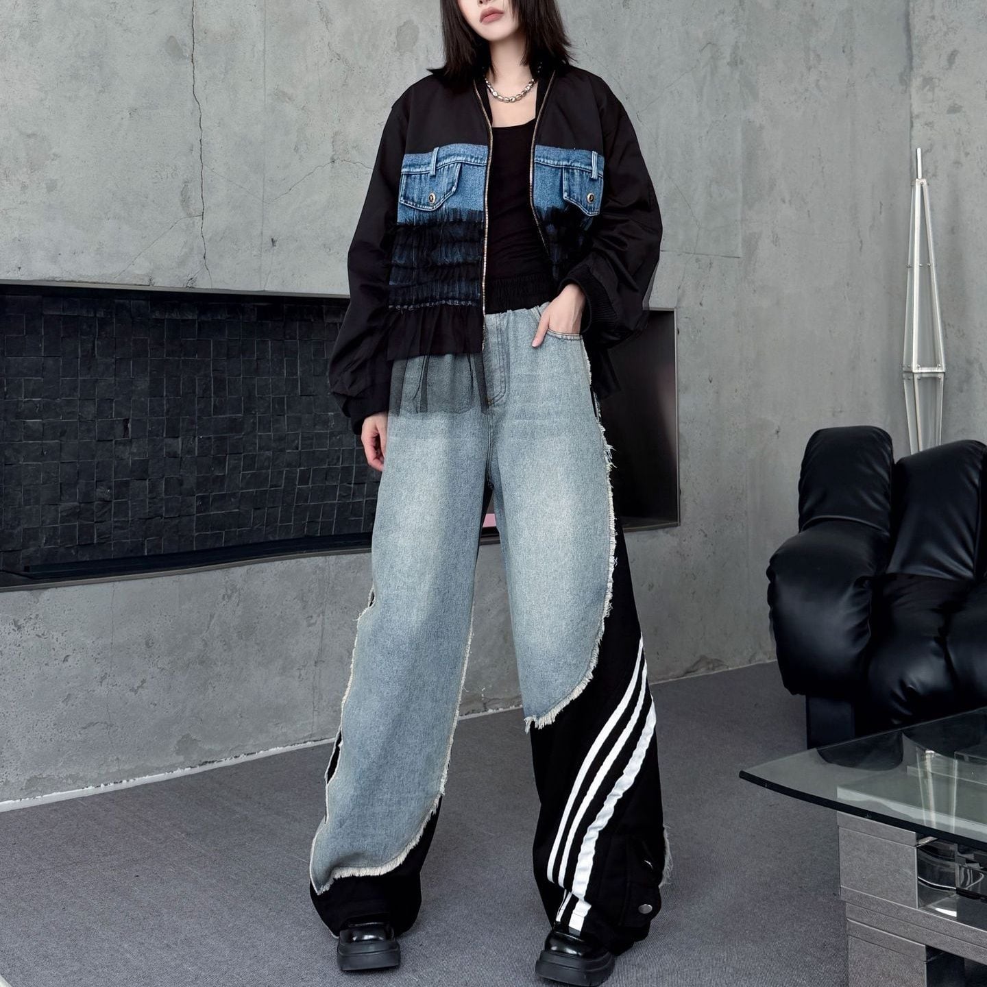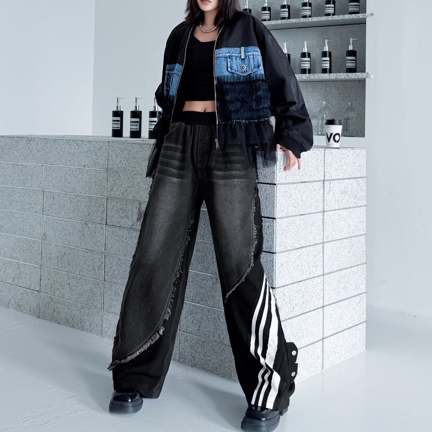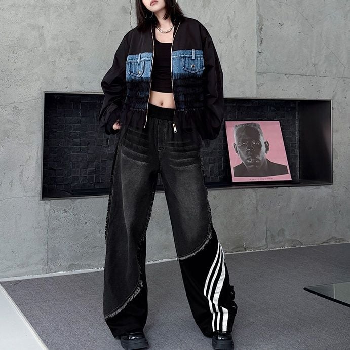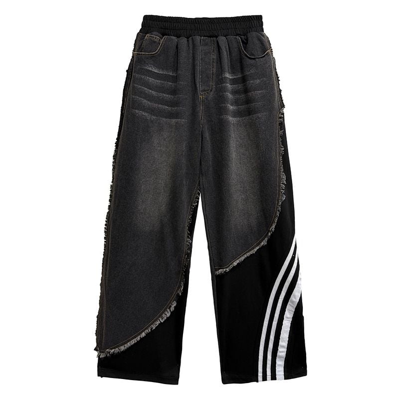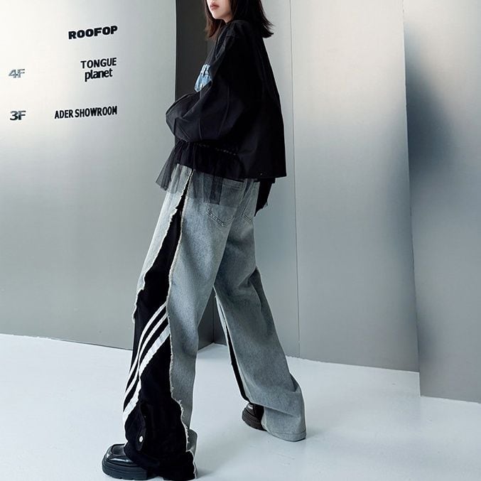 デニムとスポーティなラインの付いた素材のスティッチデザインがお洒落な、デザインパンツです。ウエストはゴムなので、着脱が簡単で履き心地が良いです。ハイライズのワイドレッグシルエットで、コーディネートの主役になる目を惹くアイテムです。ブラックとブルーの2色から選べます。