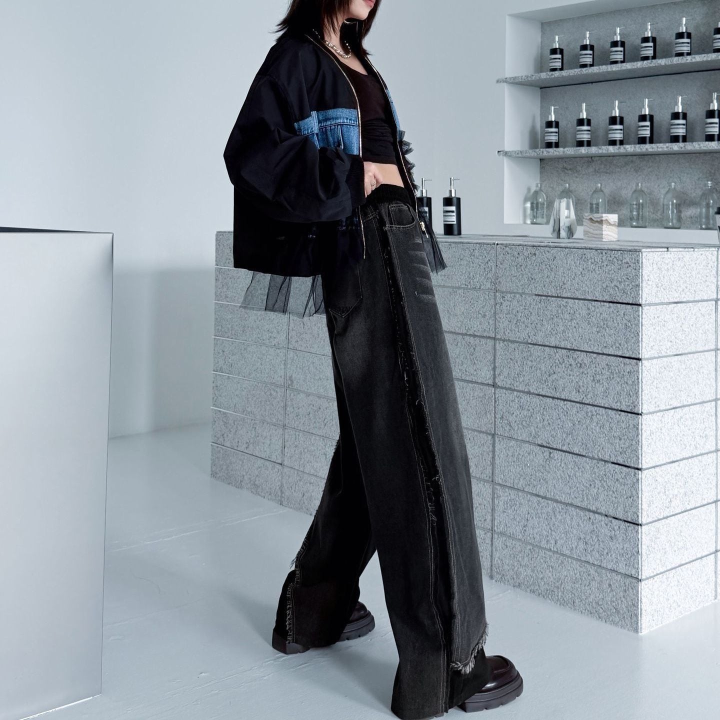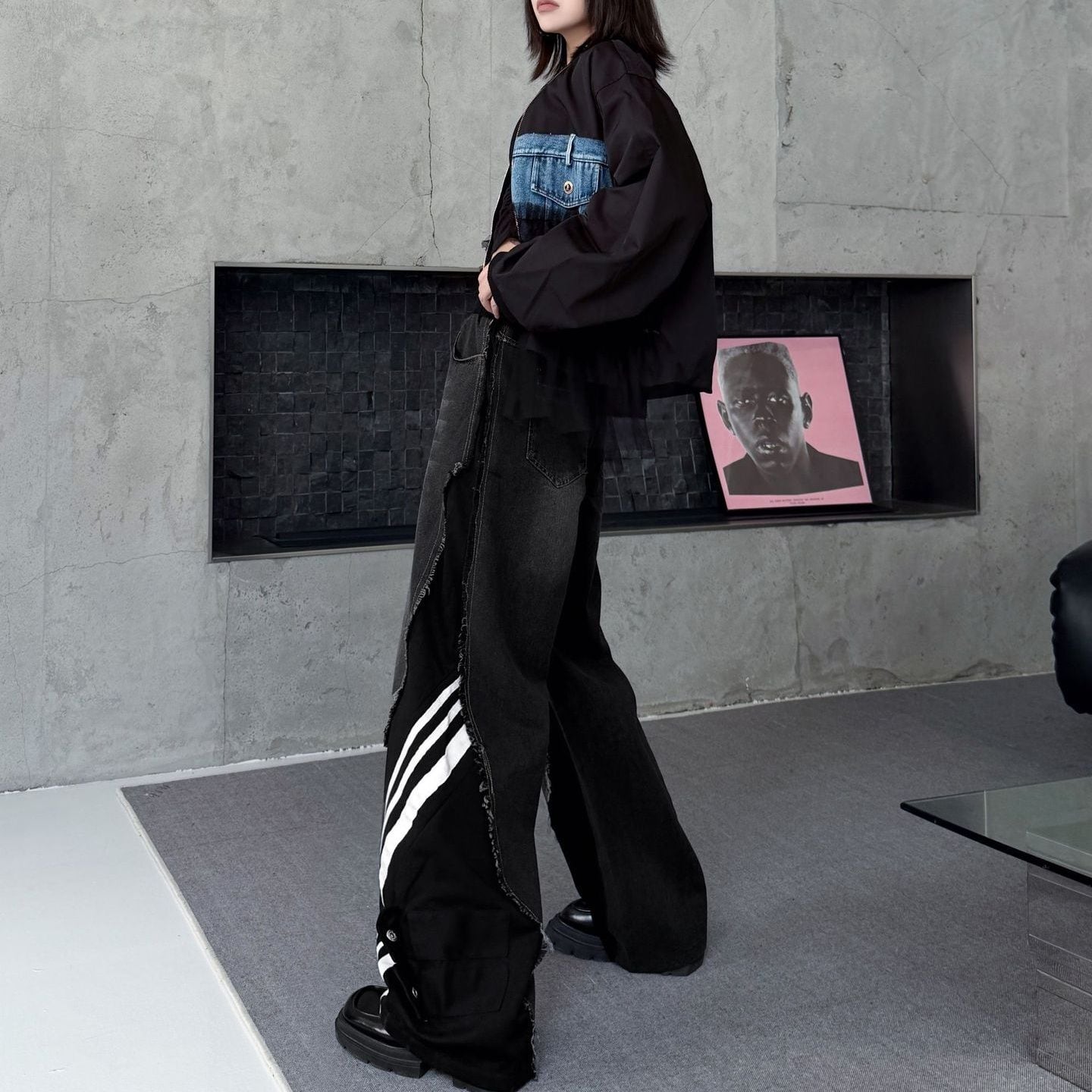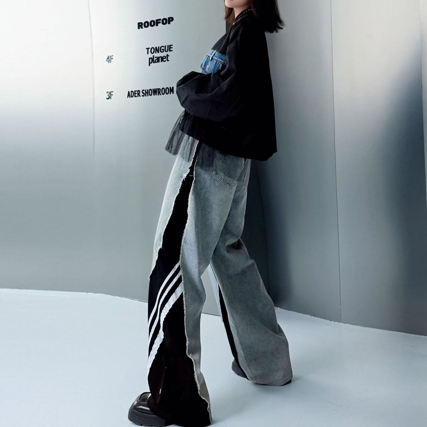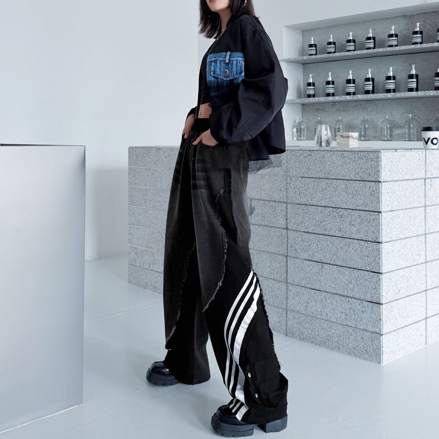 デニムとスポーティなラインの付いた素材のスティッチデザインがお洒落な、デザインパンツです。ウエストはゴムなので、着脱が簡単で履き心地が良いです。ハイライズのワイドレッグシルエットで、コーディネートの主役になる目を惹くアイテムです。ブラックとブルーの2色から選べます。