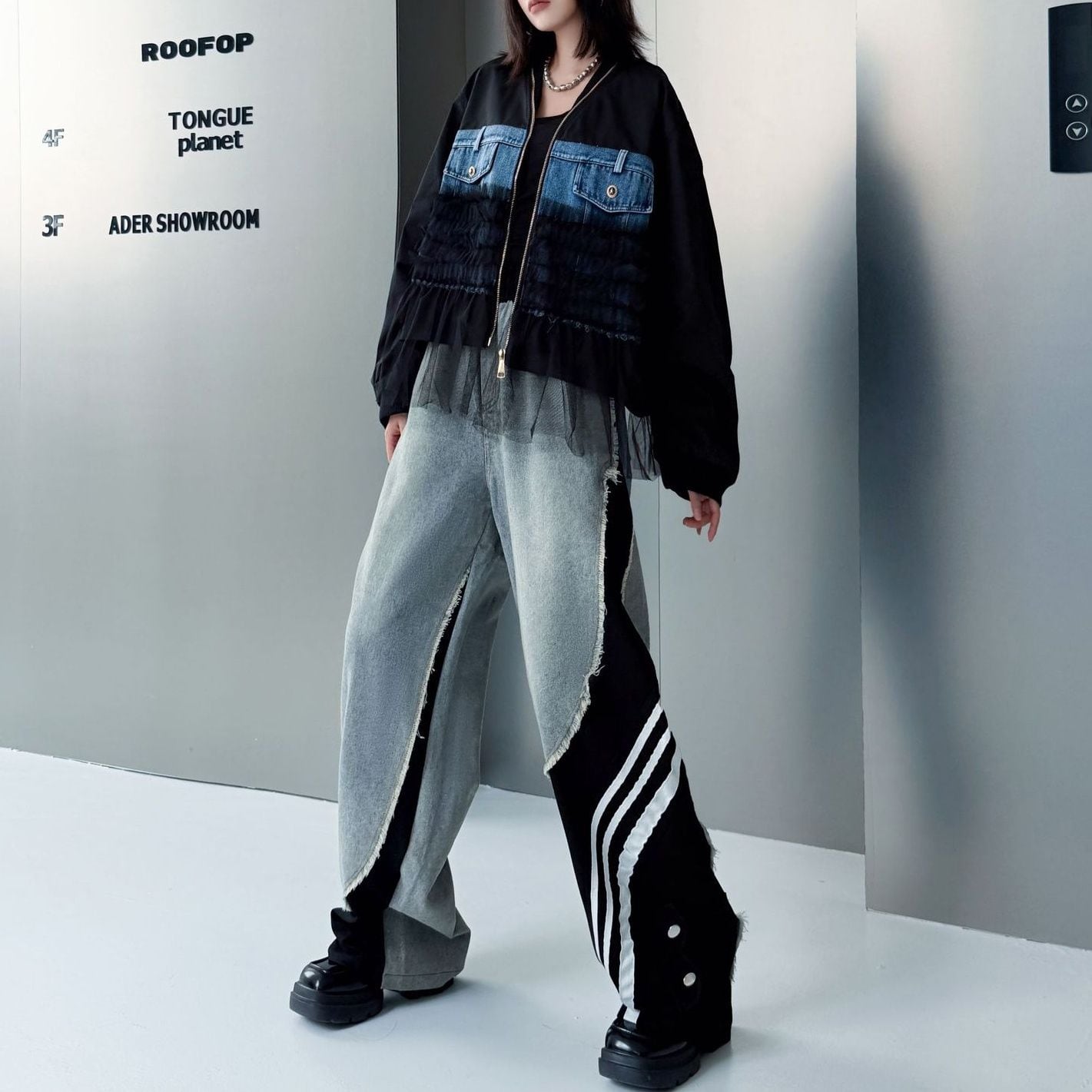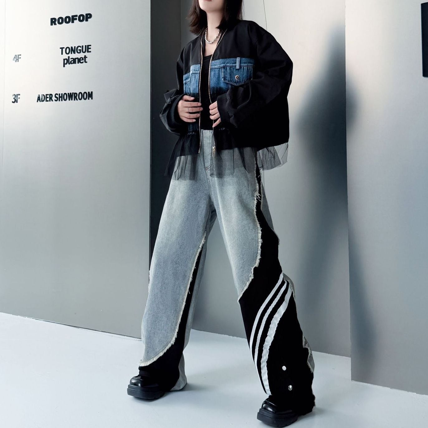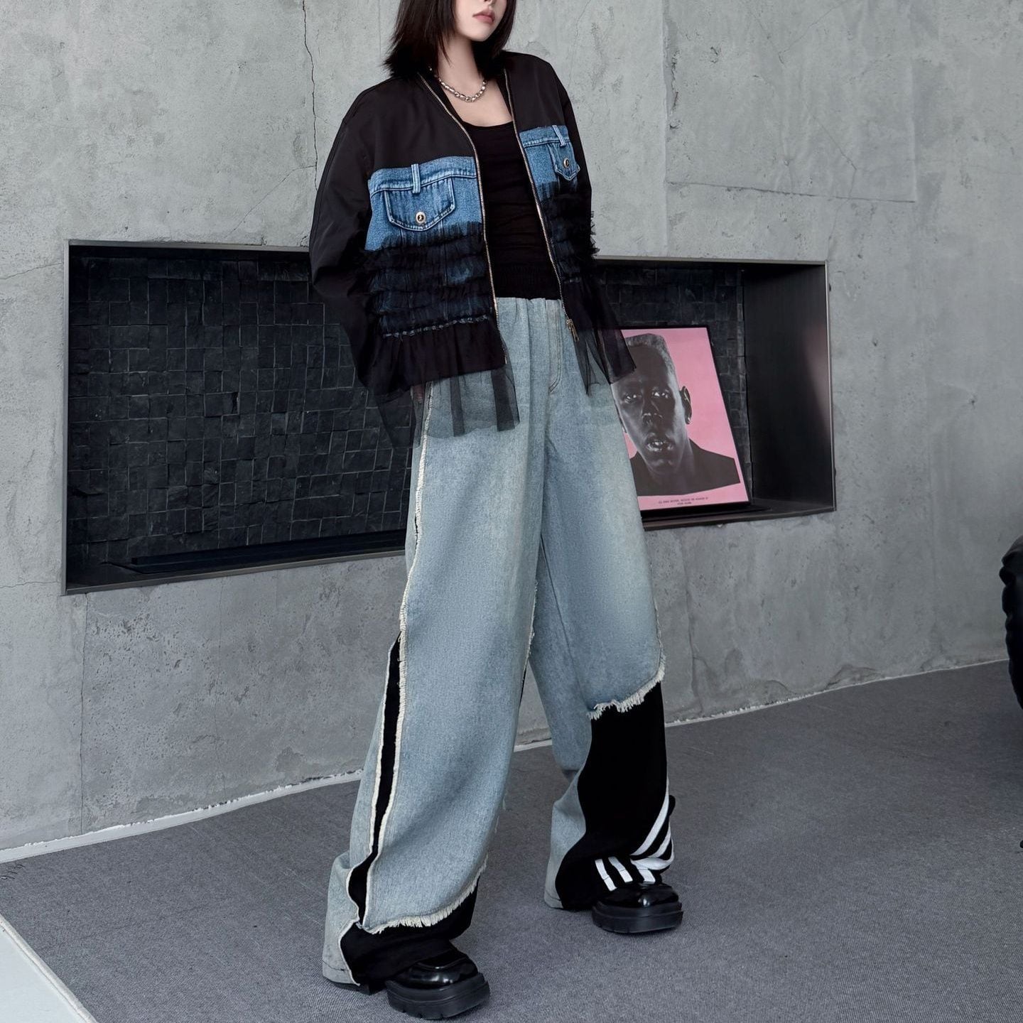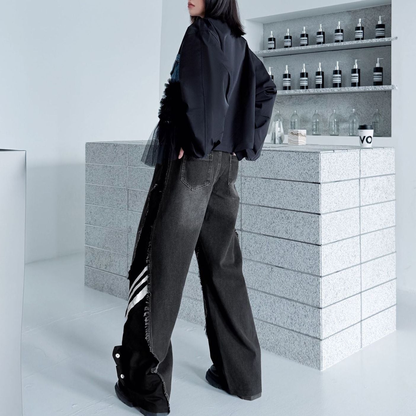 デニムとスポーティなラインの付いた素材のスティッチデザインがお洒落な、デザインパンツです。ウエストはゴムなので、着脱が簡単で履き心地が良いです。ハイライズのワイドレッグシルエットで、コーディネートの主役になる目を惹くアイテムです。ブラックとブルーの2色から選べます。