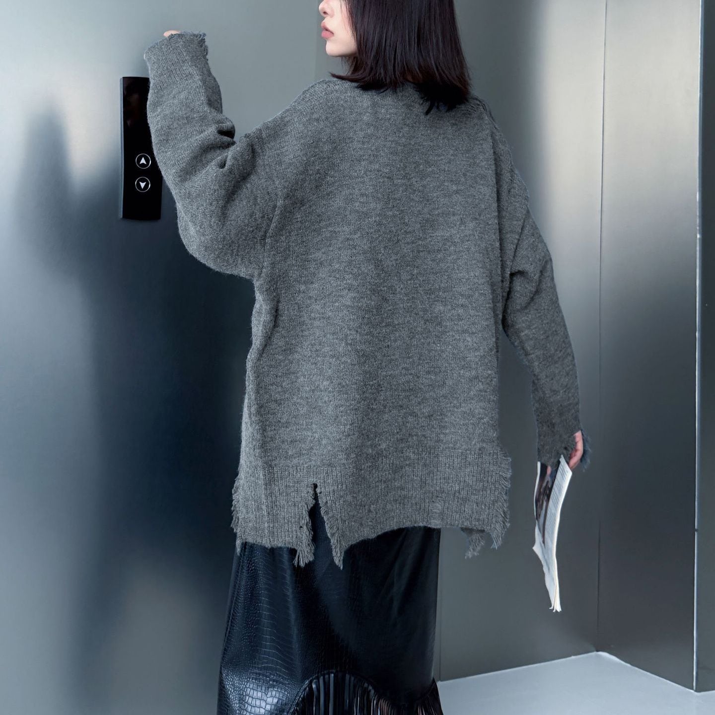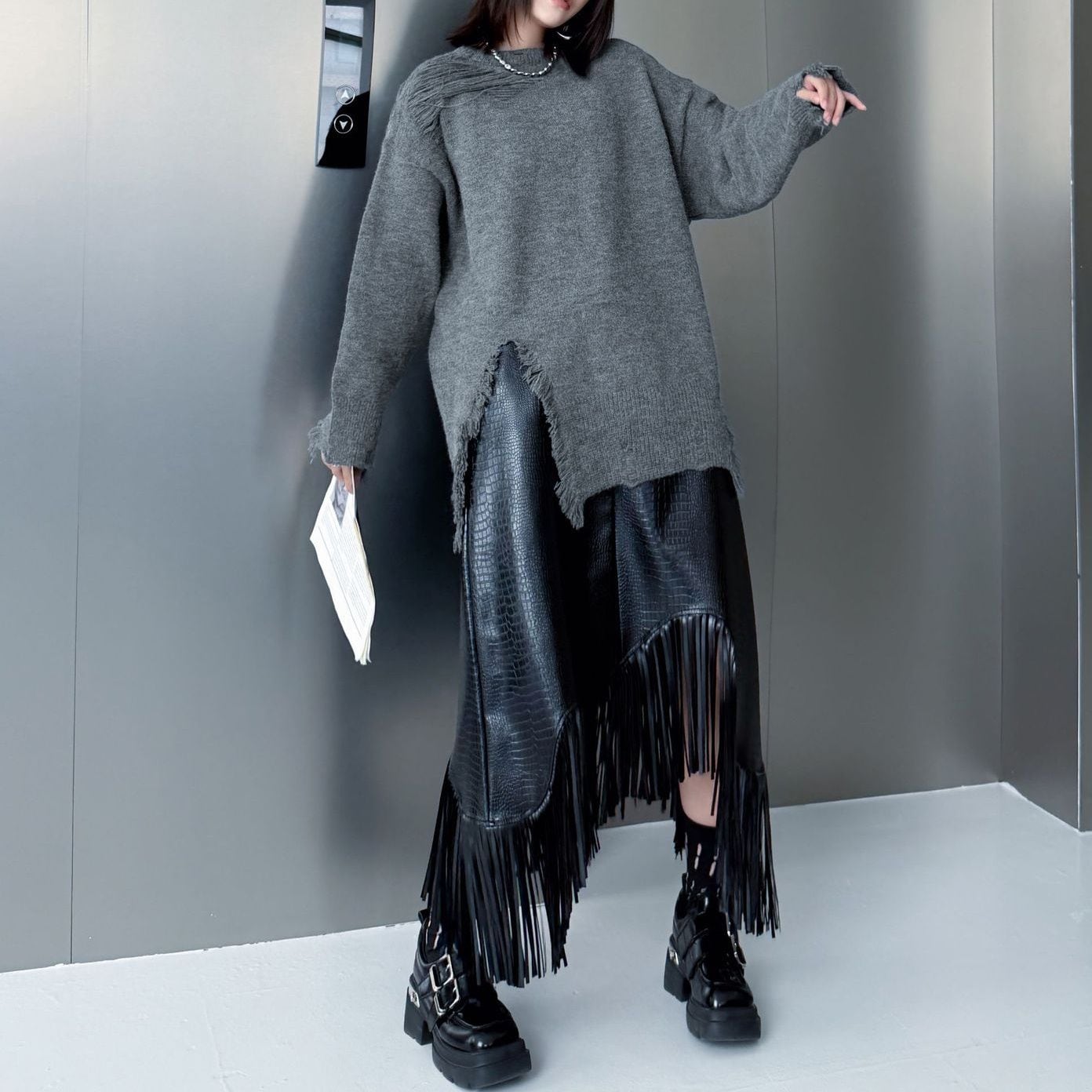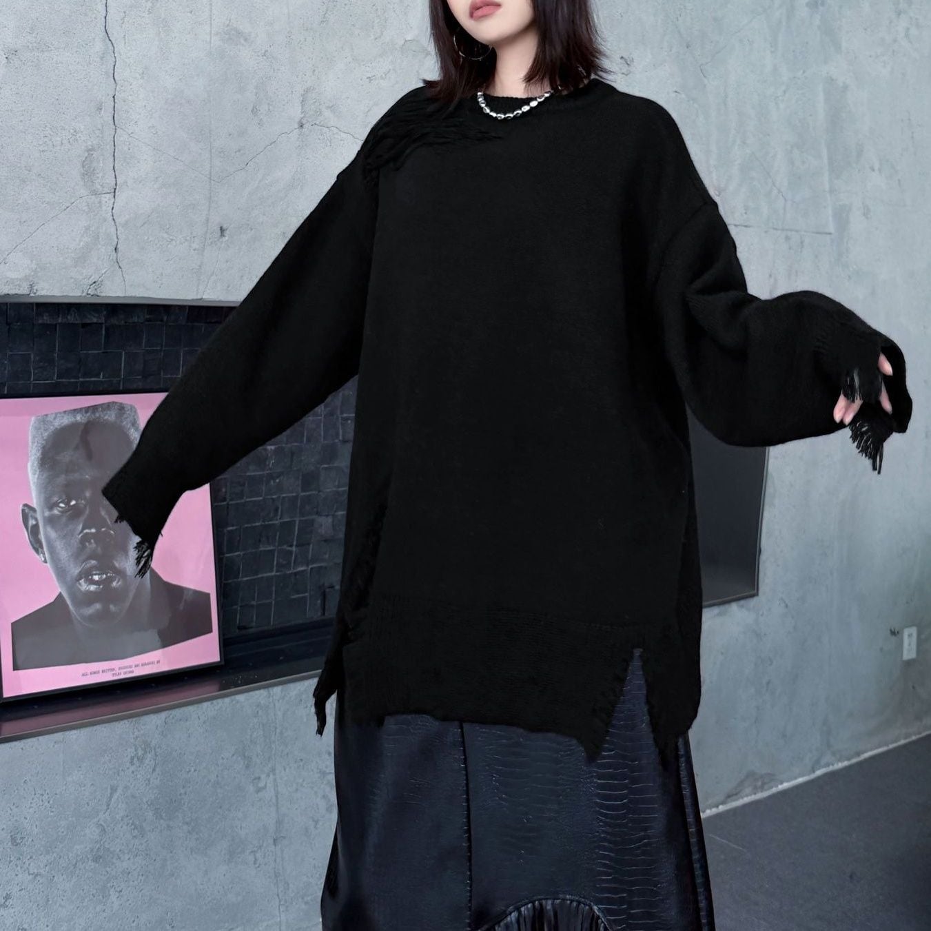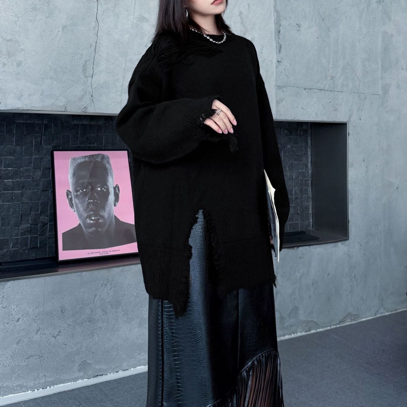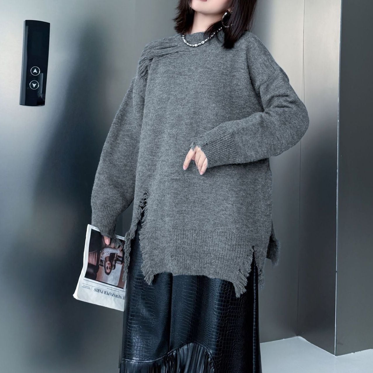フリンジ加工された複数のスリットが目を惹く、ラウンドネック・長袖・チュニック丈のプルオーバーニットです。単色のゆったりとしたシルエットで合わせやすい、お洒落なカジュアルアイテムです。ブラックとグレーの2色から選べます。