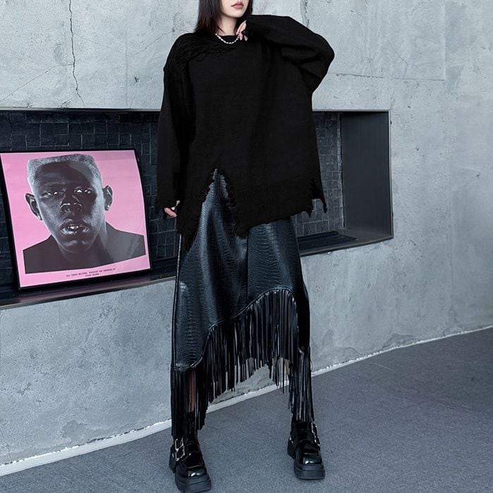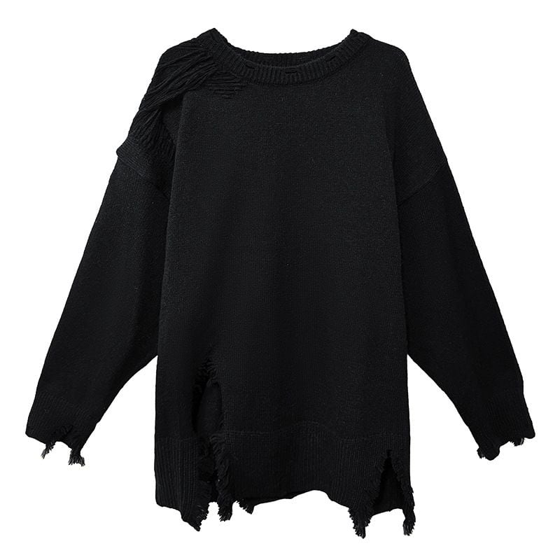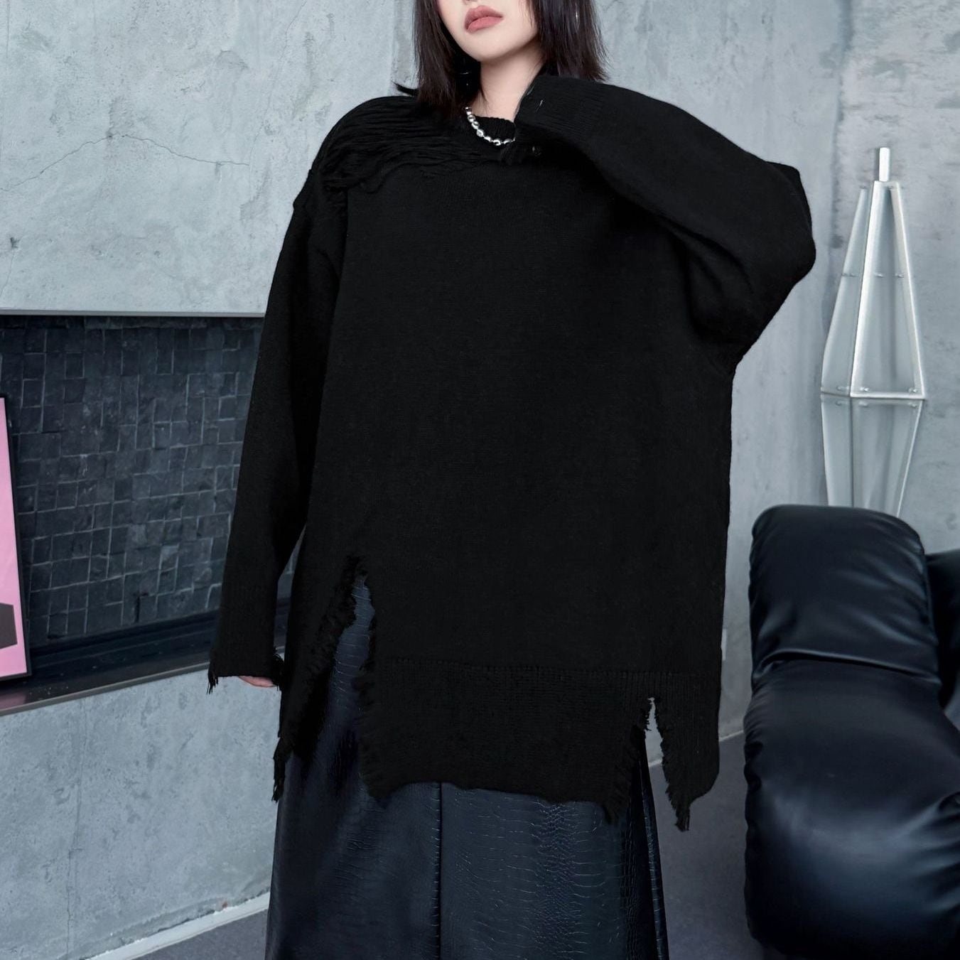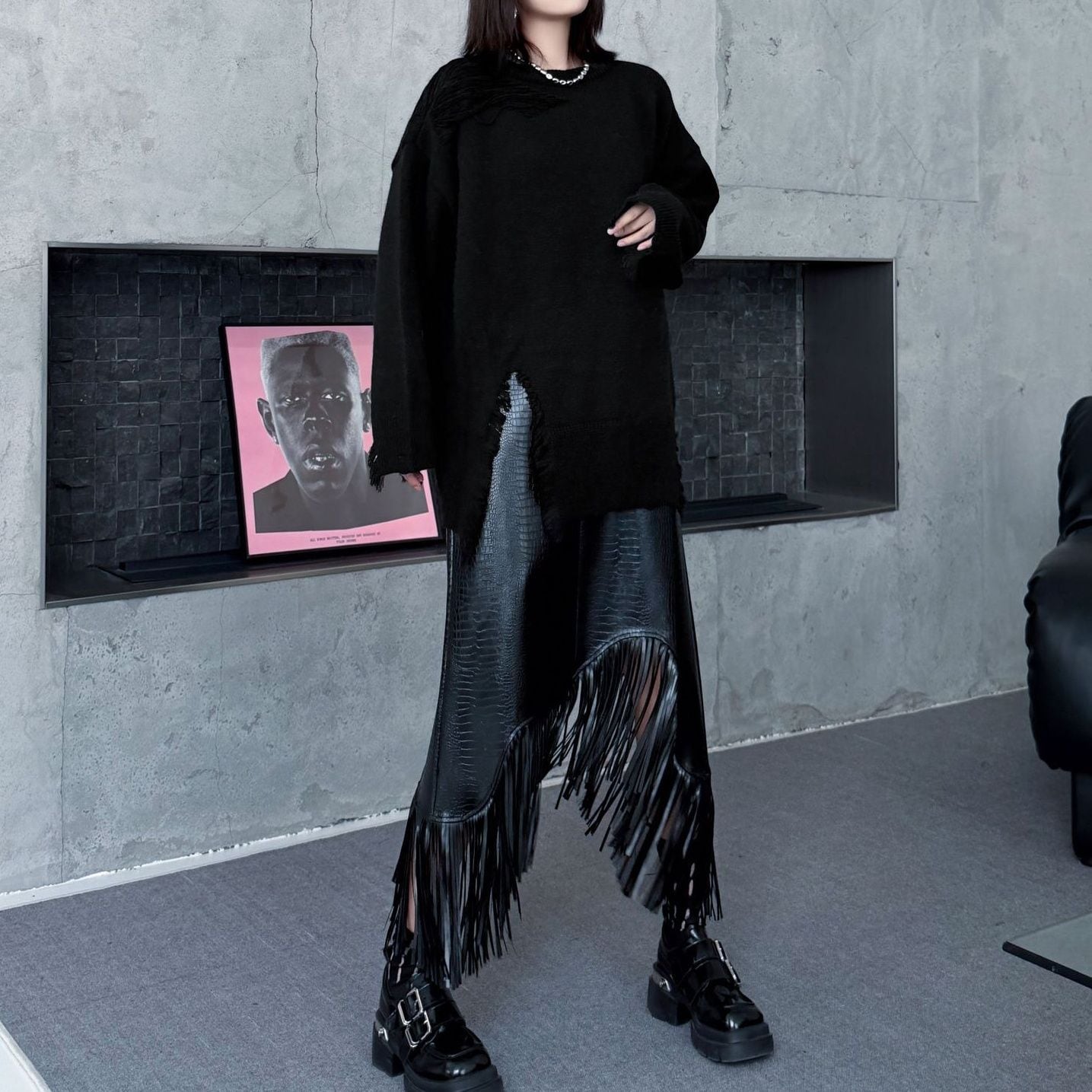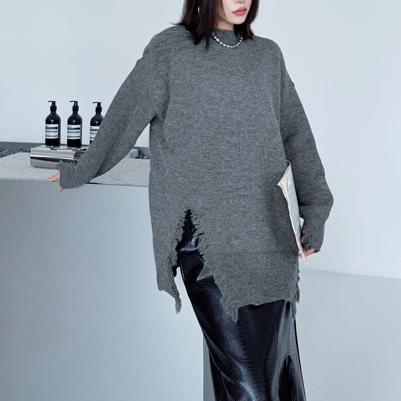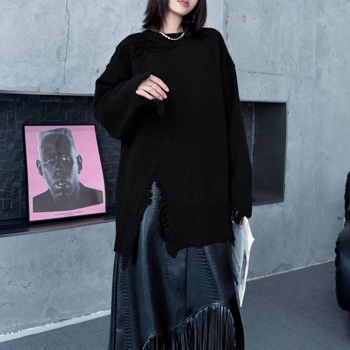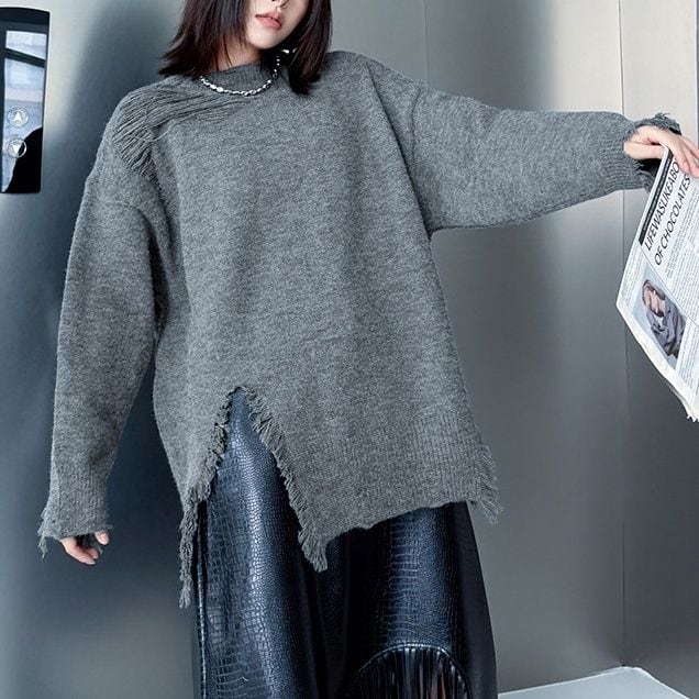 フリンジ加工された複数のスリットが目を惹く、ラウンドネック・長袖・チュニック丈のプルオーバーニットです。単色のゆったりとしたシルエットで合わせやすい、お洒落なカジュアルアイテムです。ブラックとグレーの2色から選べます。