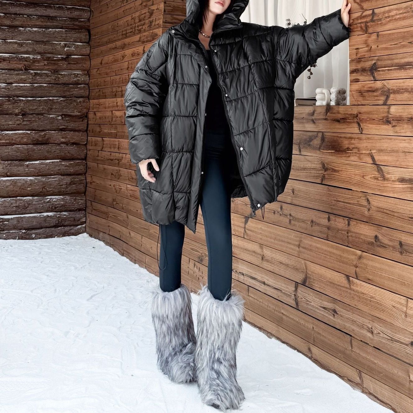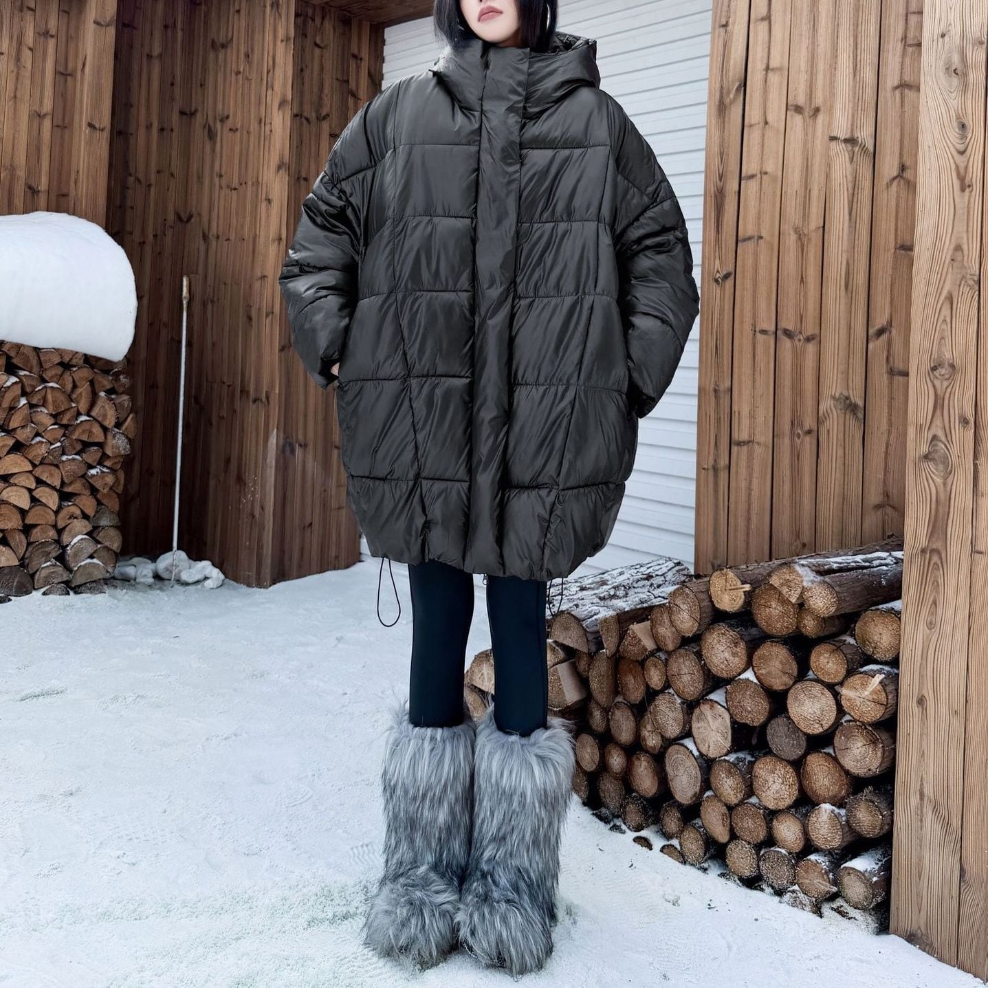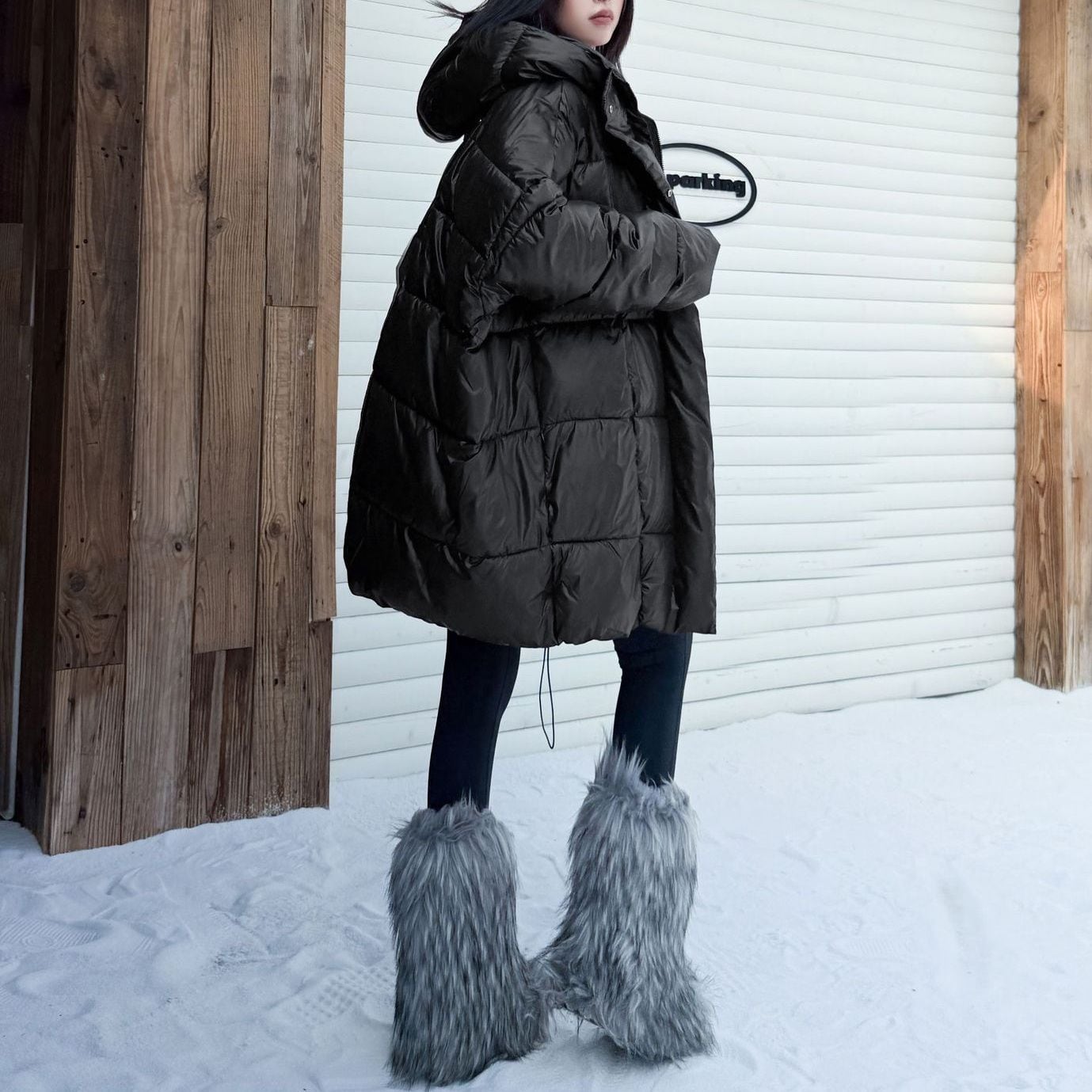 BLACK HOODED WIDE MIDI PADDED COAT 1color M-15169