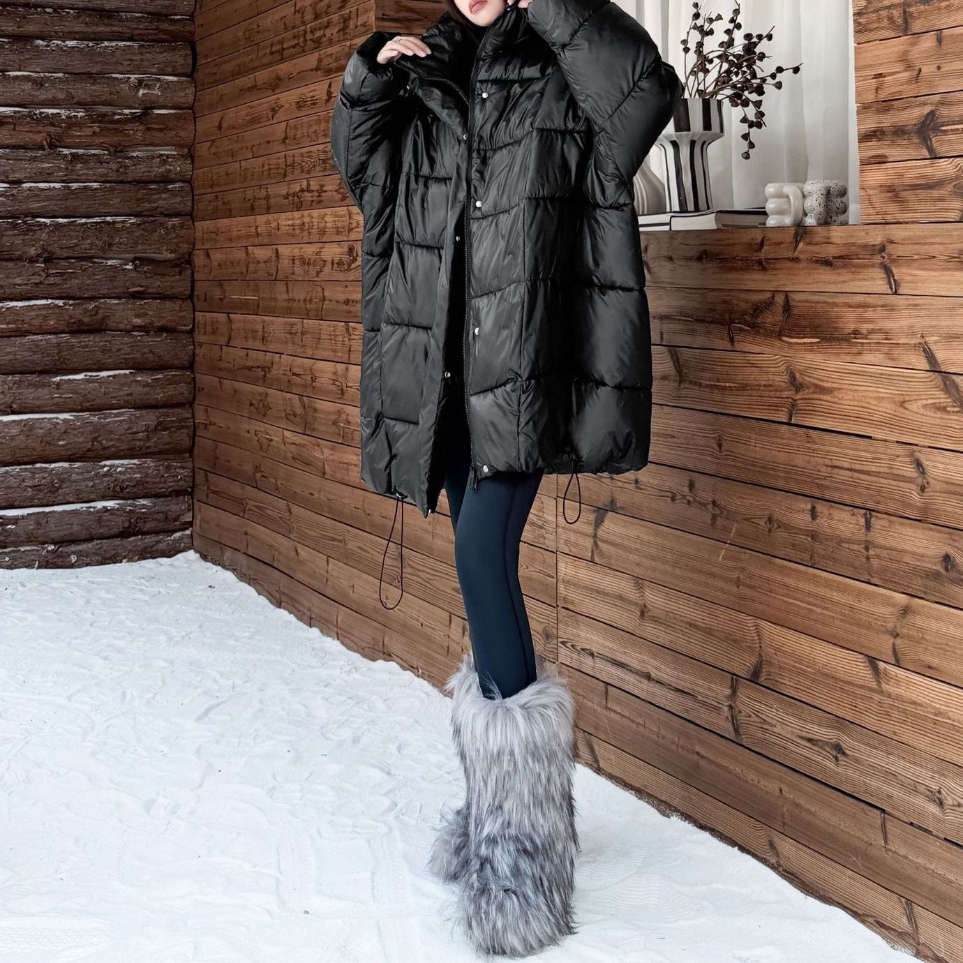 ブラックの艶のある素材がラグジュアリーな、フード付き・長袖・ミドル丈の中綿コートです。比翼の付いたフルジップデザインで、裾にはドローコードが付いています。ワイド幅のシルエットが魅力的な、何にでも合わせやすい防寒アイテムです。