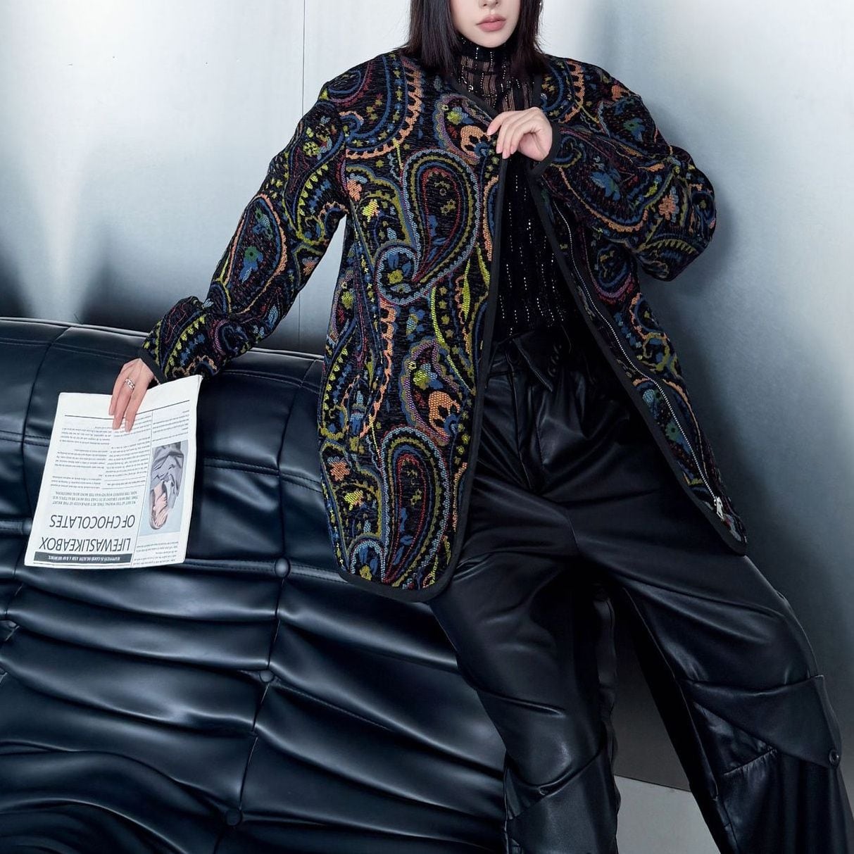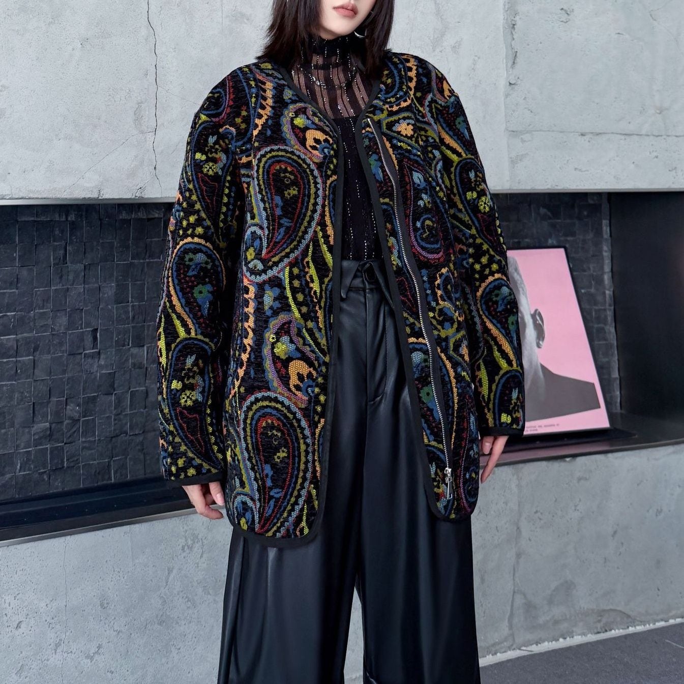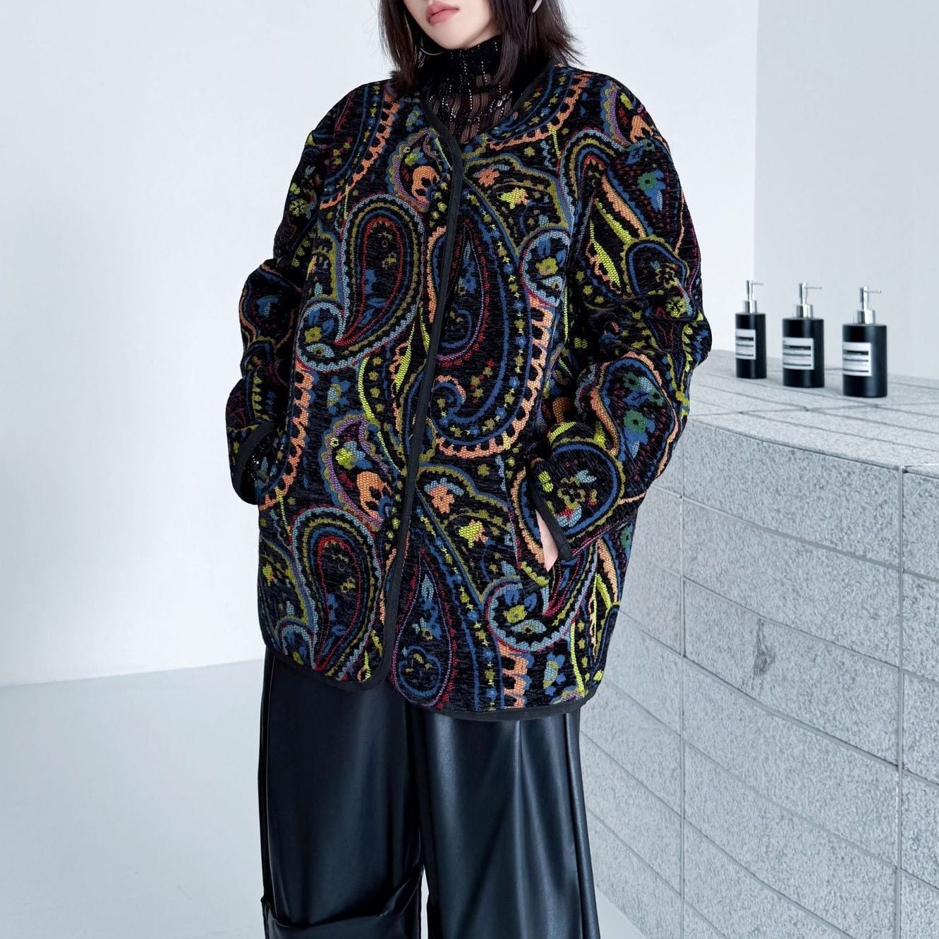 ブラック地にマルチカラーのペイズリー柄が目を惹く、Vネック・長袖・チュニック丈のデザインジャケットです。ゆったりとしたシルエットのフルジップデザインが使いやすい、コーディネートの主役になるアイテムです。