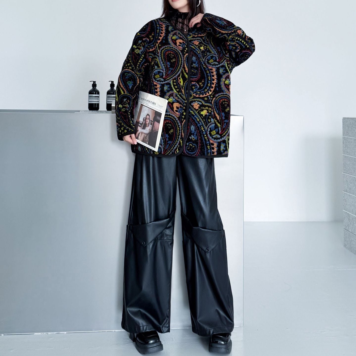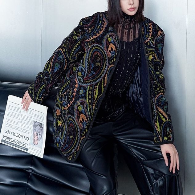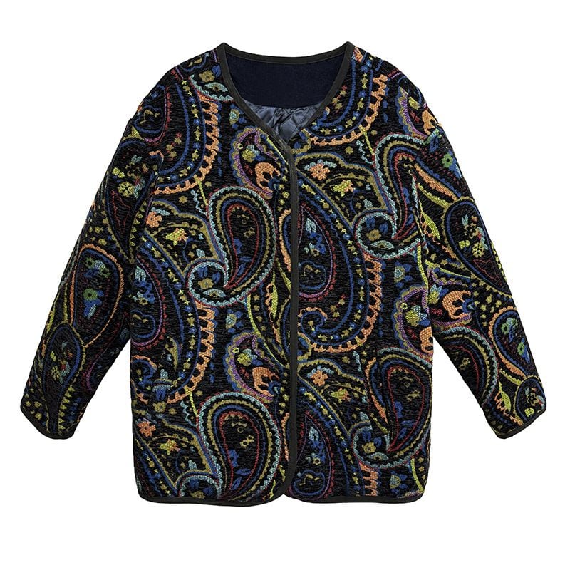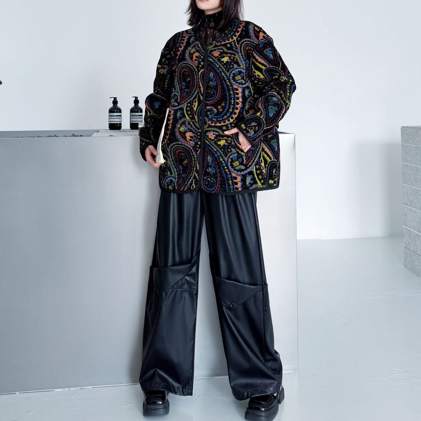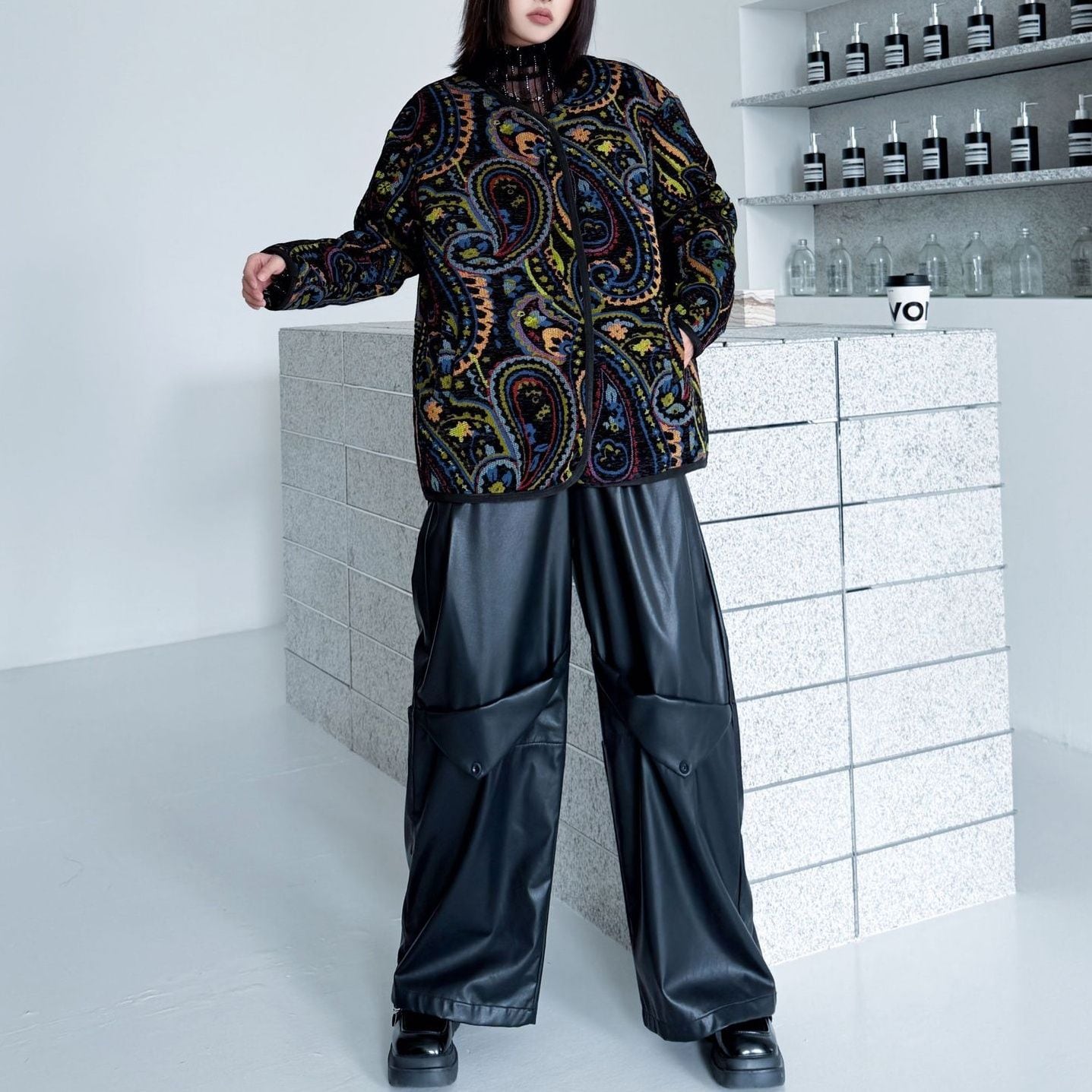 ブラック地にマルチカラーのペイズリー柄が目を惹く、Vネック・長袖・チュニック丈のデザインジャケットです。ゆったりとしたシルエットのフルジップデザインが使いやすい、コーディネートの主役になるアイテムです。