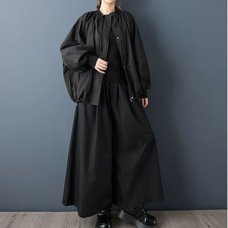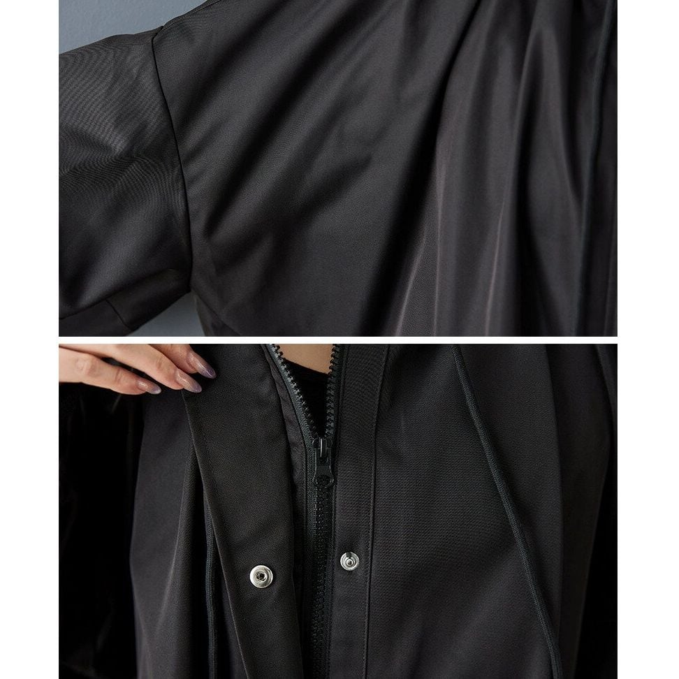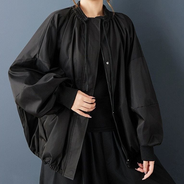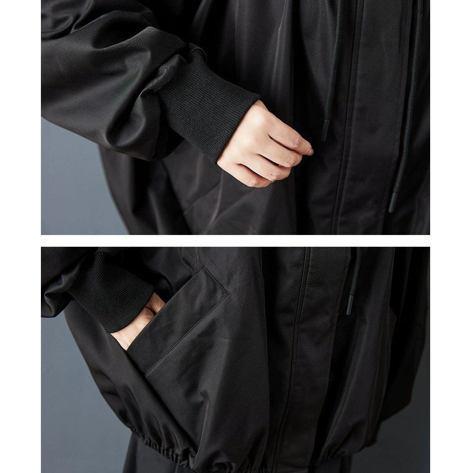 ランタンのような丸みのあるシルエットがキュートな、モックネック・長袖・ショート丈のデザインジャケットです。ネックにはドローストリングが付いて、裾とともにギャザー加工されています。比翼の付いたフルジップデザインや袖口のリブ加工で、冷たい風も入りにくいです。ブラックの単色がクールな、コーディネートのアクセントになるアイテムです。