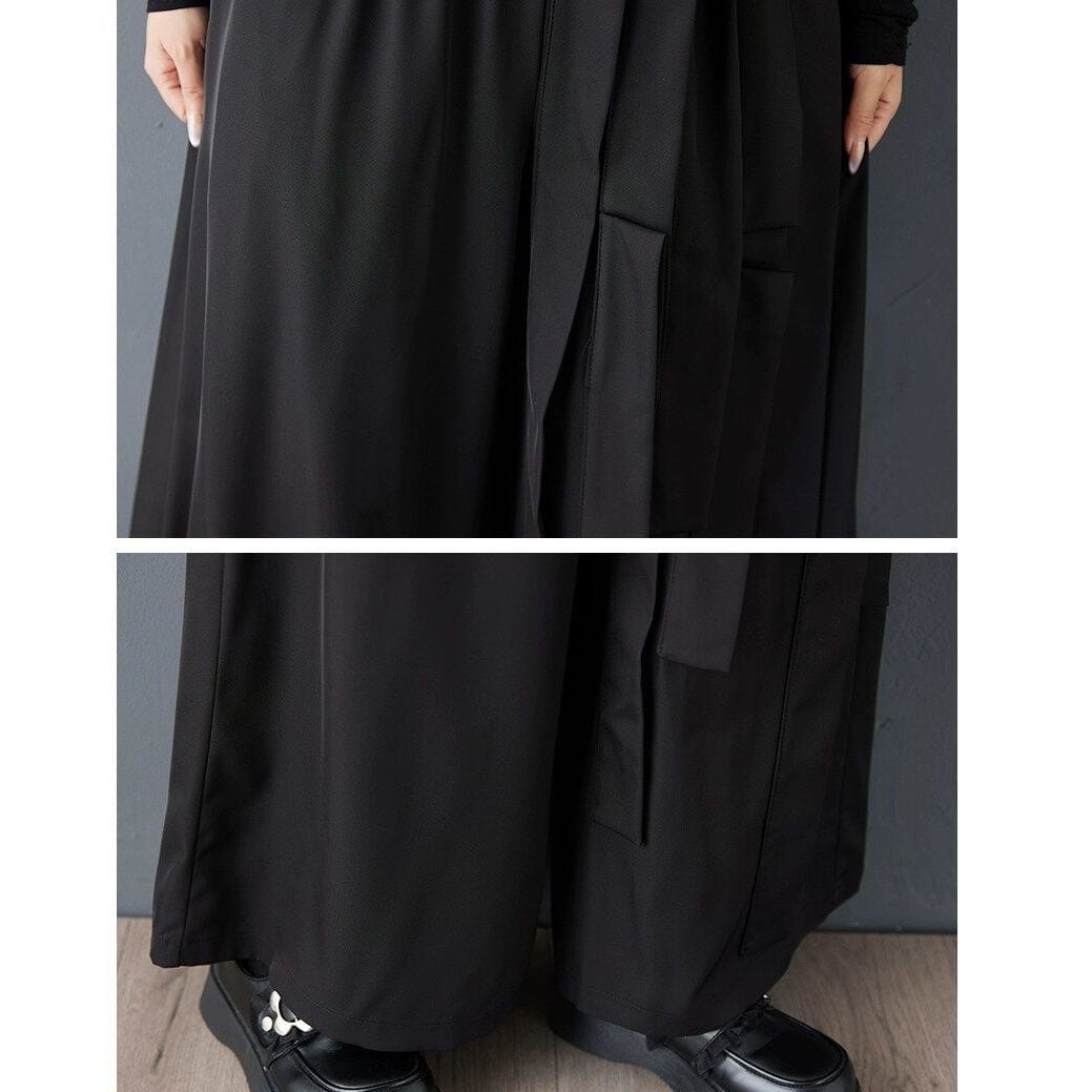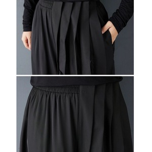 アシンメトリックにあしらわれたプリーツのようなフラップ飾りがお洒落な、ブラックのワイドレッグ・デザインパンツです。ウエストはゴムなので、着脱が簡単で履き心地が良いです。ロングスカートのようなAラインのシルエットが魅力的な、単色で合わせやすいアイテムです。