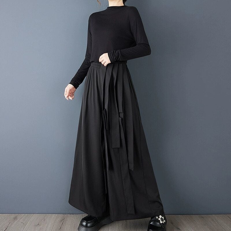 BLACK ELASTIC WAIST WIDE LEG DESIGN PANTS 1color M-15189