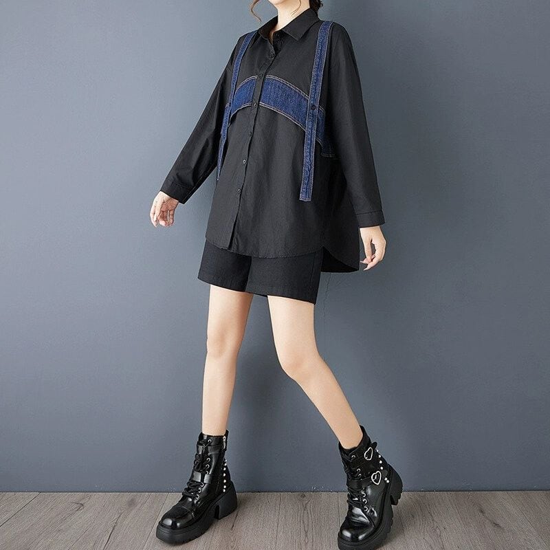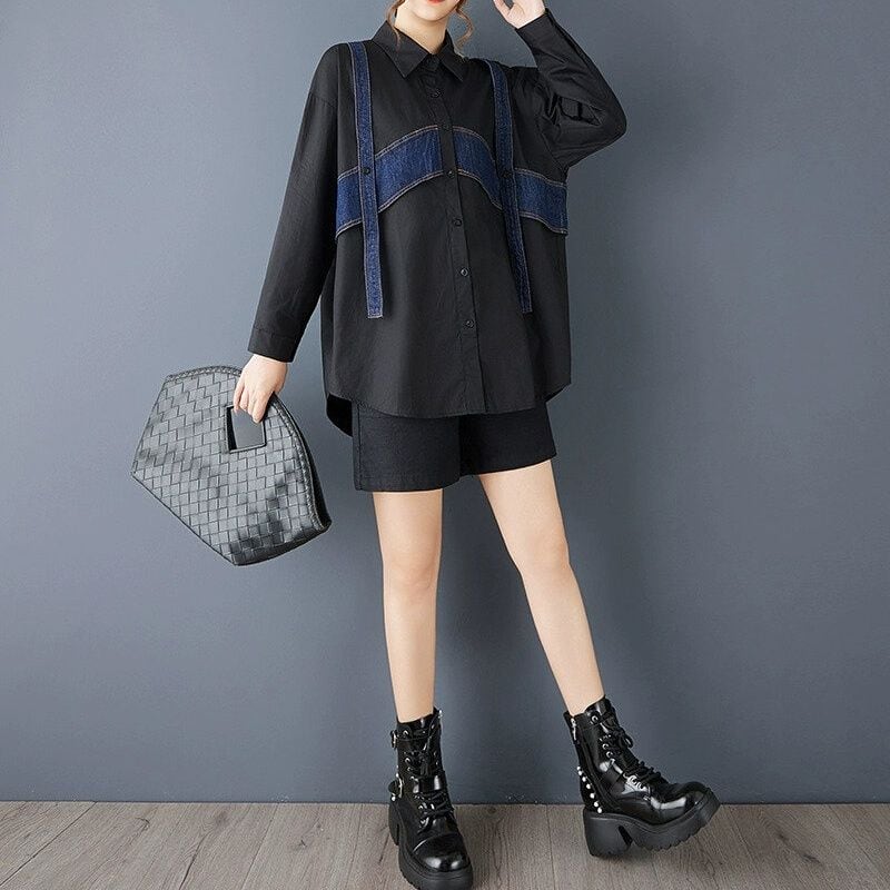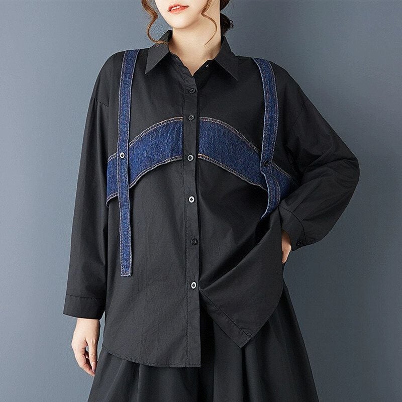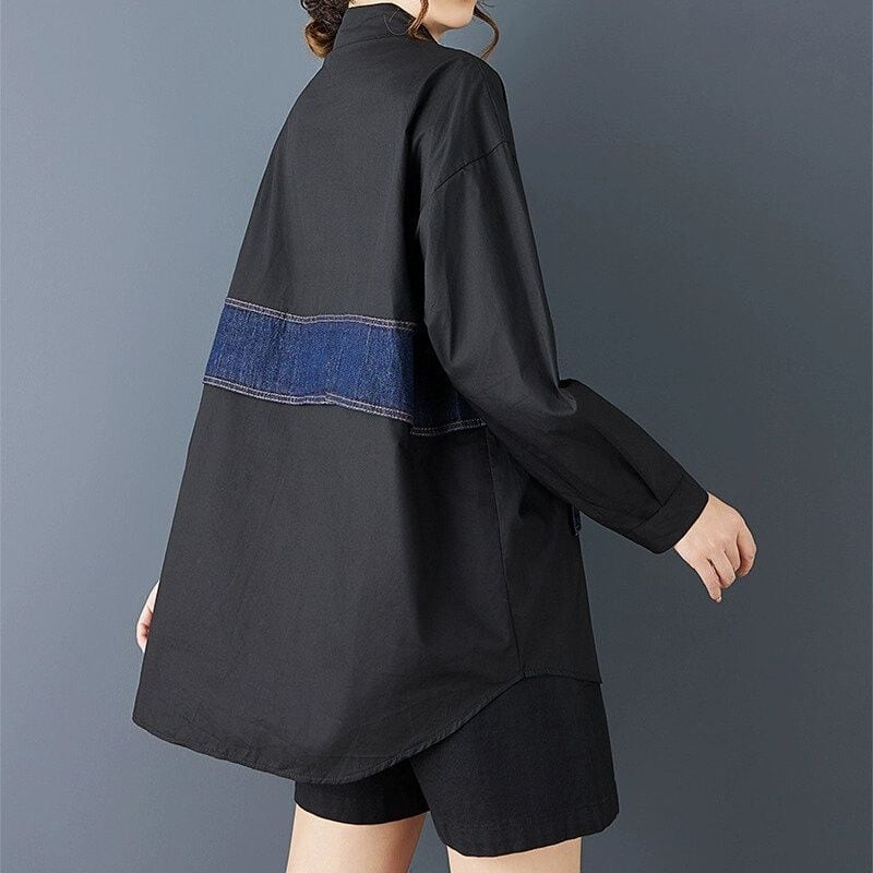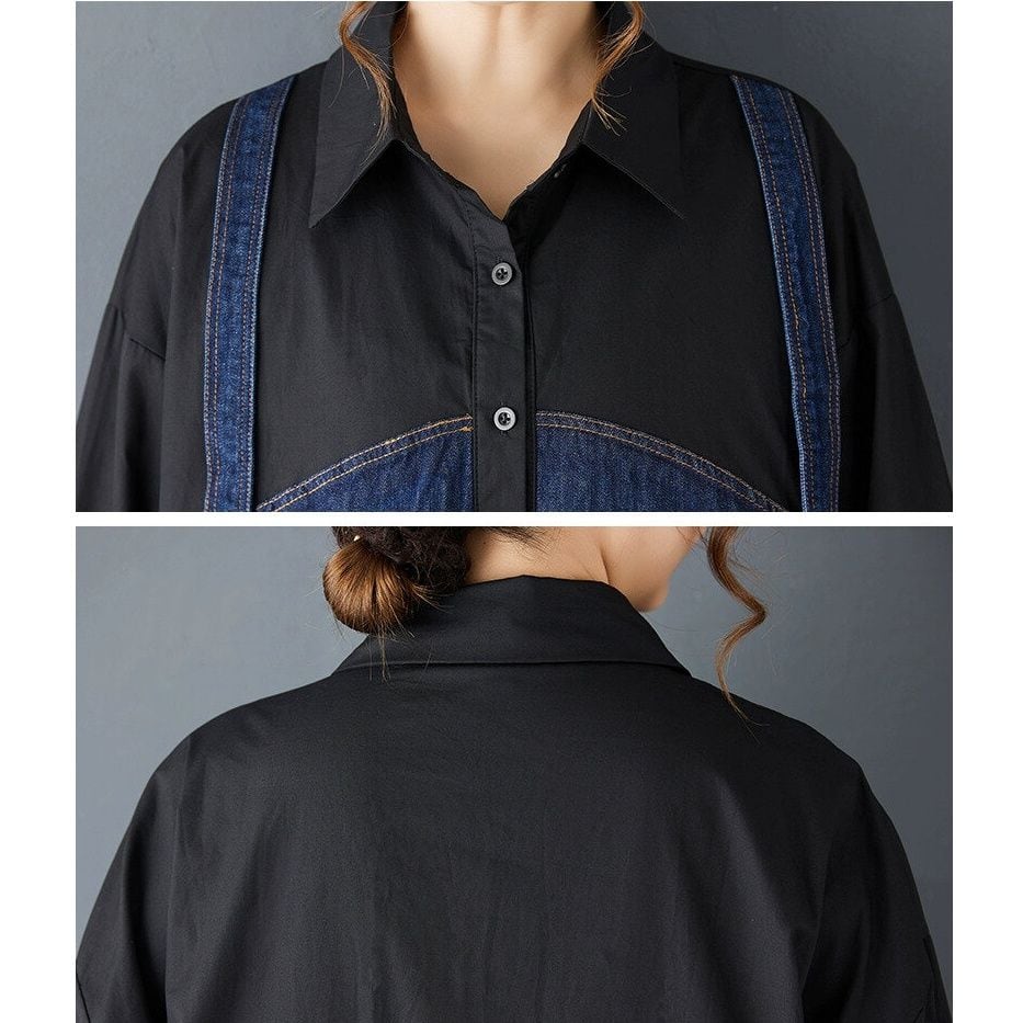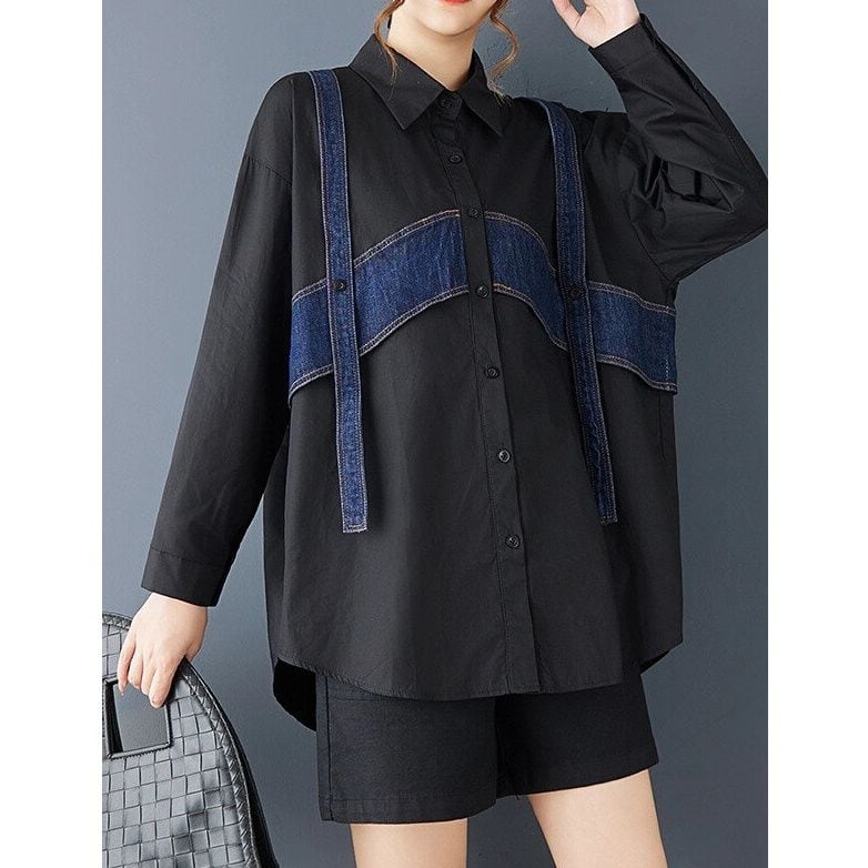 DENIM LINE STITCHED BLACK LONG SLEEVES SHIRT 1color M-15193