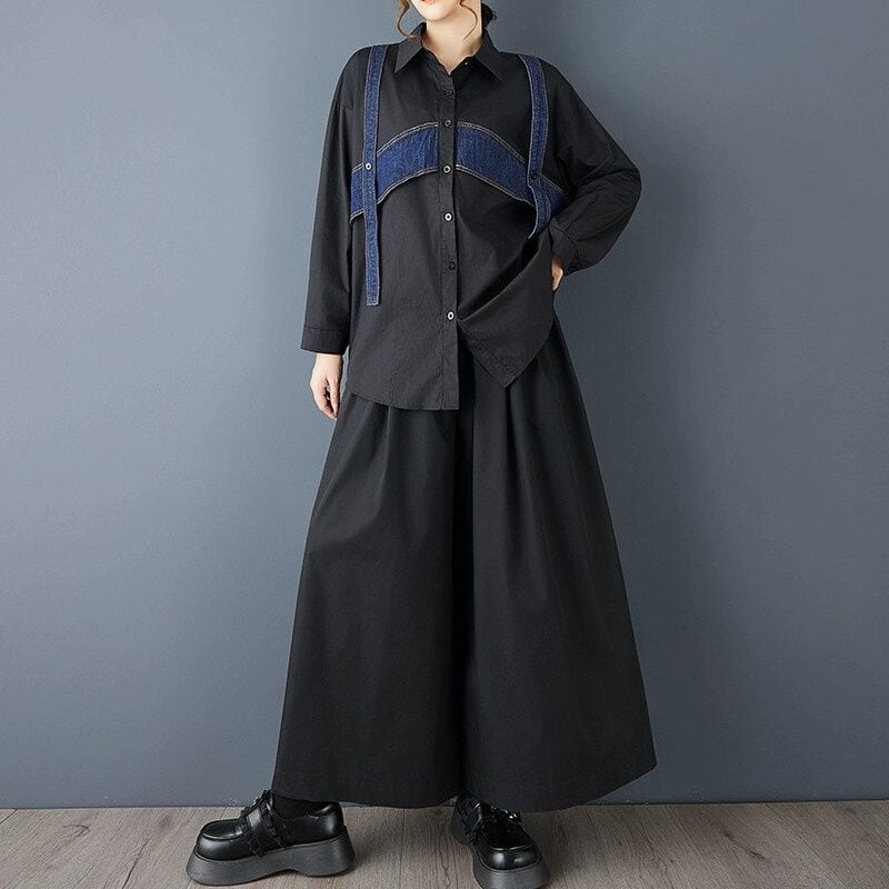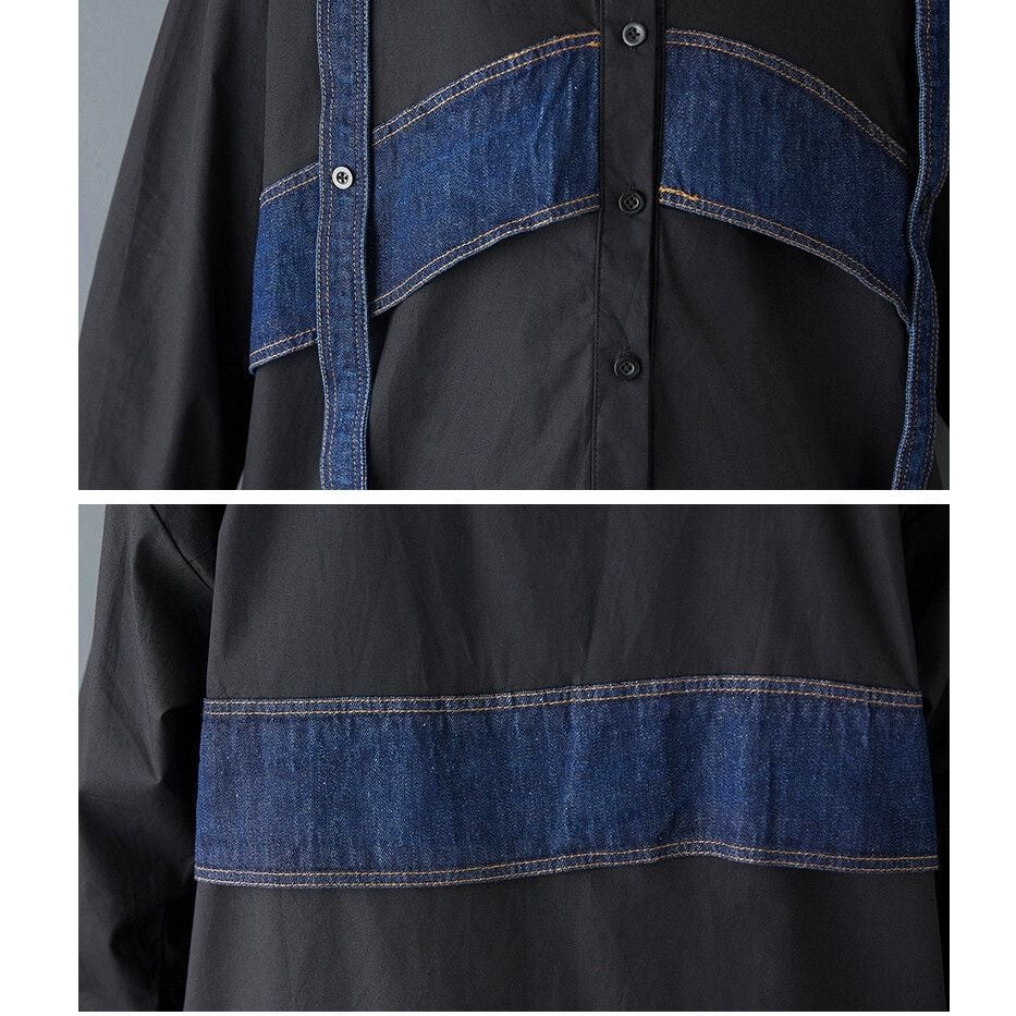 ブラック地にブルーデニムのラインスティッチが目を惹く、ポロ襟・長袖・ラウンドカットのデザインシャツです。ゆったりとしたシルエットで着心地が良い、コーディネートのアクセントになるカジュアルアイテムです。
