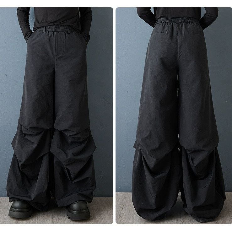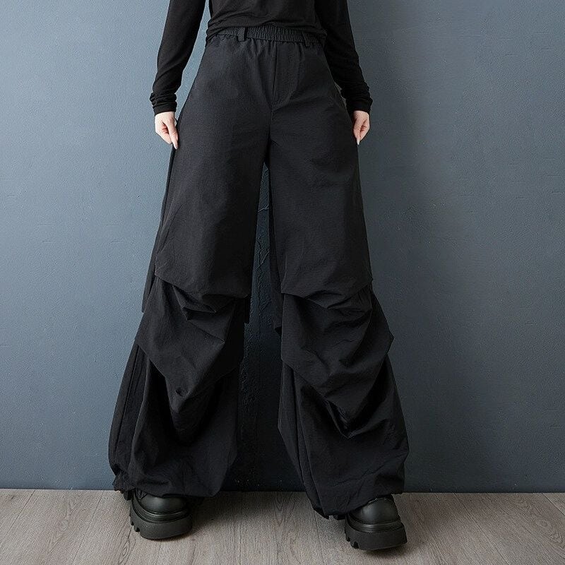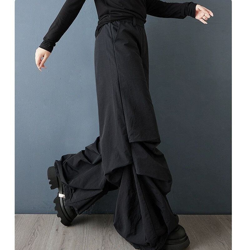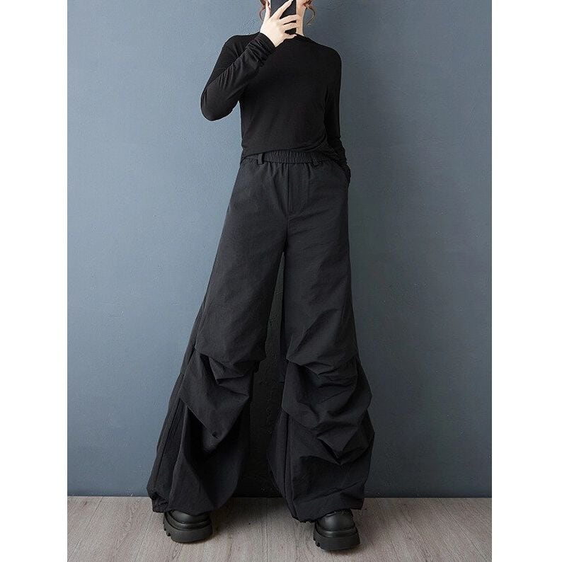 BLACK ELASTIC WAIST DESIGN PLEATS LANTERN PANTS 1color M-15197