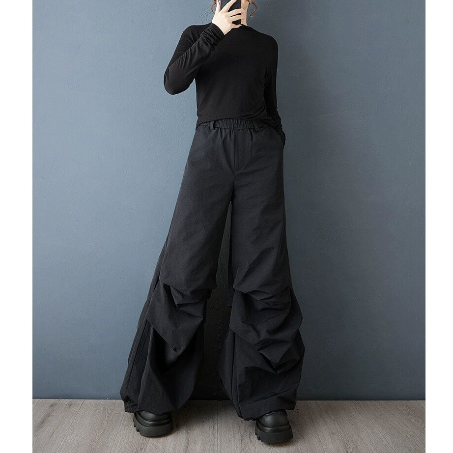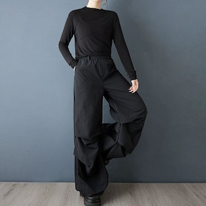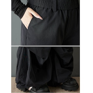 デザインプリーツで作られたランタンのような裾のシルエットが特徴的な、ブラックのワイドレッグ・デザインパンツです。ウエストはゴムなので、着脱が簡単で履き心地が良いです。動きやすくレッグラインをカバーしてくれる、単色でコーディネートしやすいカジュアルアイテムです。