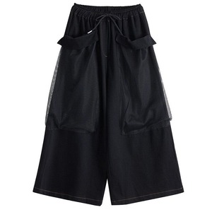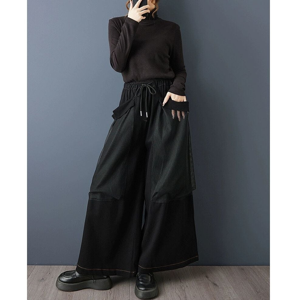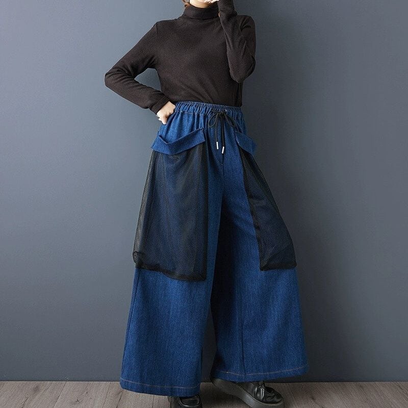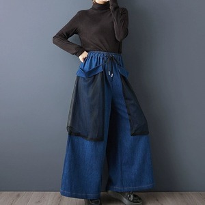 メッシュ素材でできた大きなデザインポケットが目を惹く、ワイドレッグ・デニムパンツです。ウエストはゴム+ドローストリングで、履き心地が良いです。Aラインのシルエットが魅力的な、コーディネートのアクセントになるアイテムです。色はブルーとブラックの2色から選べます