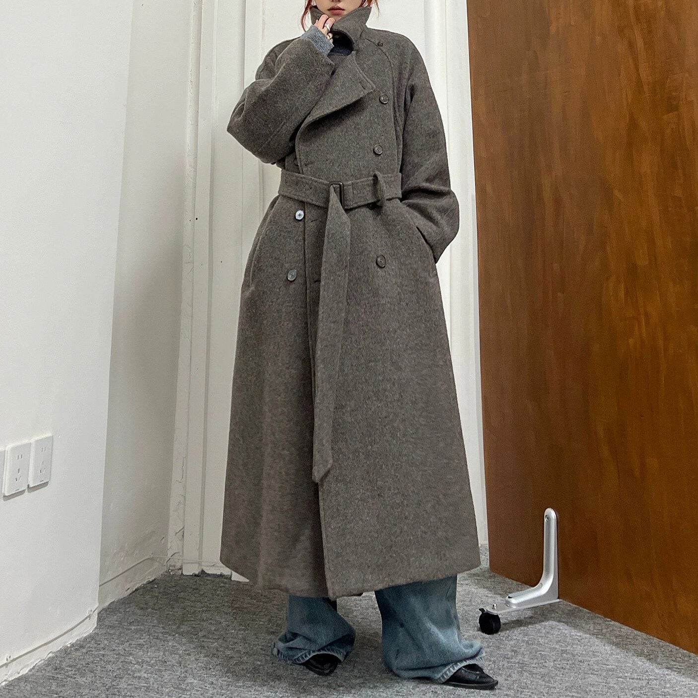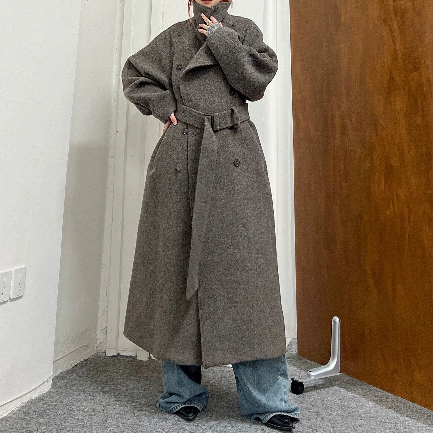 グレイブラウンの温かみのあるカラーがお洒落な、ダブルブレスト・ロング丈のウールコートです。ウエストの高い位置にベルトが付いたシルエットが美しいです。シンプルなデザインで何にでも合わせやすい、エレガントで都会的な雰囲気のアイテムです。