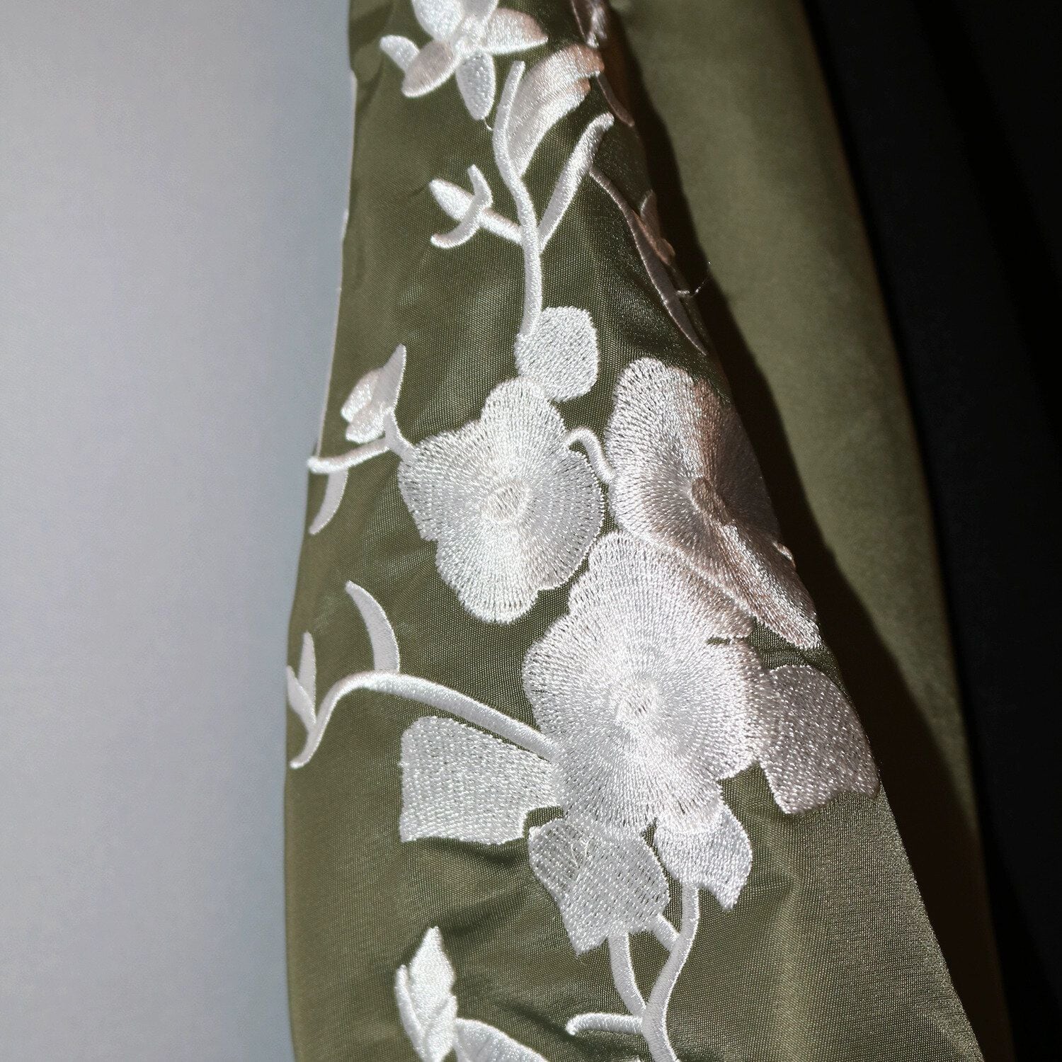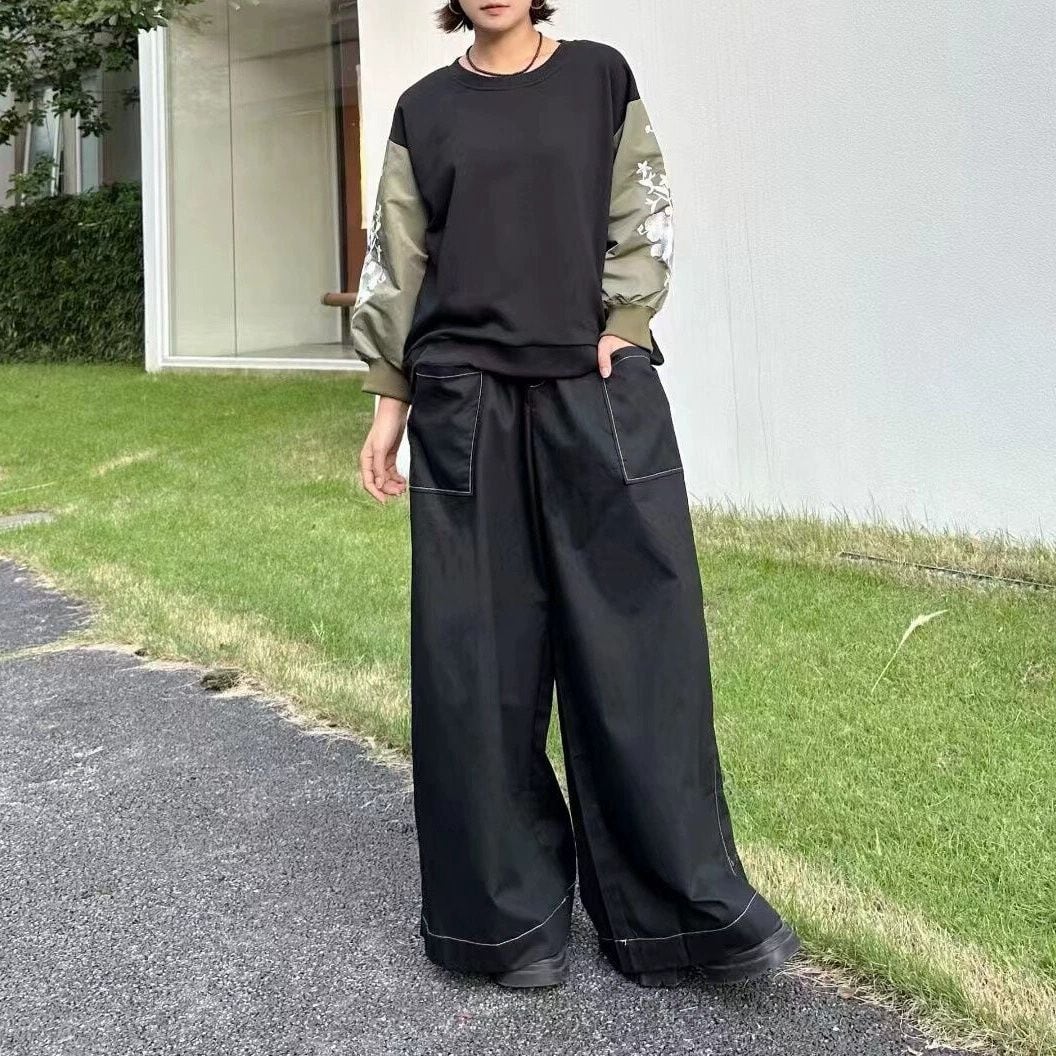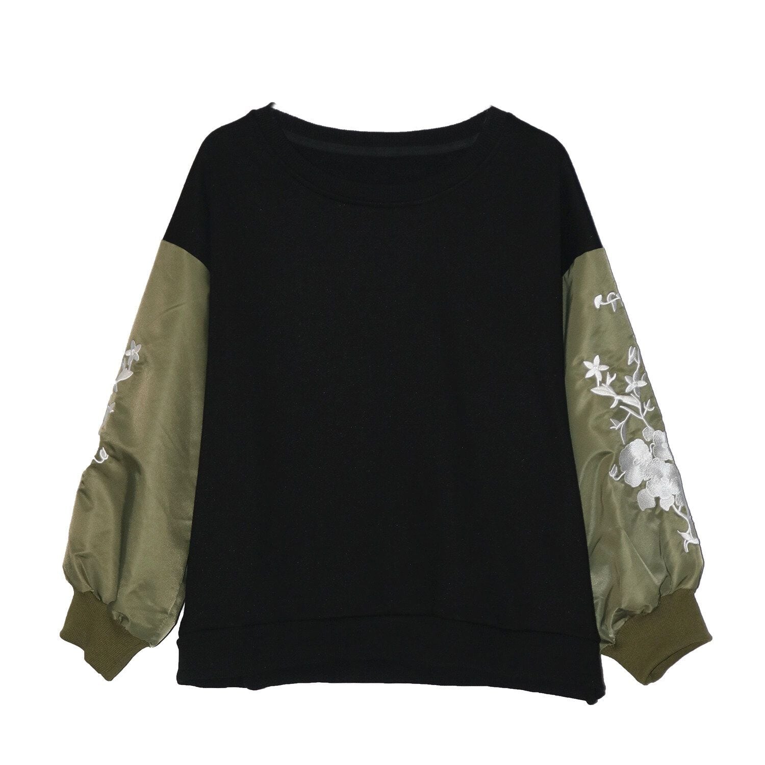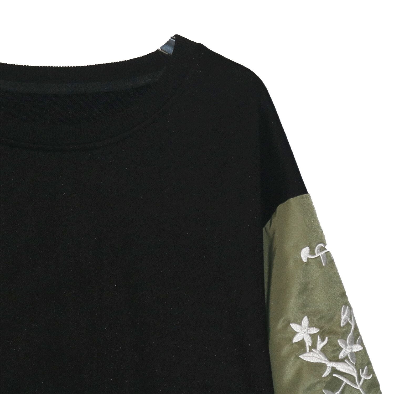 白いお花の刺繍が施されたアーミーグリーンの袖が目を惹く、ラウンドネックショート丈のスウェットシャツです。ゆったりとしたシルエットで着心地が良い、コーディネートのアクセントになるアイテムです。ブラックとグレーの2色から選べます。