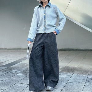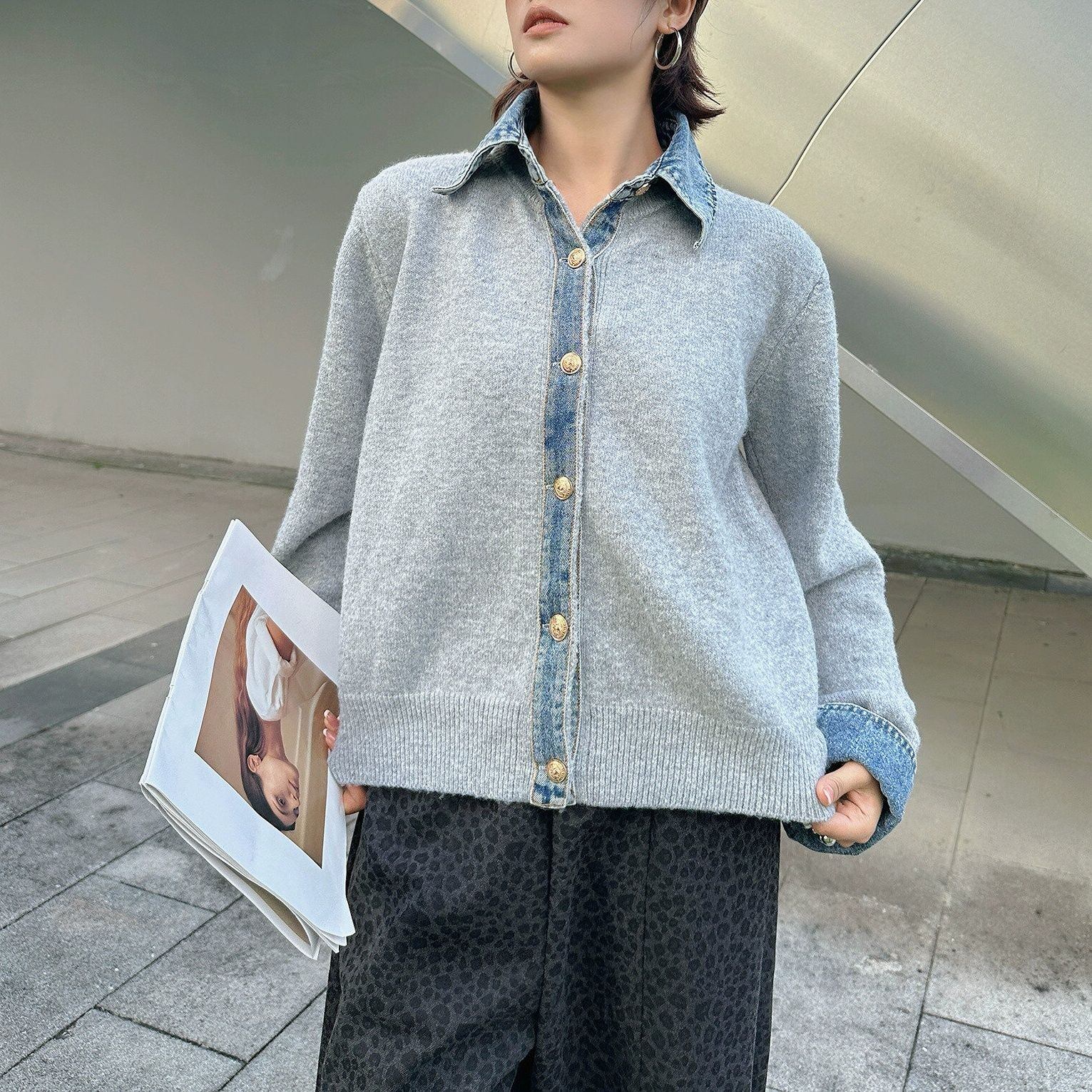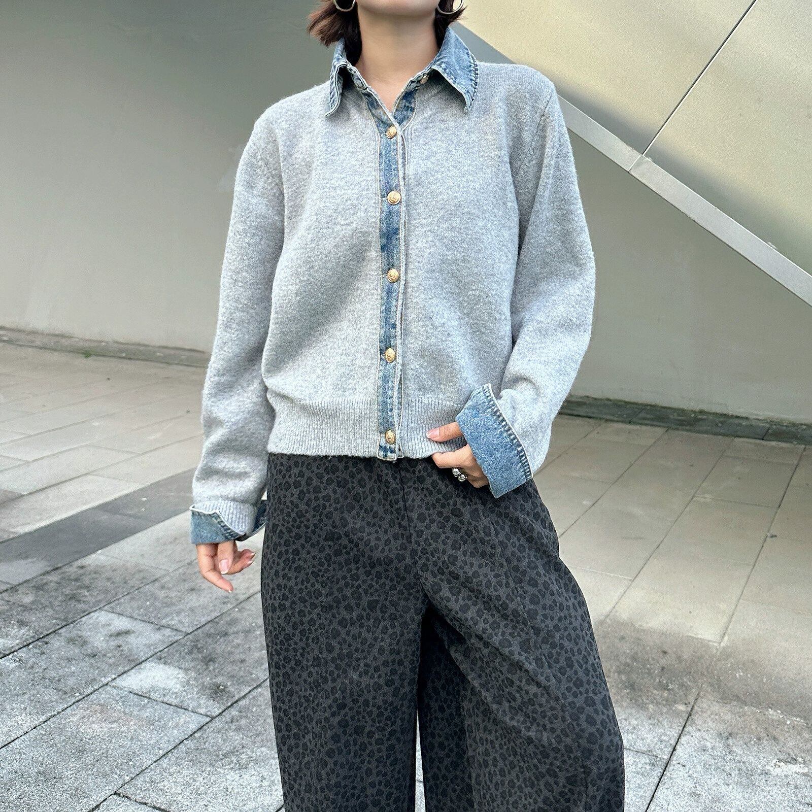 襟・ボタンライン・袖口がブルーデニムでできたポロ襟・長袖・ショート丈のニットカーディガンです。ゴールドのボタンがお洒落な、合わせやすいアイテムです。ブラックとグレーの2色から選べます。