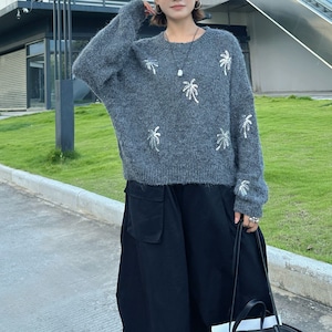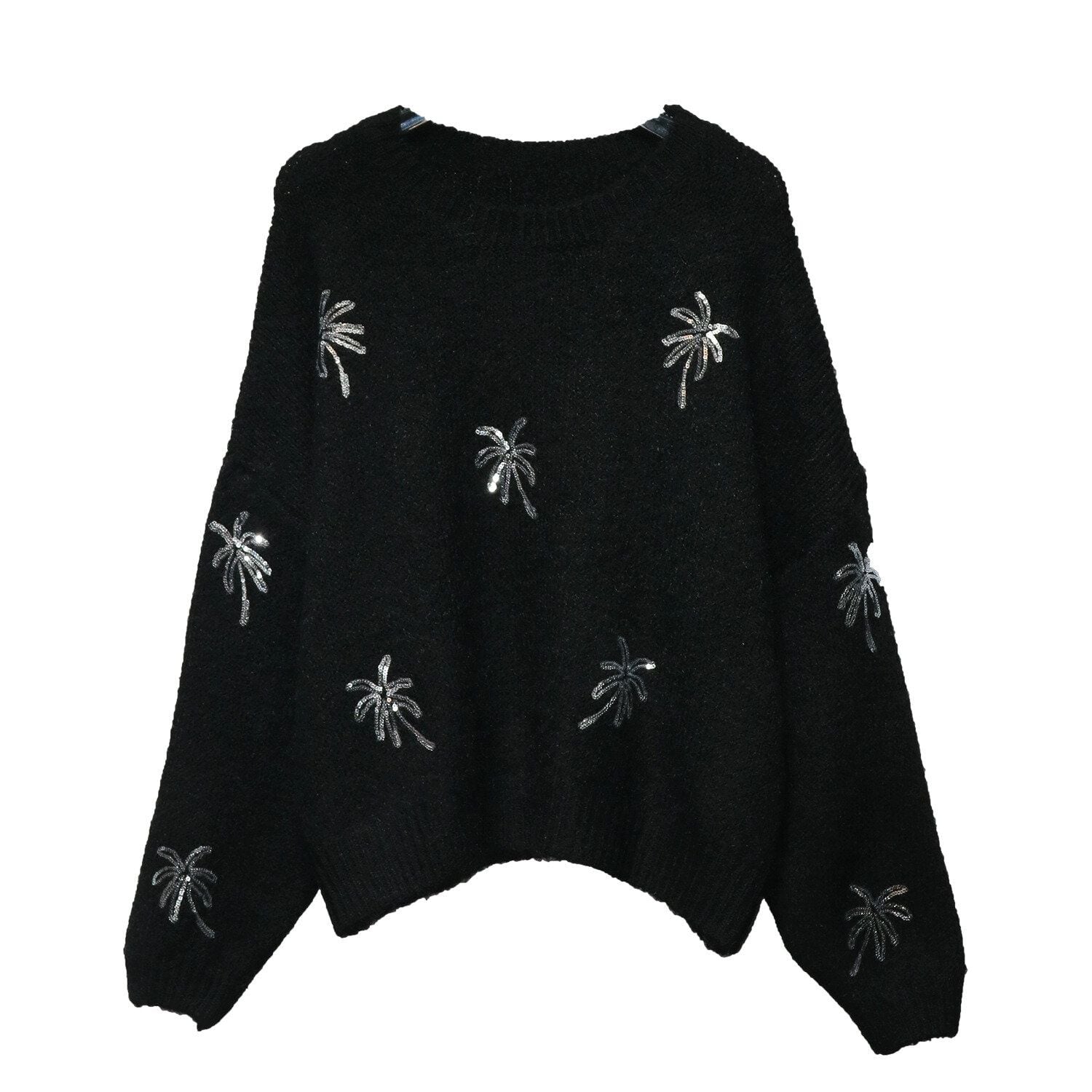シルバーのスパンコールのパームツリーが散りばめられた、ラウンドネック・長袖・ショート丈のプルオーバーニットです。首周り・袖口・裾がリブ加工された、ゆったりとしたシルエットの合わせやすいアイテムです。色は3色から選べます。