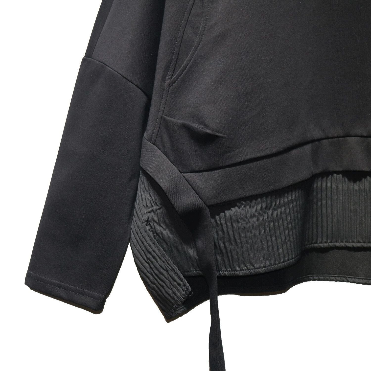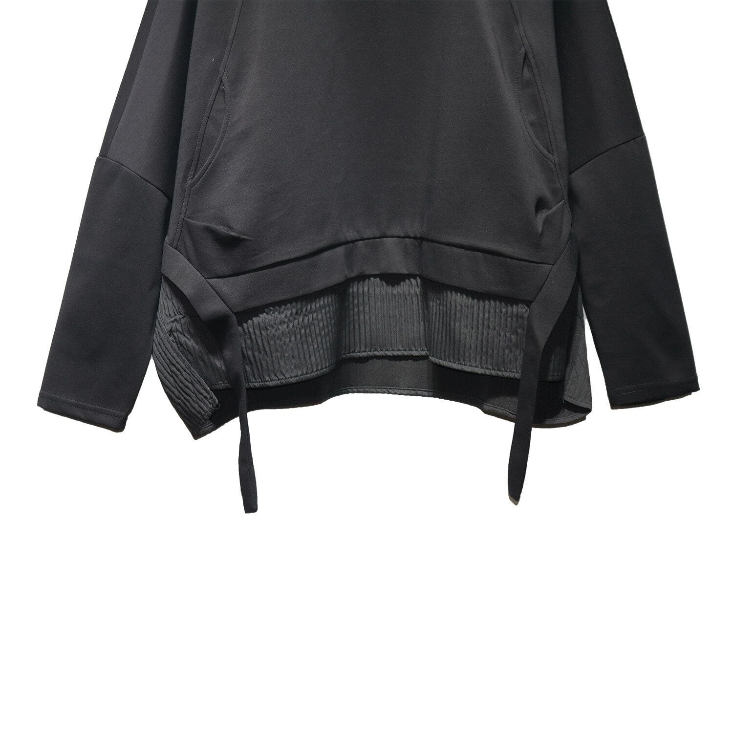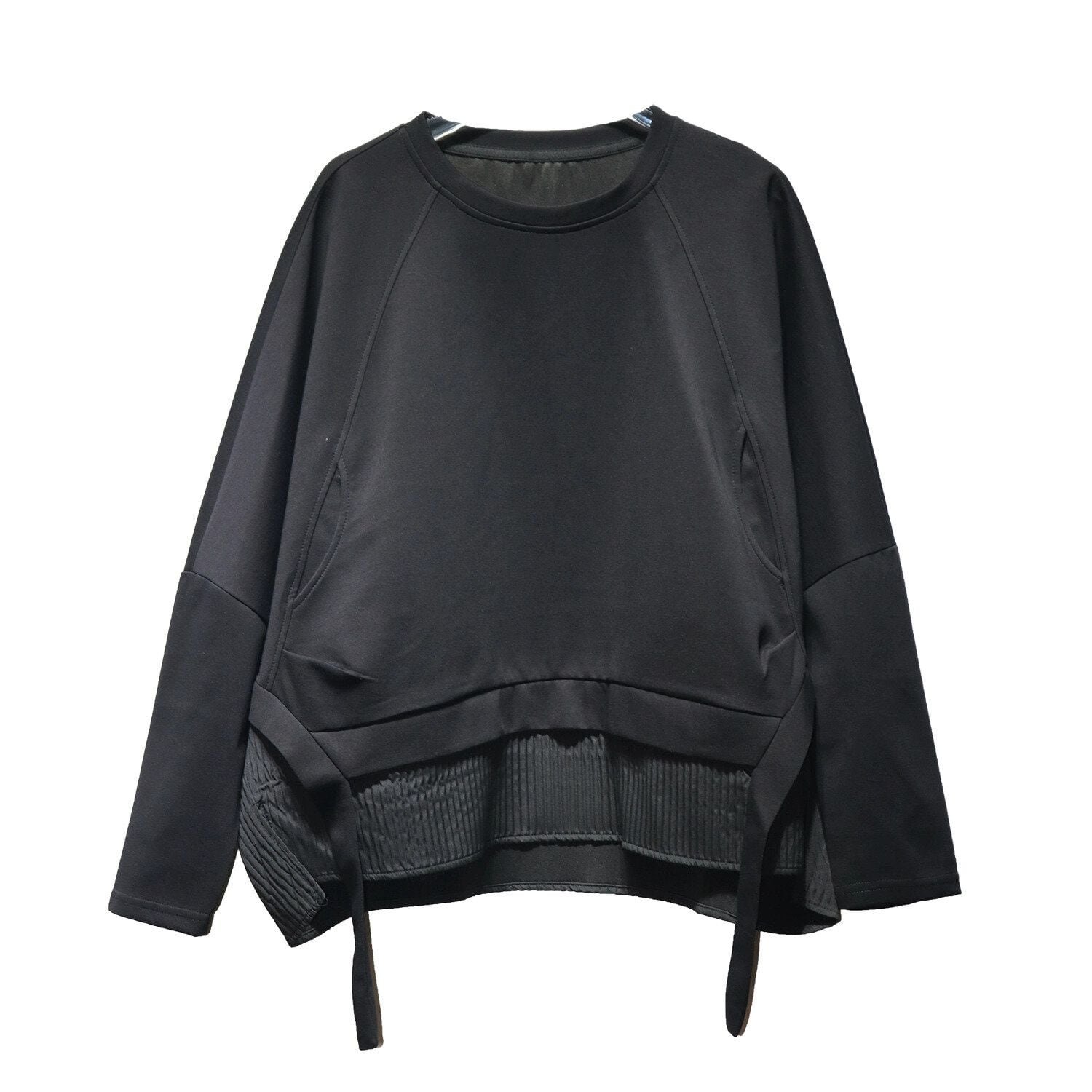 立体ストライプ素材の裾のスティッチが作るフェイクツーピースデザインがお洒落な、ラウンドネック・長袖・ハイローヘムのデザインスウェットシャツです。サイドにスリットの入った裾やストラップ飾りが特徴的な、単色で合わせやすいカジュアルアイテムです。ブラックとホワイトの2色から選べます。