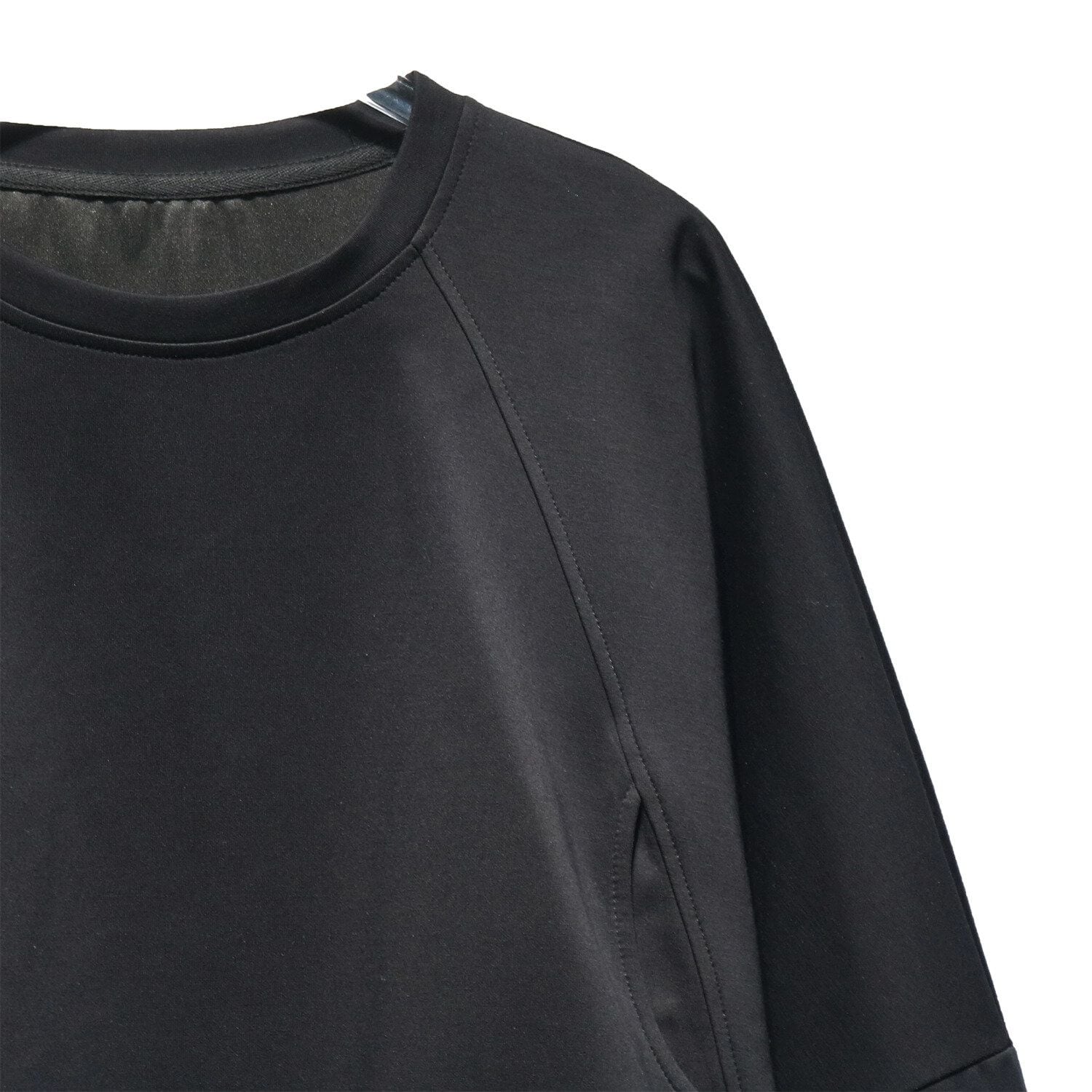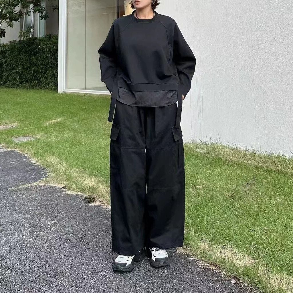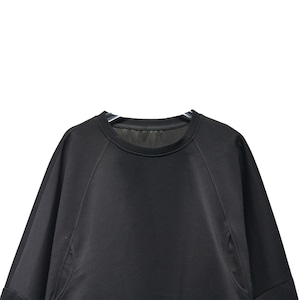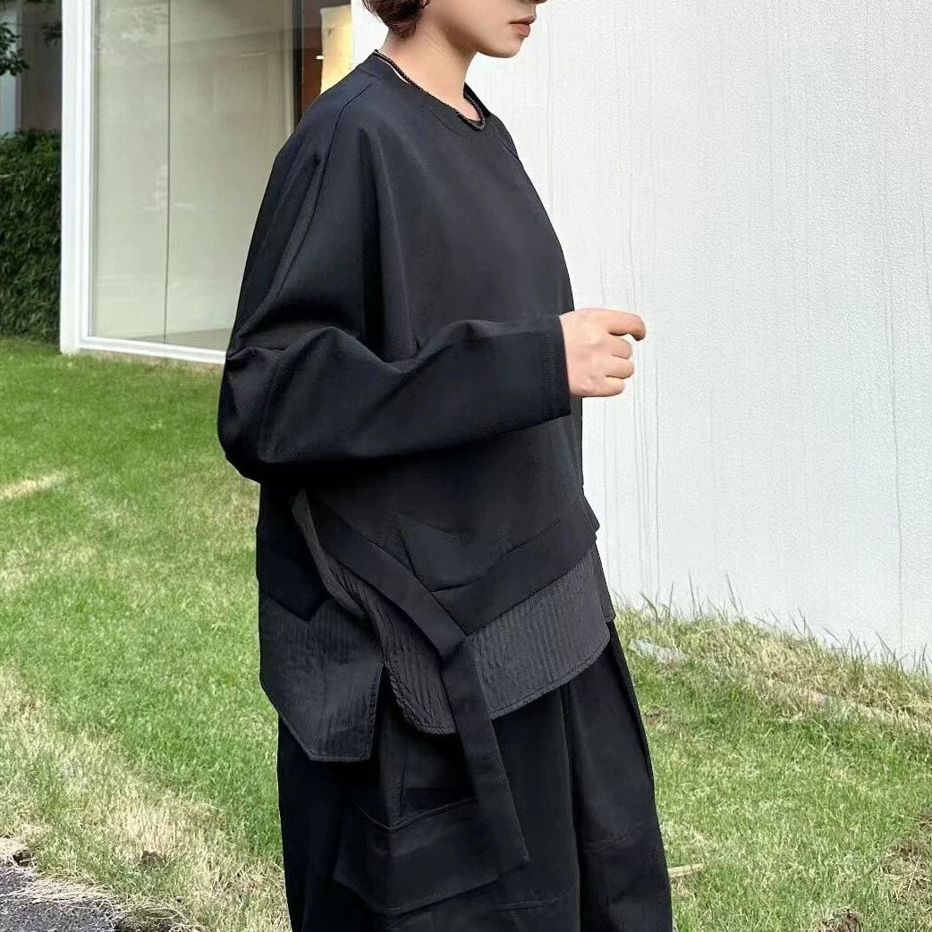 立体ストライプ素材の裾のスティッチが作るフェイクツーピースデザインがお洒落な、ラウンドネック・長袖・ハイローヘムのデザインスウェットシャツです。サイドにスリットの入った裾やストラップ飾りが特徴的な、単色で合わせやすいカジュアルアイテムです。ブラックとホワイトの2色から選べます。