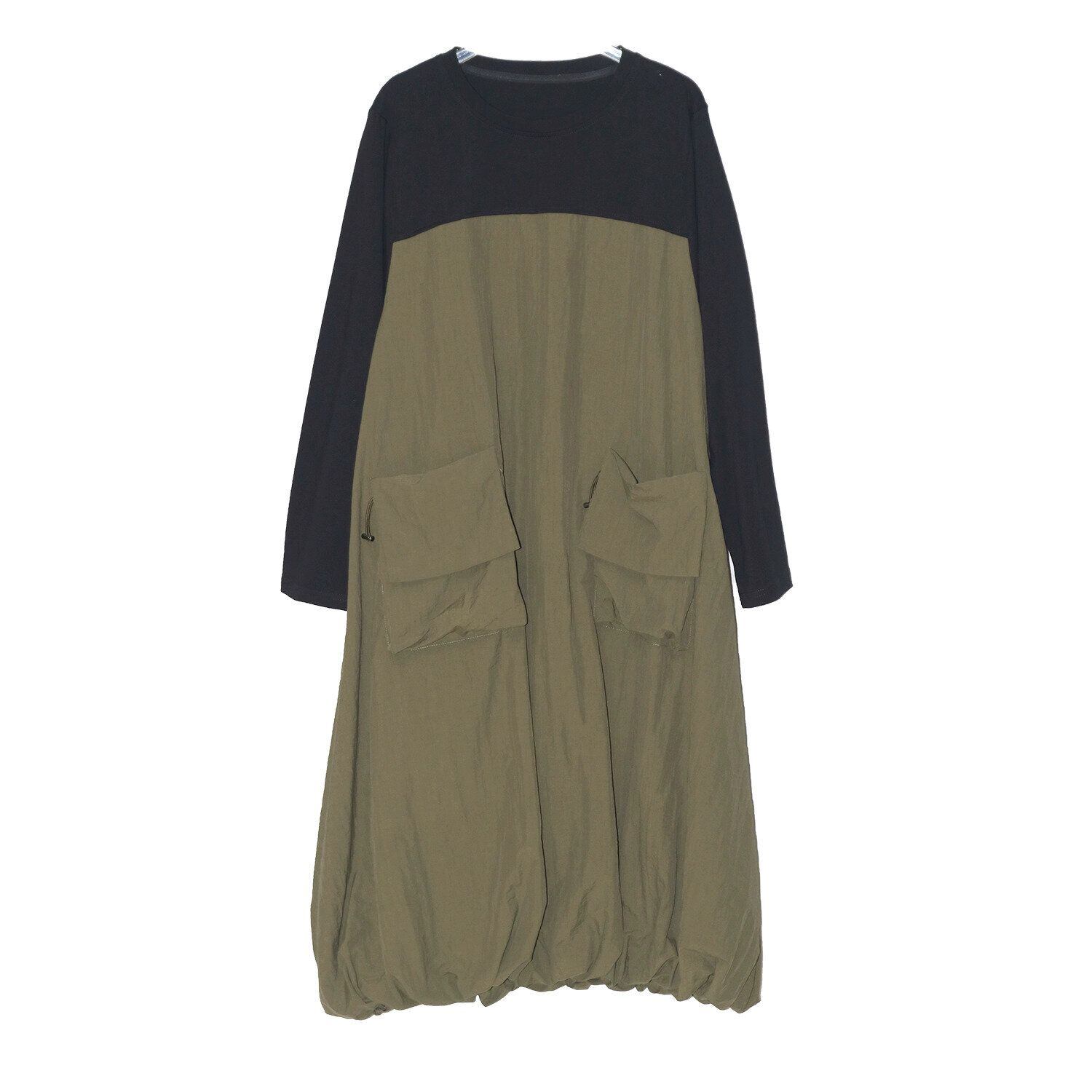 胸上の切り返しで作るふんわりとしたシルエットやデザインポケットがキュートな、ラウンドネック・長袖・膝下丈のプルオーバーワンピースです。異なるテクスチャーの素材を使ったスティッチデザインや、ランタンのような裾がお洒落なカジュアルアイテムです。ブラックとアーミーグリーンの2色から選べます。
