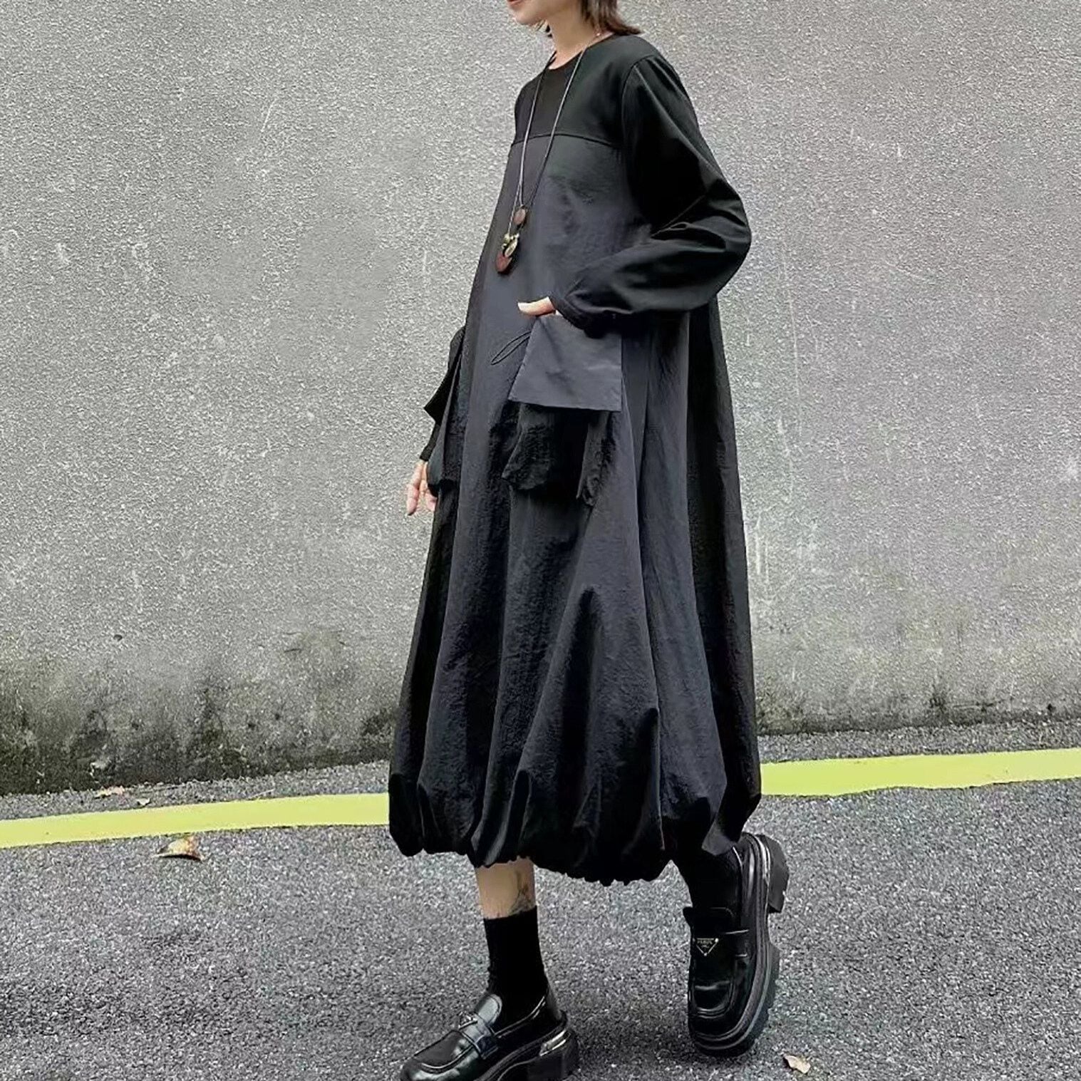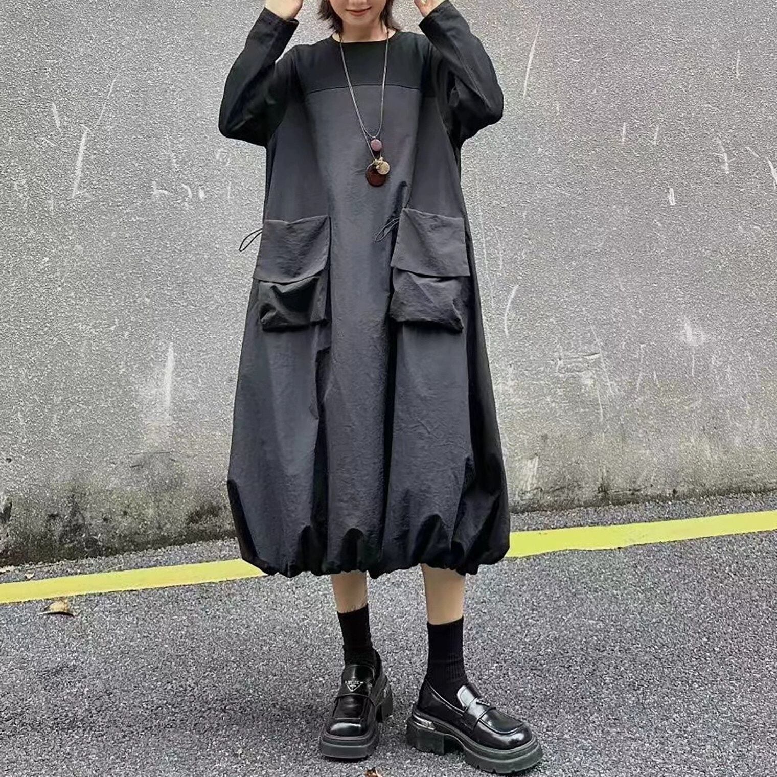 DESIGN POCKET ROUND NECK LANTERN HEM MIDI PULLOVER DRESS 2colors M-15214