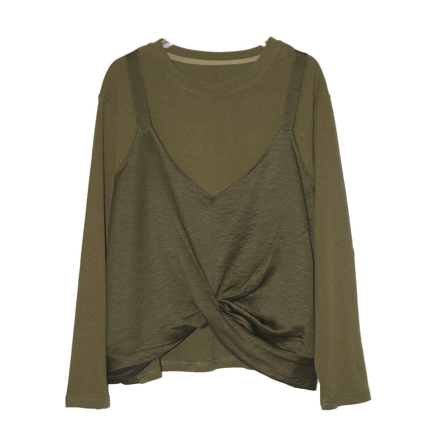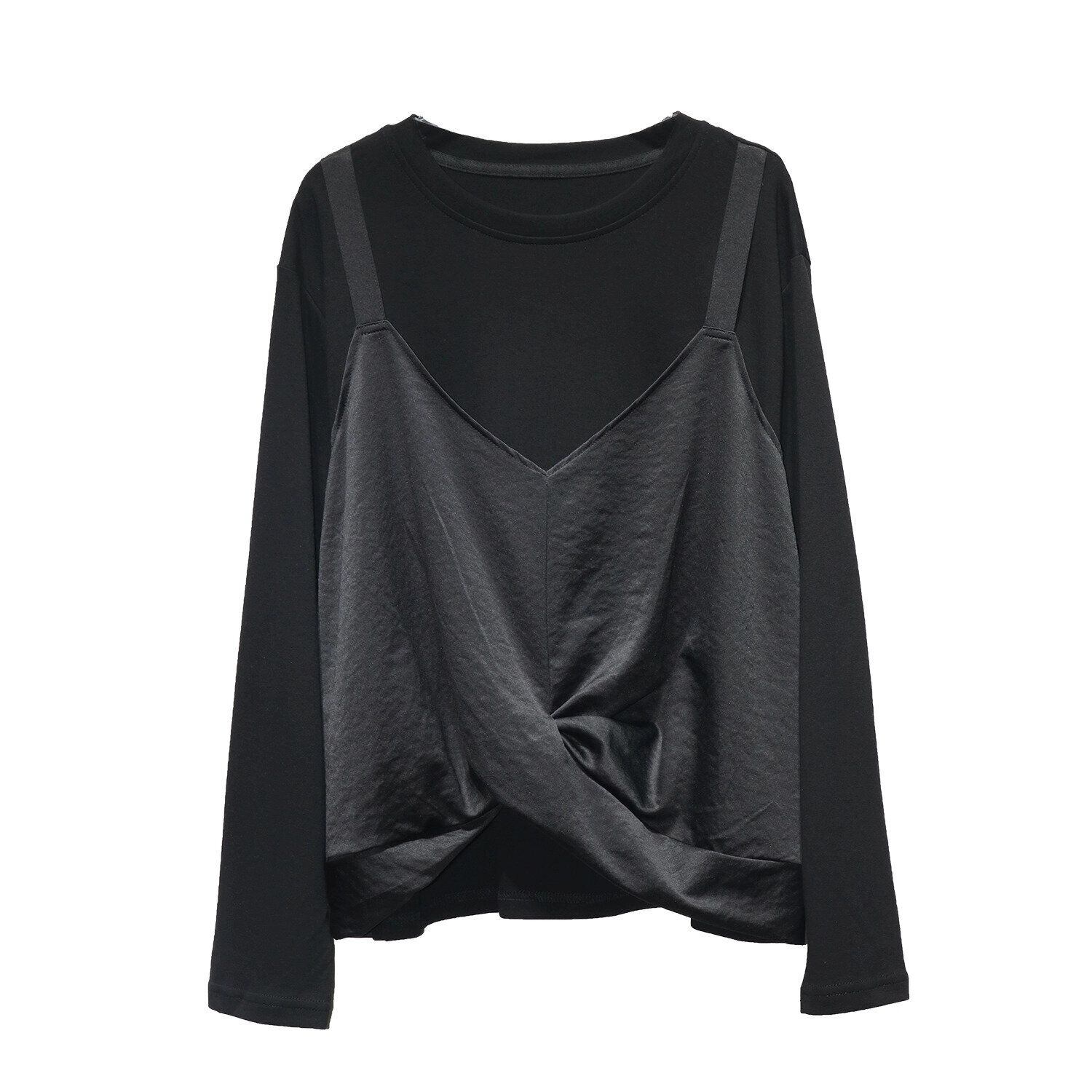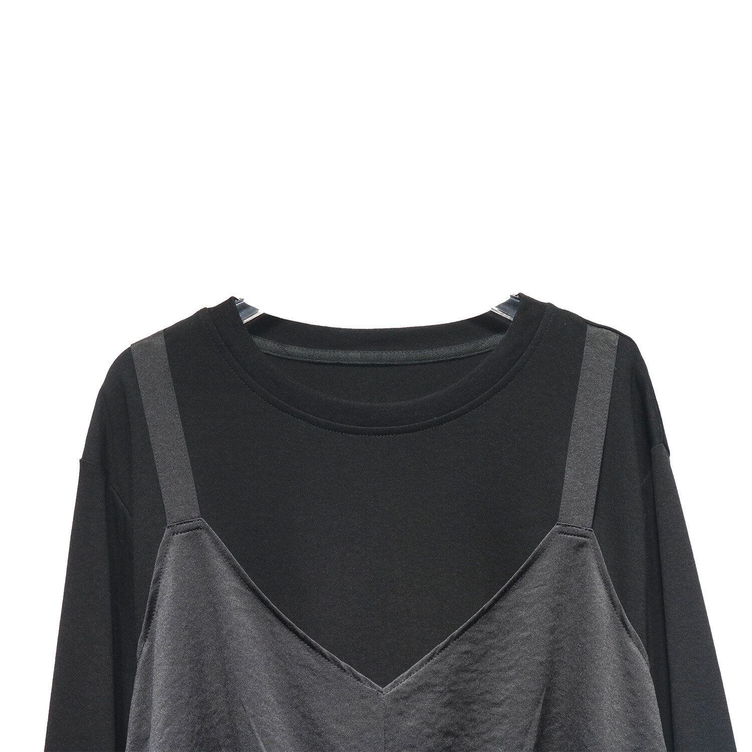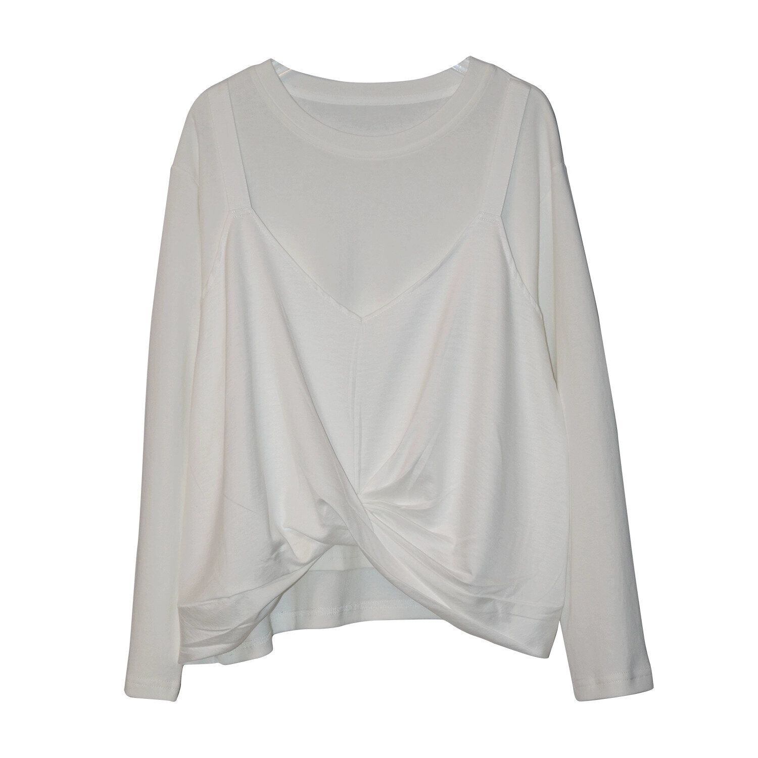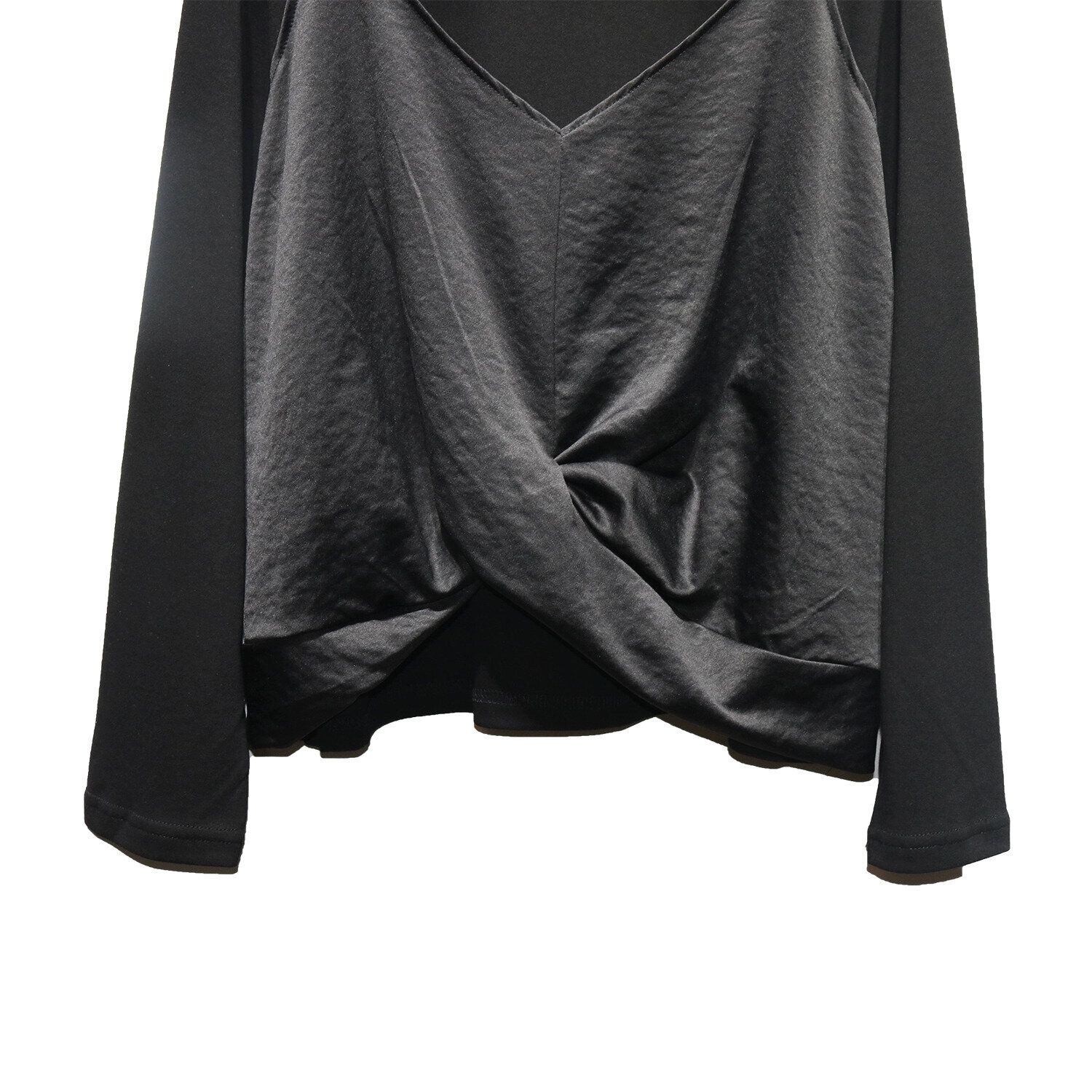 キャミソールを重ねたようなフェイクツーピースデザインがお洒落な、ラウンドネック・長袖・イレギュラーヘムのデザイントップです。フロント裾のクロスデザインがアクセントになった、同色のスティッチでコーディネートしやすいアイテムです。色は3色から選べます。