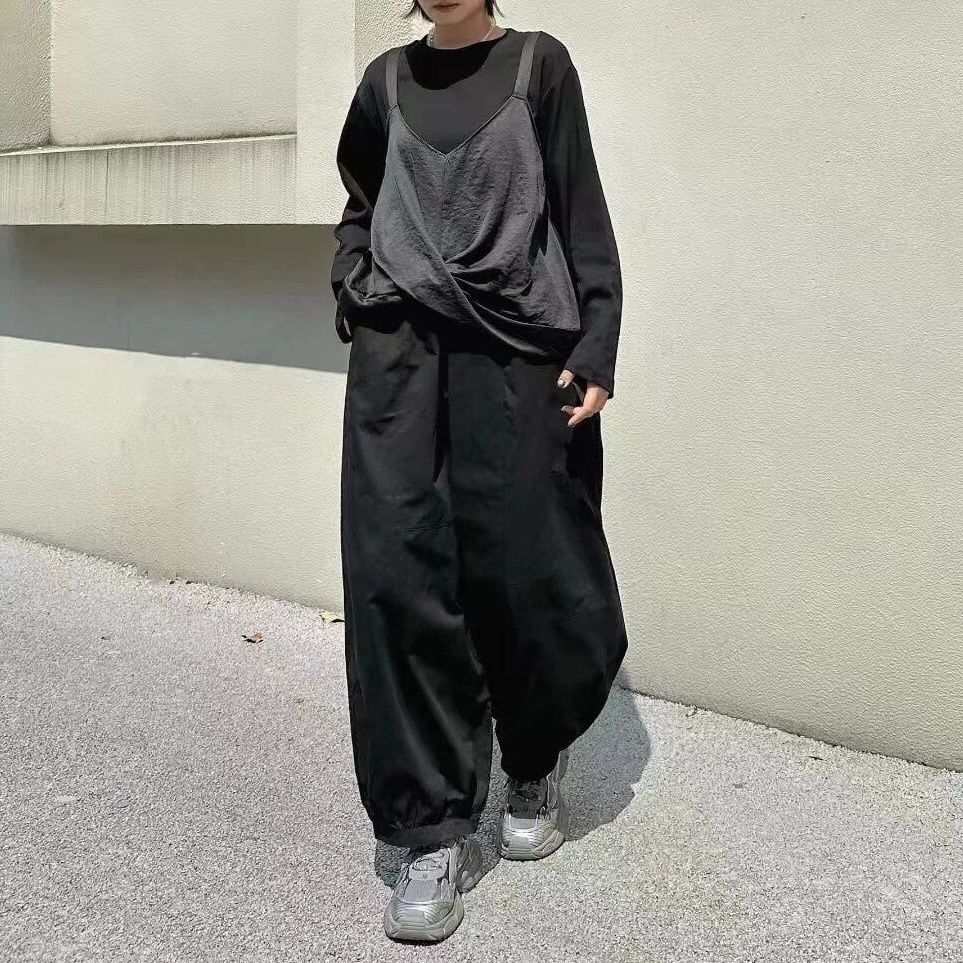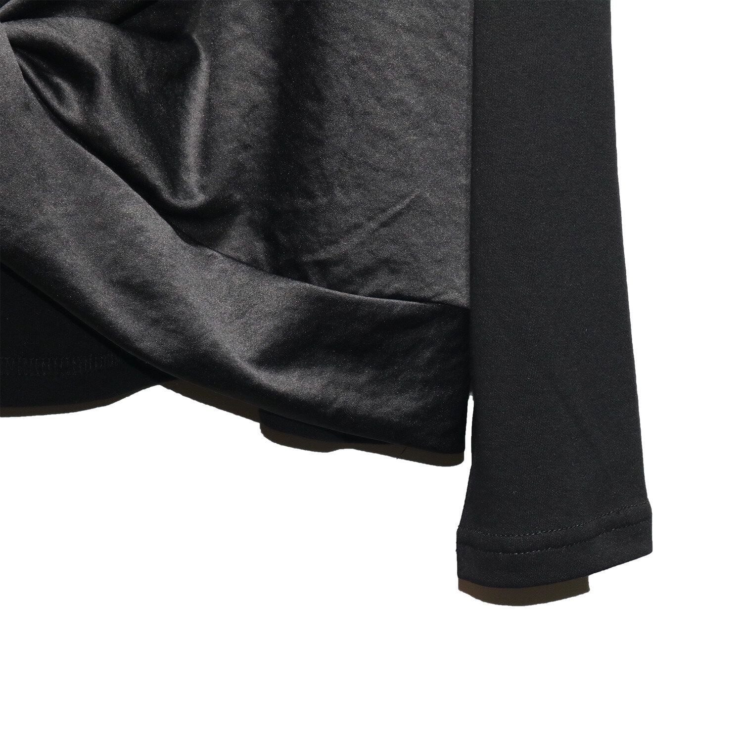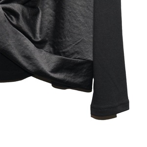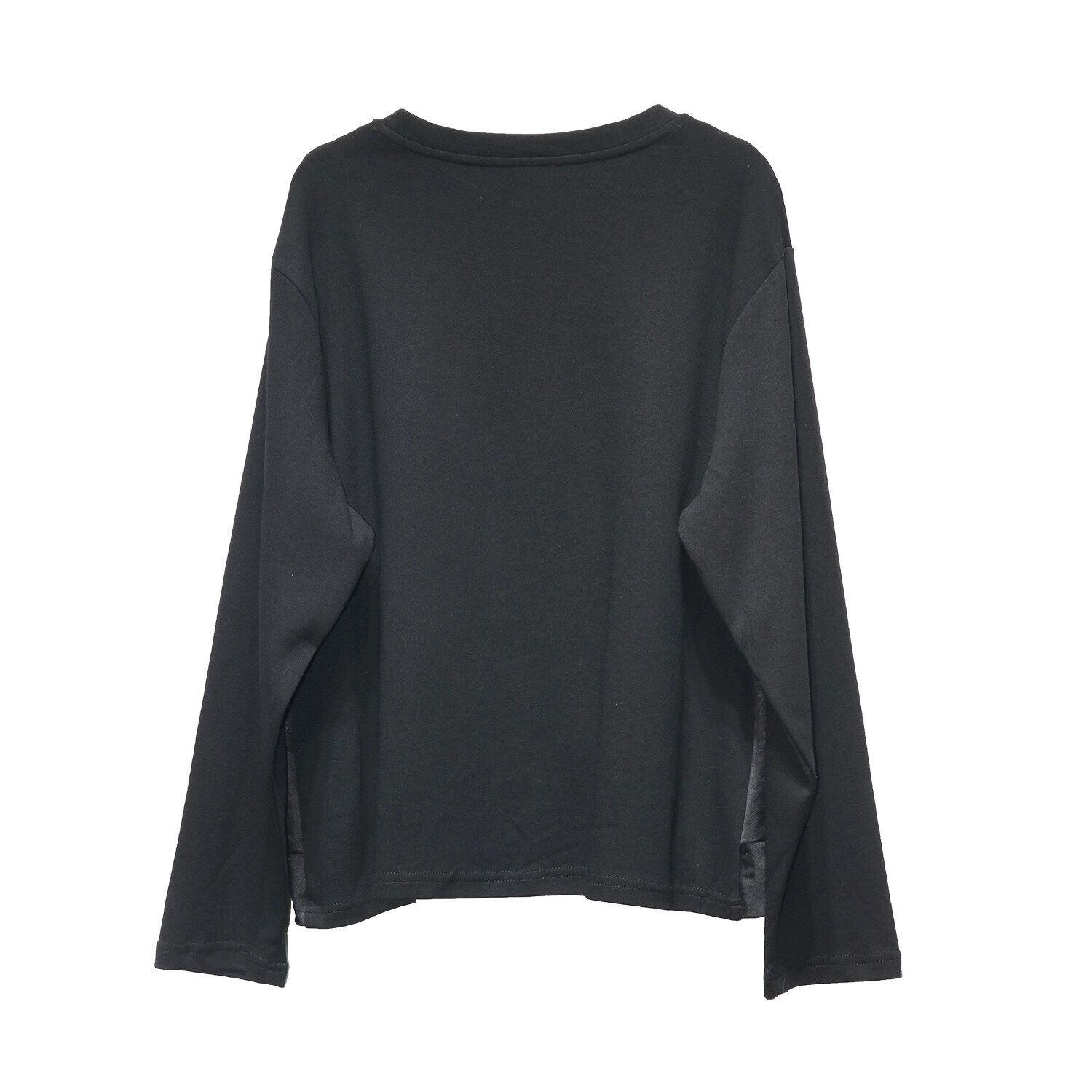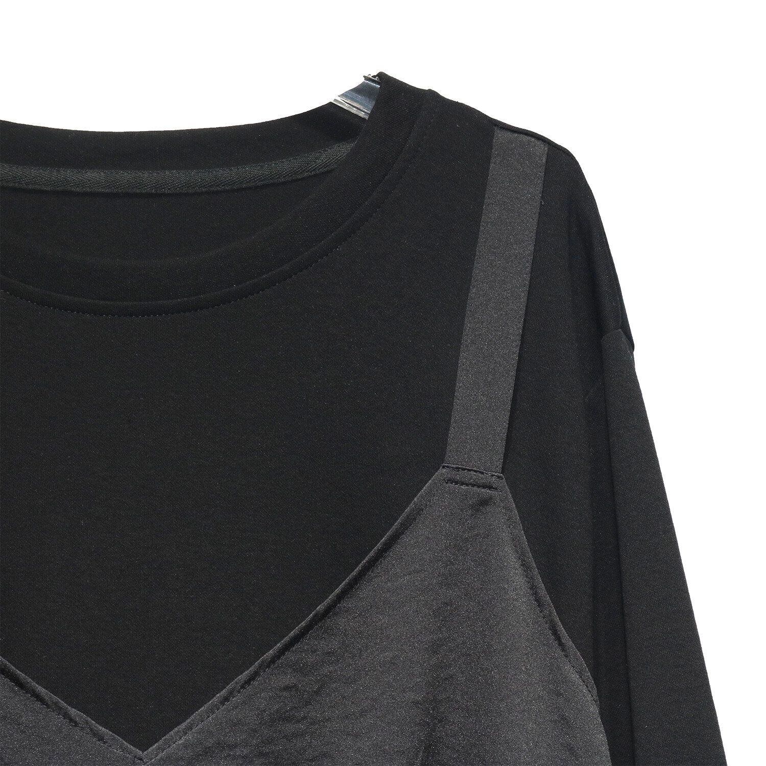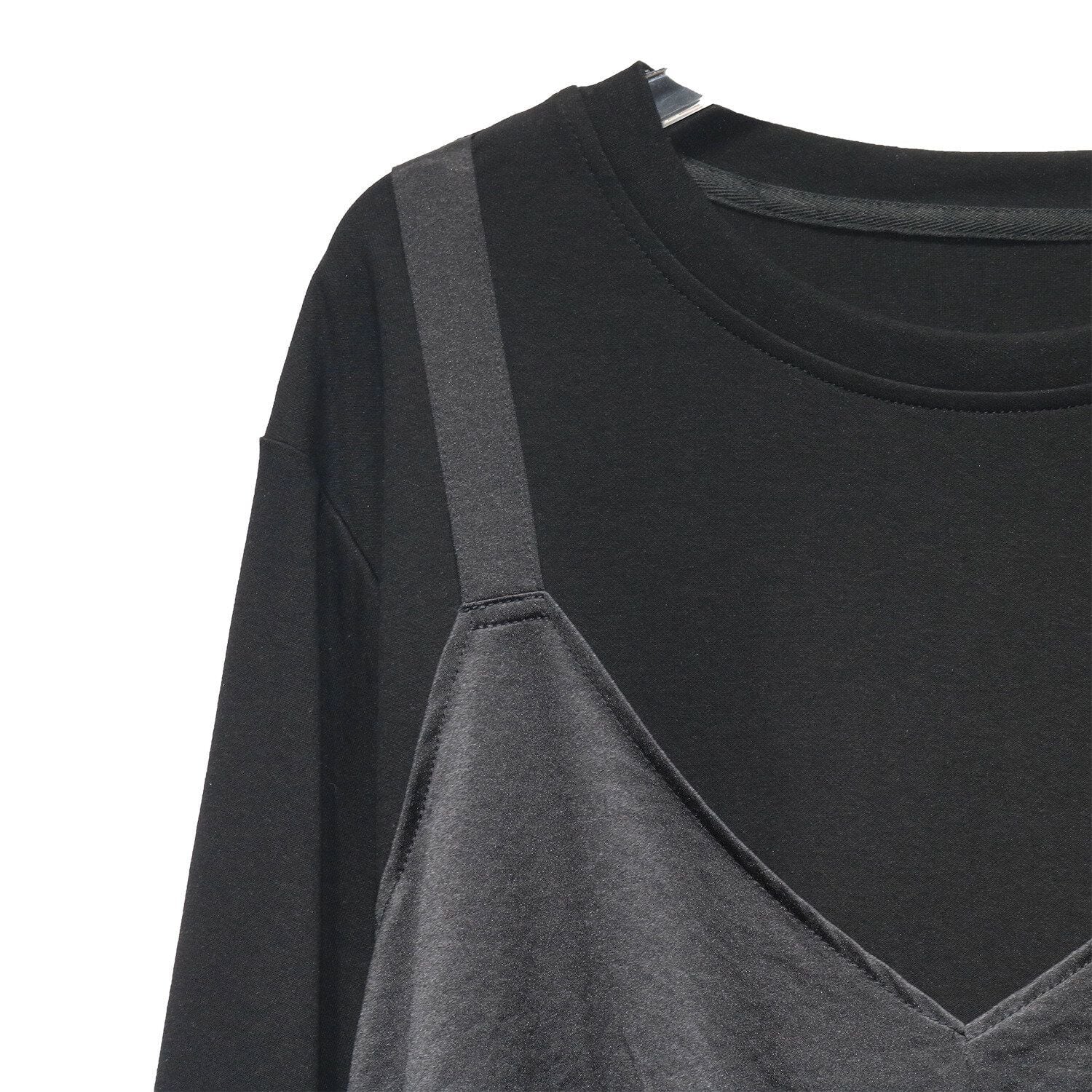 キャミソールを重ねたようなフェイクツーピースデザインがお洒落な、ラウンドネック・長袖・イレギュラーヘムのデザイントップです。フロント裾のクロスデザインがアクセントになった、同色のスティッチでコーディネートしやすいアイテムです。色は3色から選べます。
