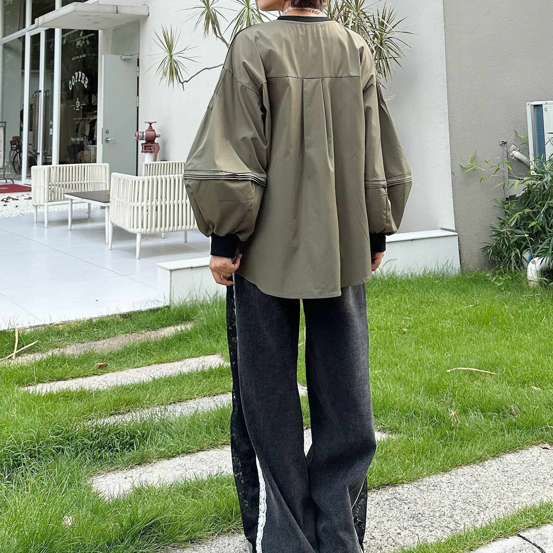 CONTRAST STITCH LANTERN SLEEVES PULLOVER TOP 2colors M-15220