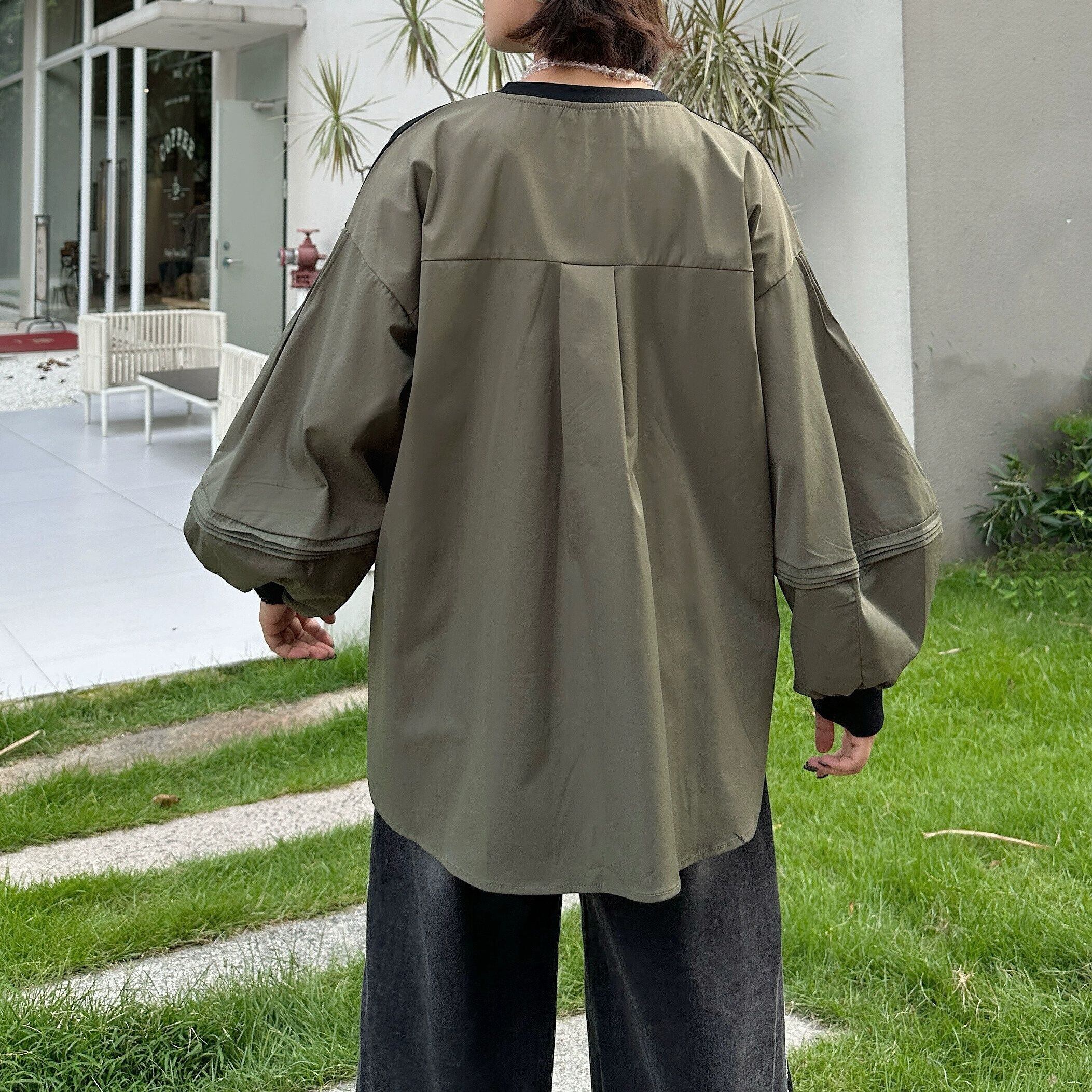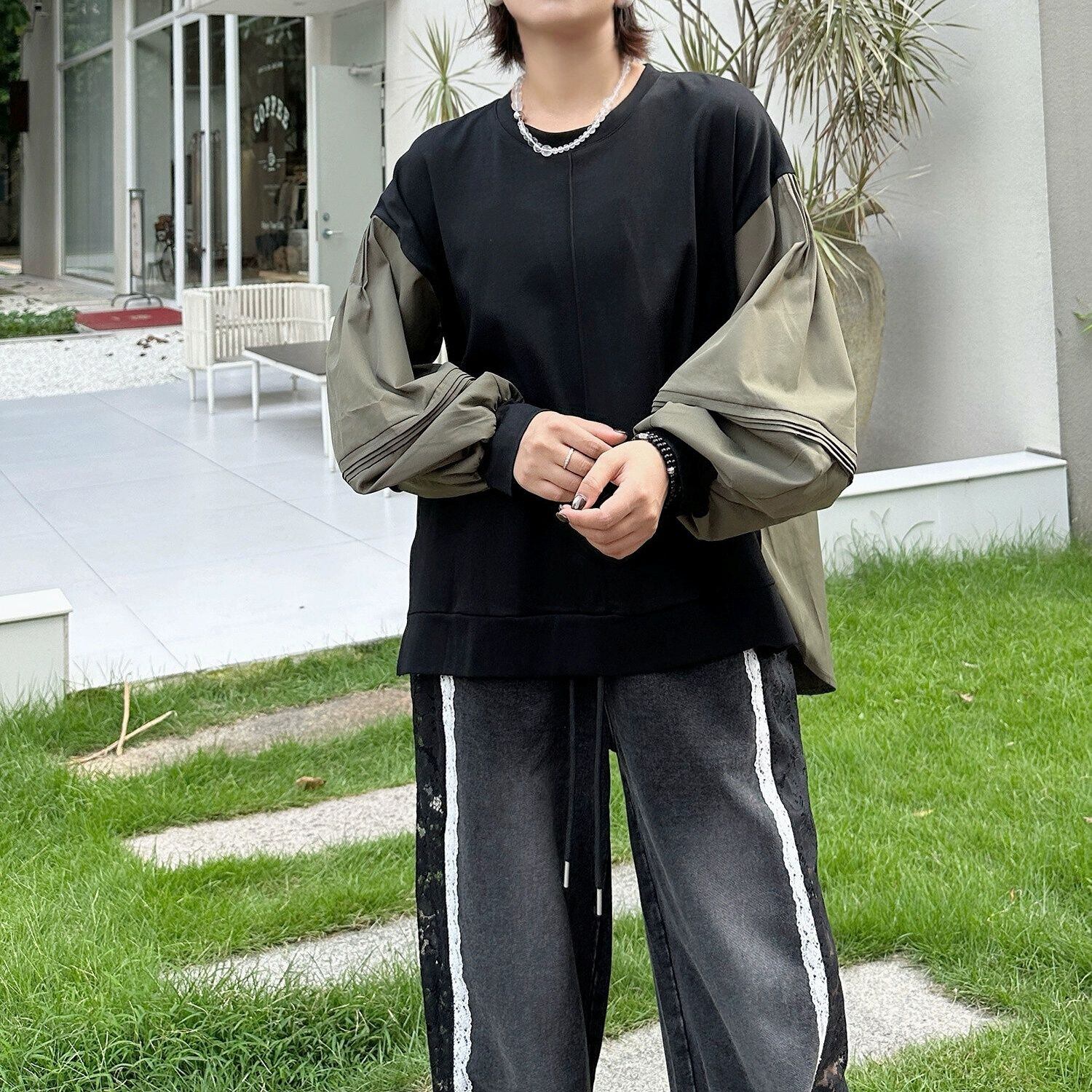 袖やバックがシャツ素材でできたコントラストスティッチデザインが目を惹く、ラウンドネック・ハイローヘムのプルオーバートップです。プリーツ加工で作られた、ランタンのように大きく膨らんだ袖が特徴的です。フロントとバックで印象の異なる、コーディネートのアクセントになるアイテムです。ブラックとグリーンの2色から選べます。