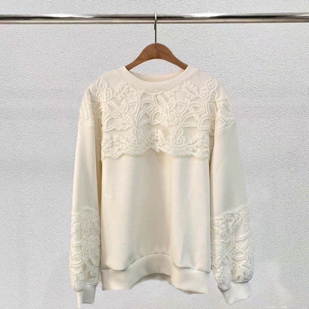 美しい刺繍レースの飾りが目を惹く、ラウンドネックのスウェットシャツです。ゆったりとしたシルエットで着心地が良い、上品でガーリーな印象のカジュアルアイテムです。色は3色から選べます。